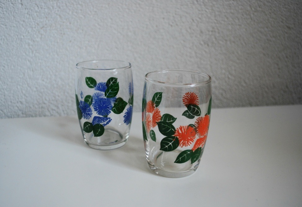 2 Kleine glaasjes met gekleurde bloemen, 1 glaasje heeft oranje bloemen en de andere blauwe. Hoogte is 8 cm.