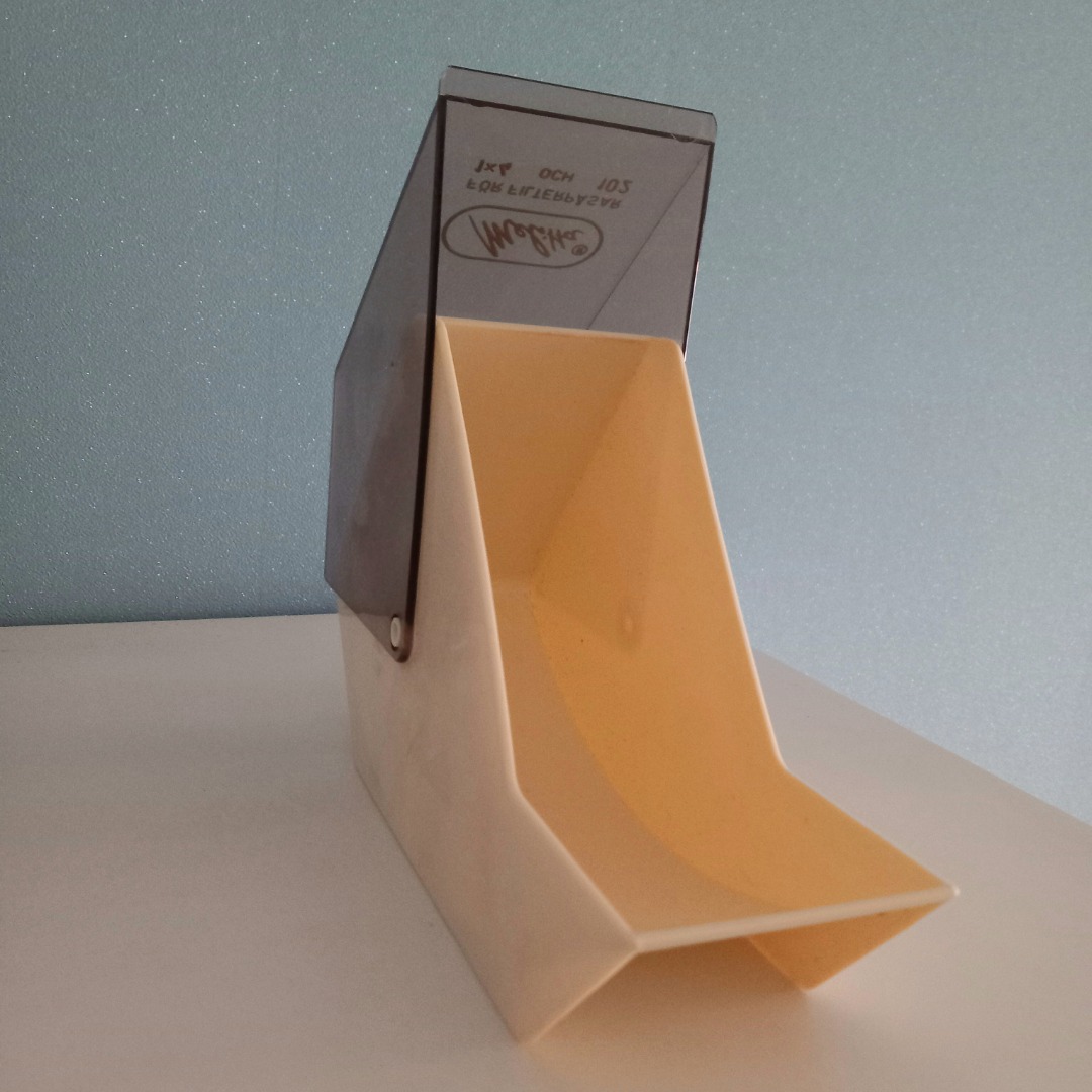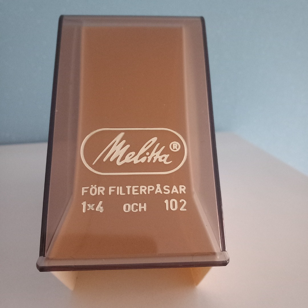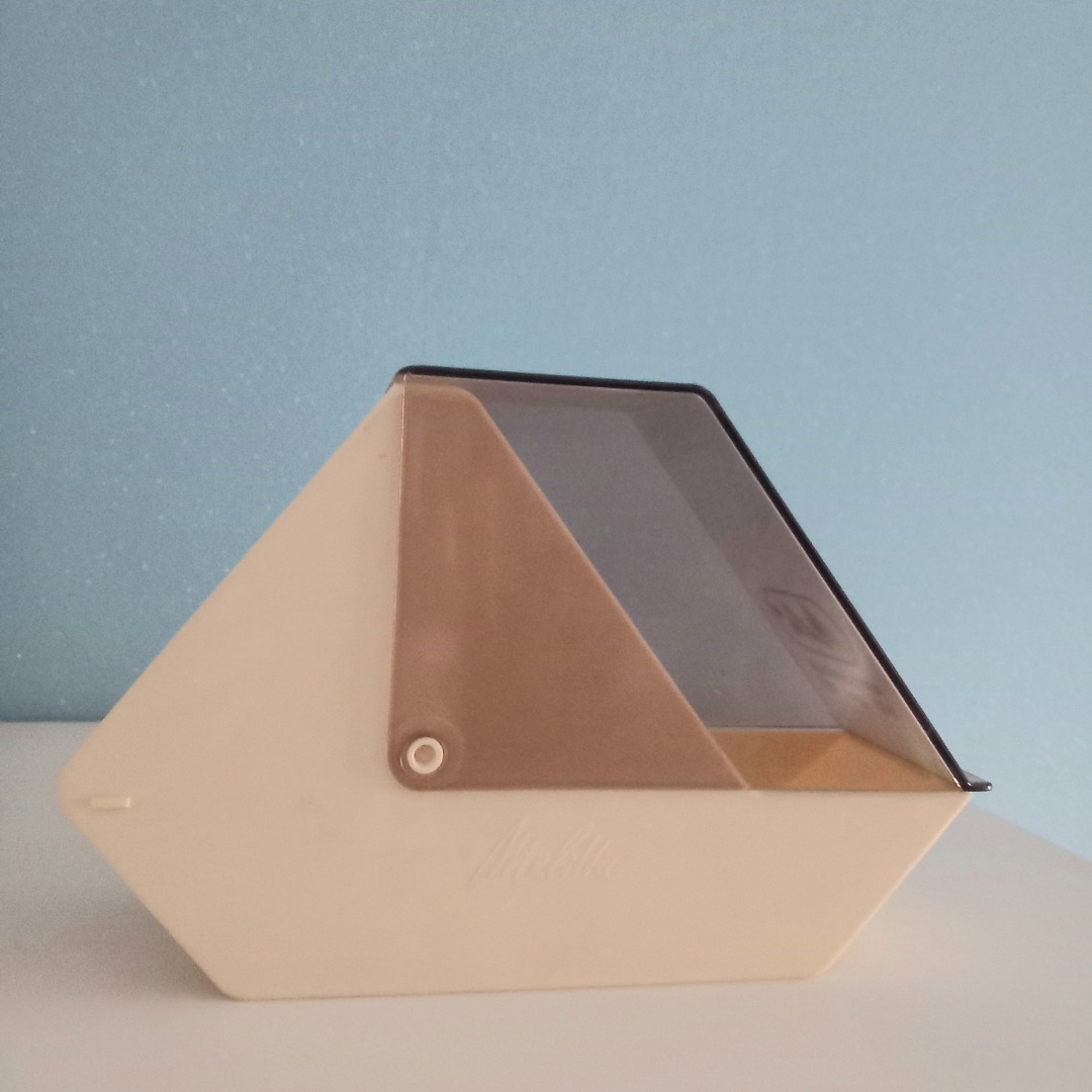 Koffiefilterhouder nummer 4 van plastic. Deze is van Melitta en komt uit Zweden. Het heeft een crème kleur en boven is deze van doorzichtig plastic.