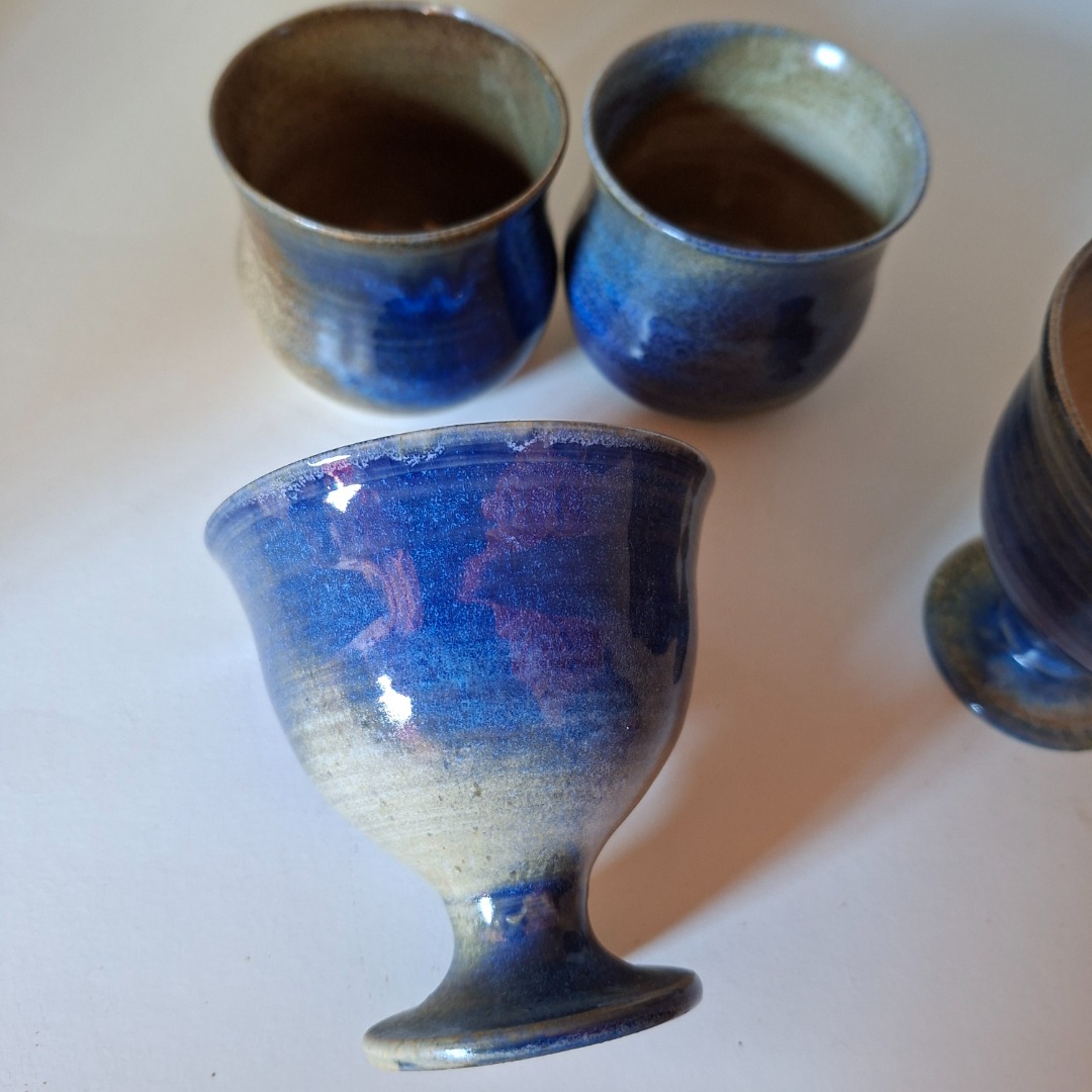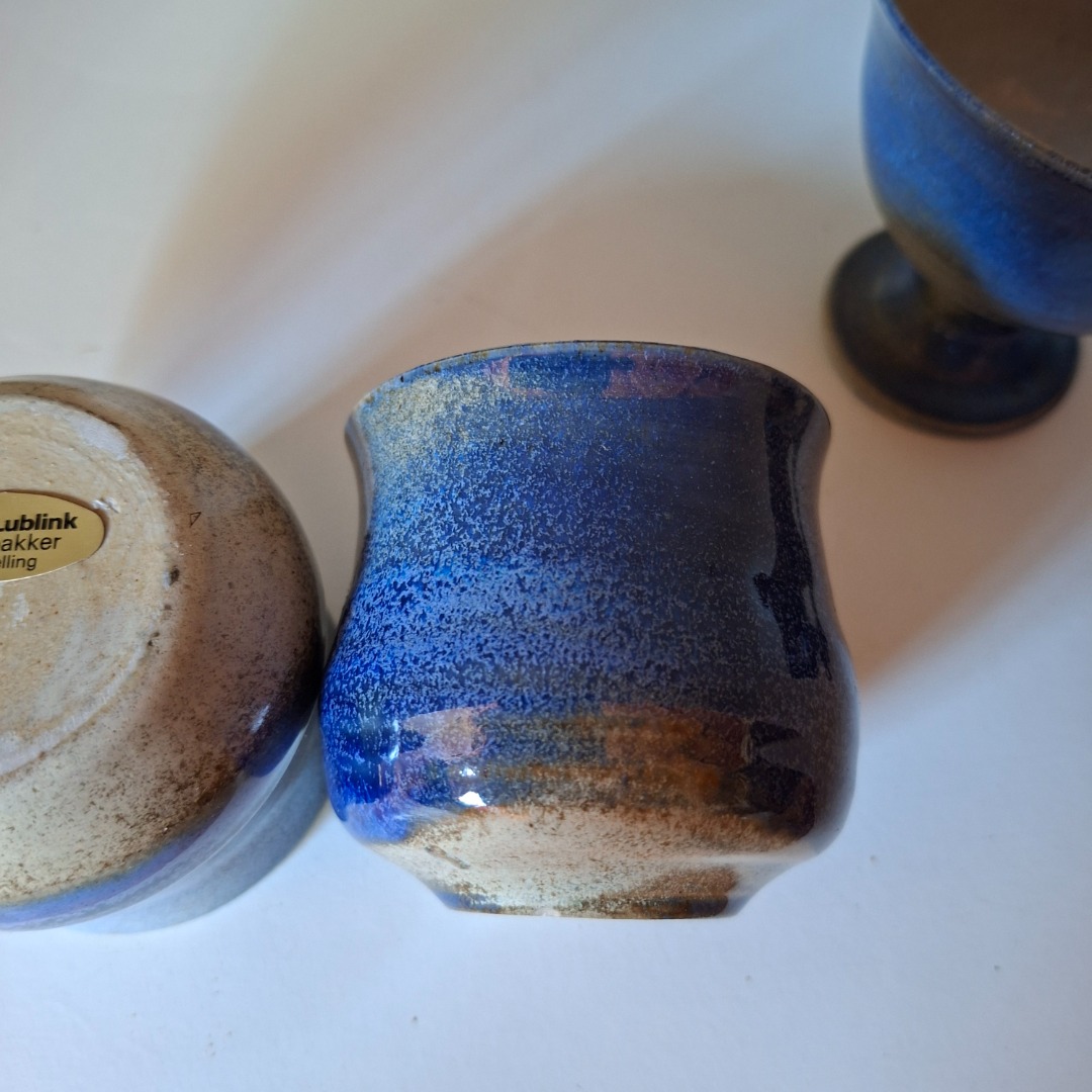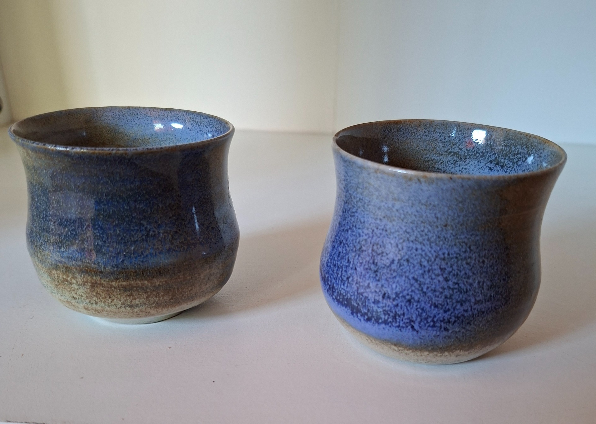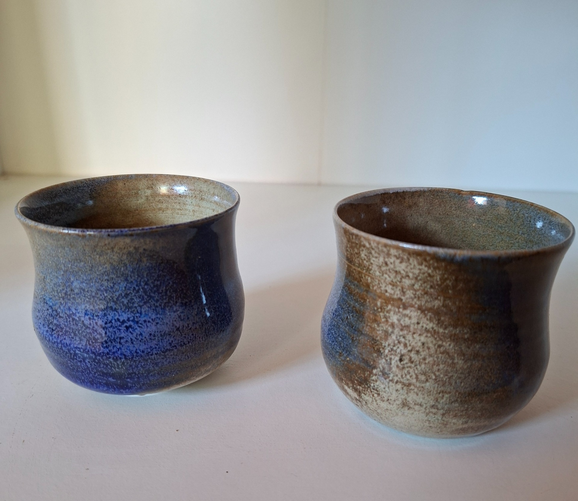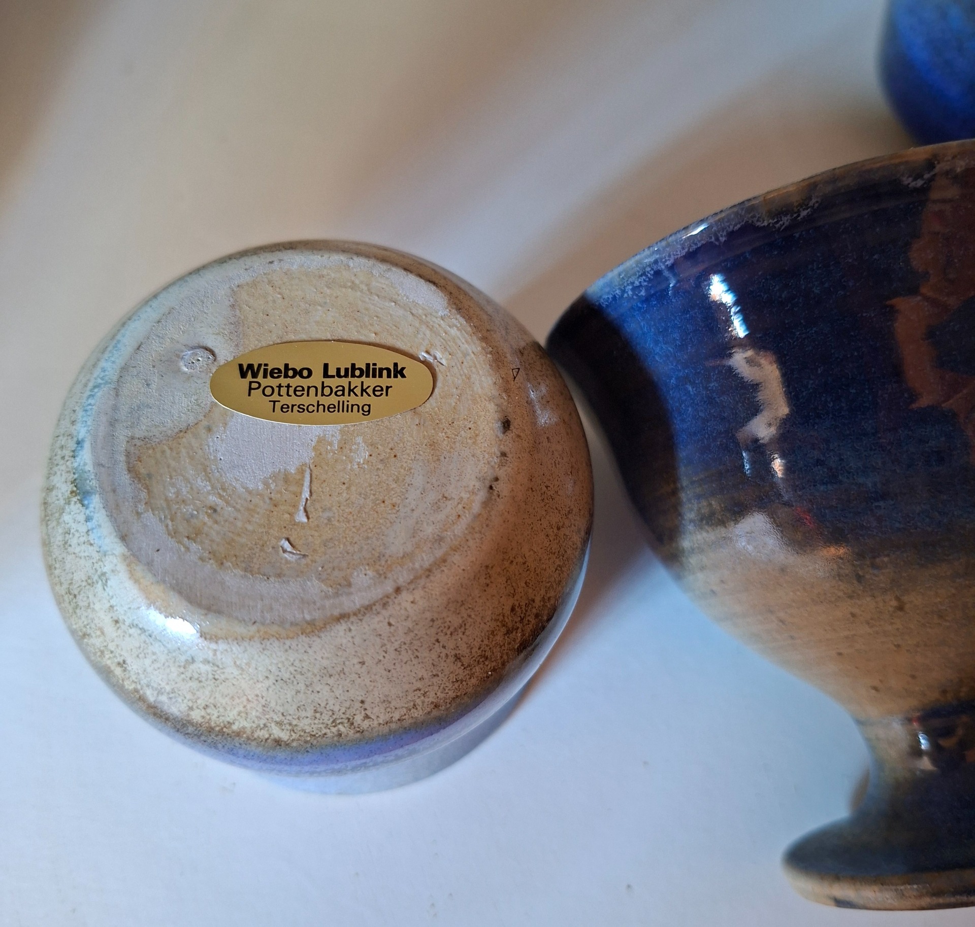 4 Handgemaakte mokken in een mooie kleurstelling van bruin en blauw. Ze zijn gemaakt door Wiebo Lublink uit Terschelling. 2 mokken zijn op voet en zijn 8,5 cm hoog en de andere zijn 6,5 cm hoog.