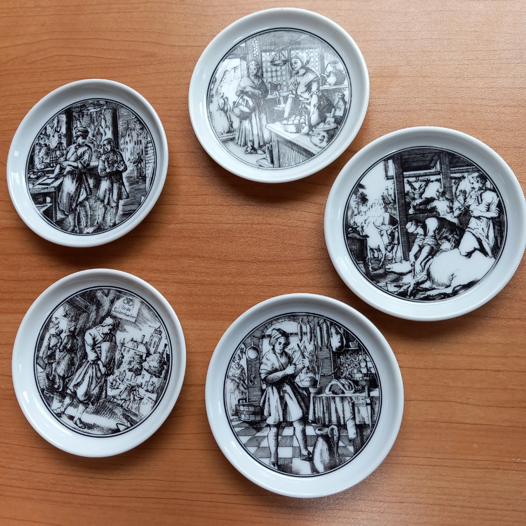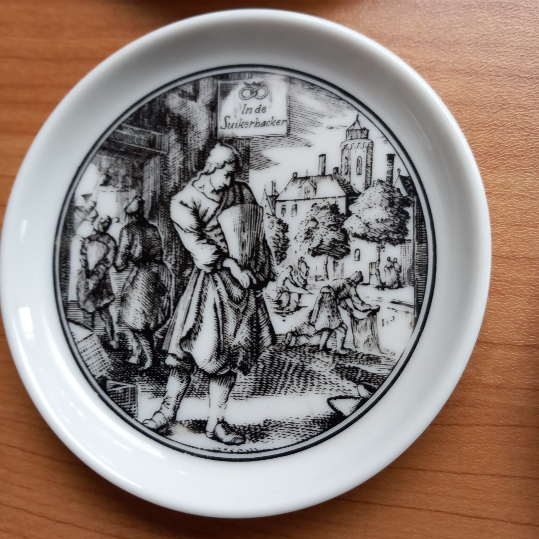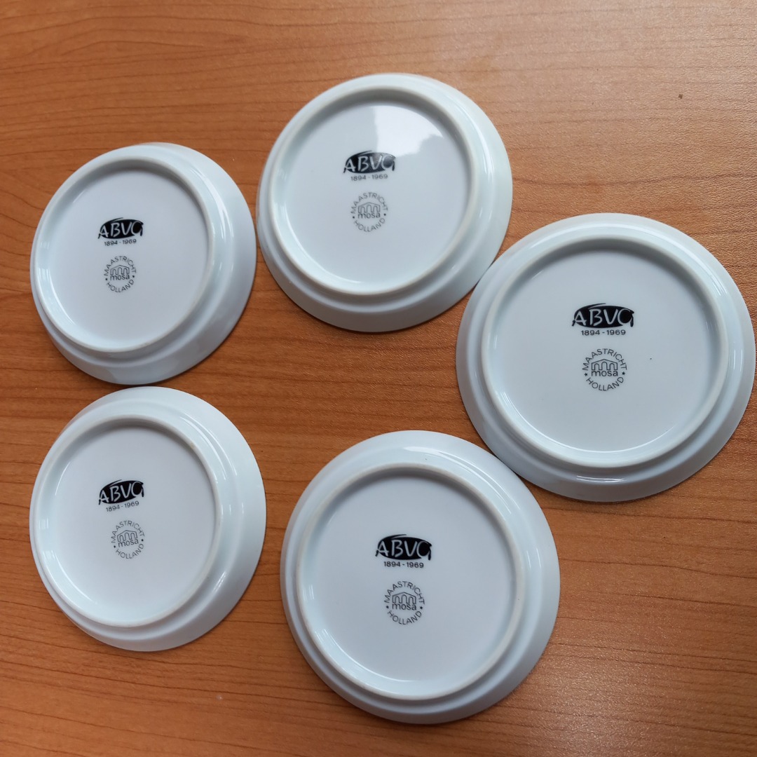 5 Onderzetters of petit fours van Mosa Maastricht met oude afbeeldingen. De doorsnee is 10 cm. Gemaakt voor het 75 jarig bestaan van Abvo in 1969.
