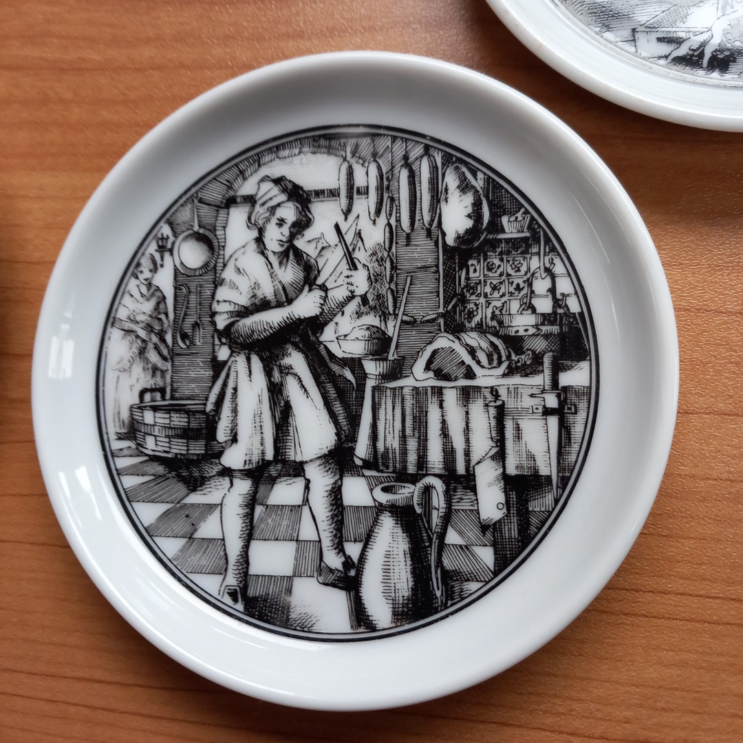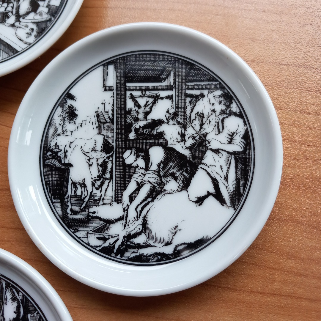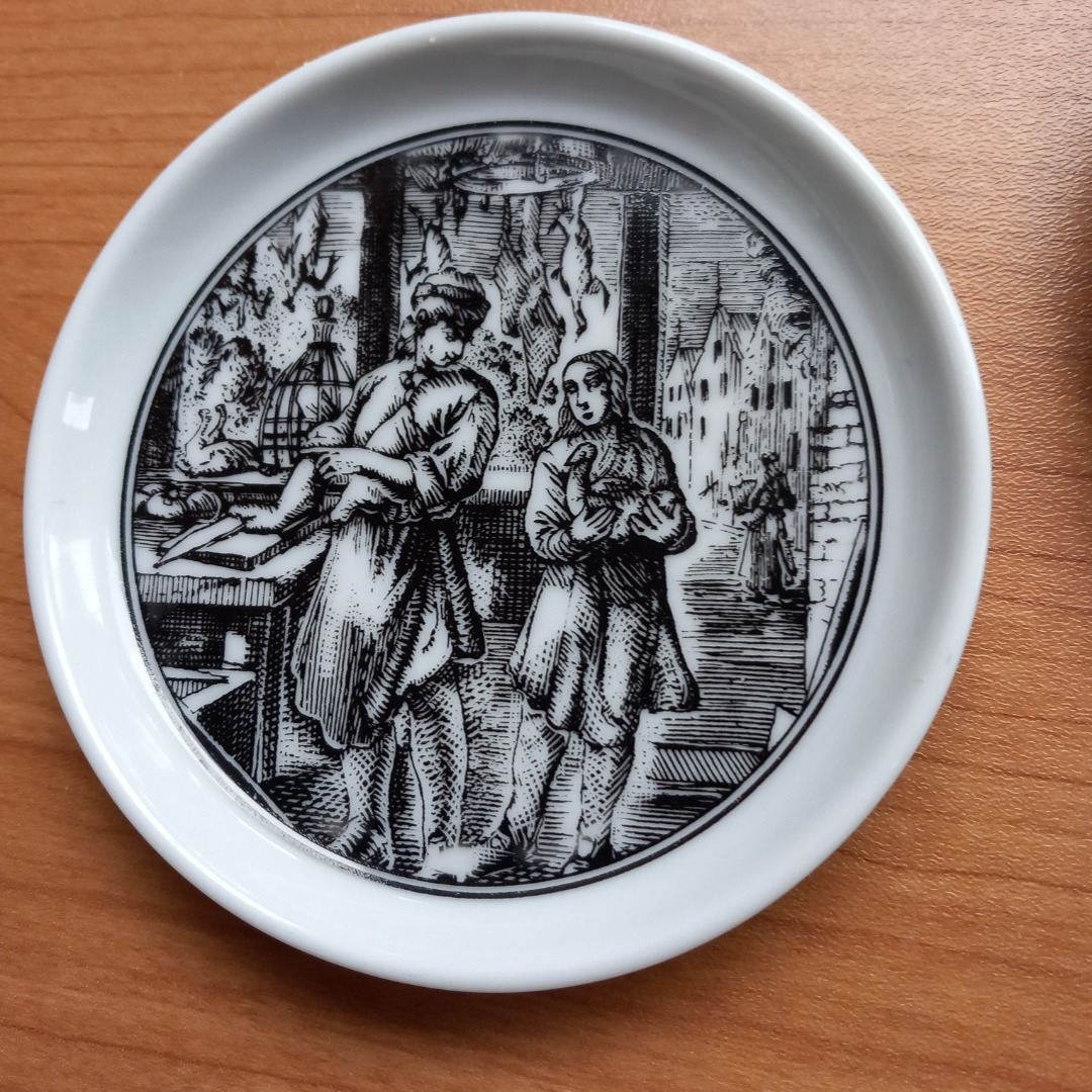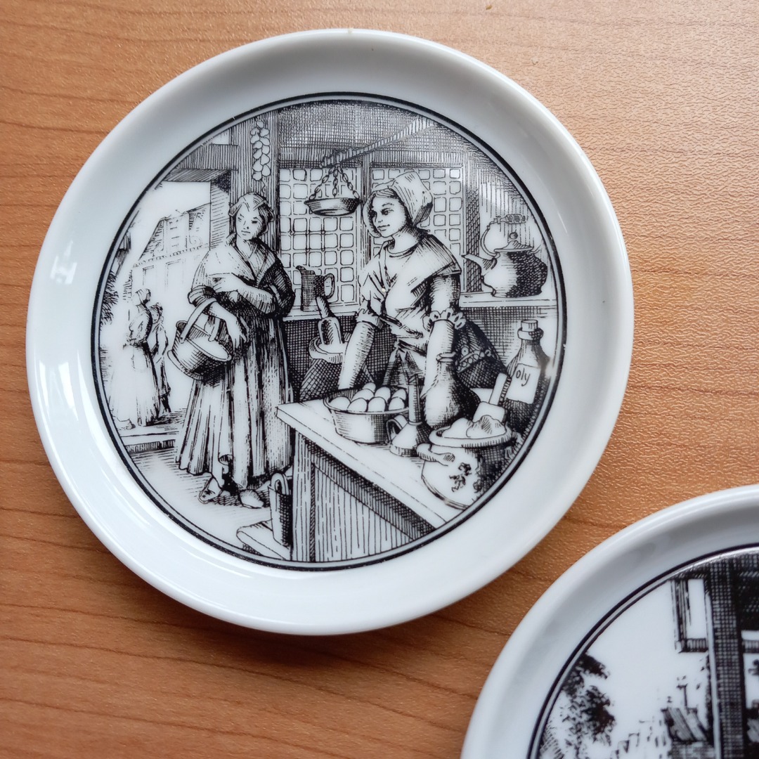 5 Onderzetters of petit fours van Mosa Maastricht met oude afbeeldingen. De doorsnee is 10 cm. Gemaakt voor het 75 jarig bestaan van Abvo in 1969.