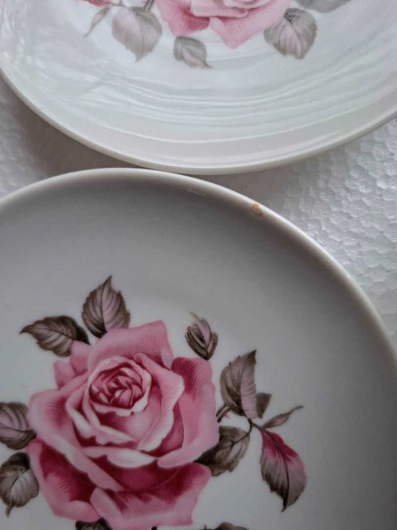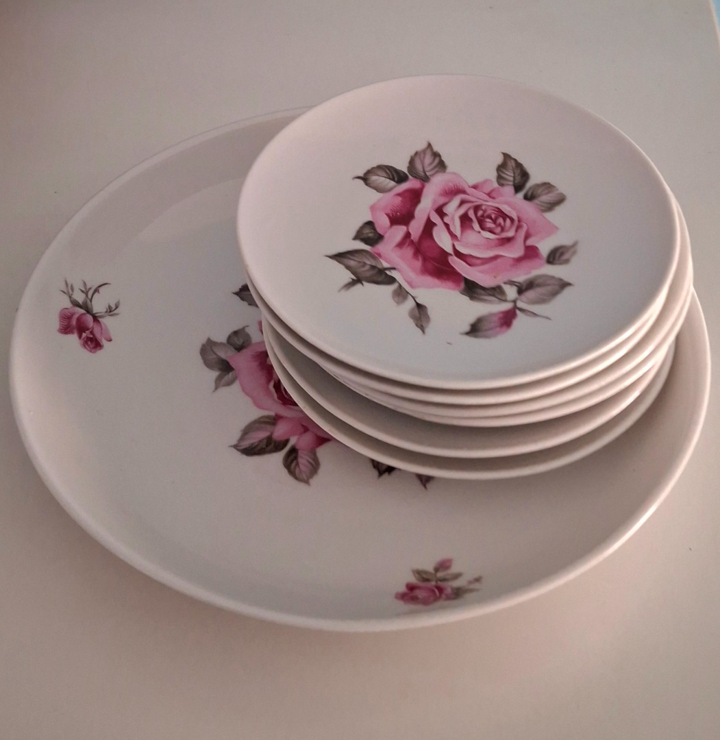 Witte bord van 19,5 cm doorsnee met 6 kleinere bordjes met een doorsnee van 12 cm. Ze hebben allemaal een afbeelding met een roze roos. Het is van Bavaria. 1 kleine schotel heeft een chipje eraf.
