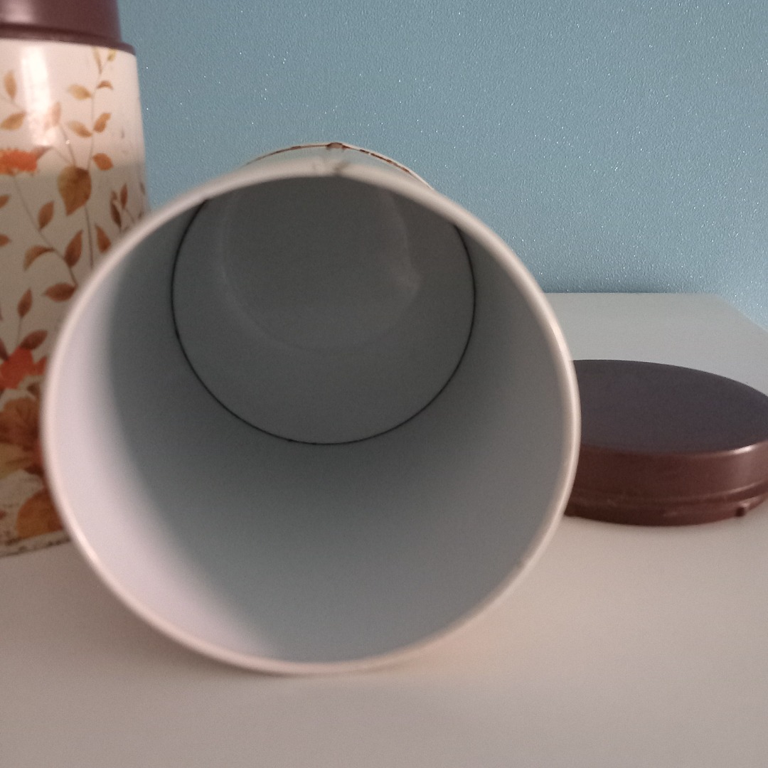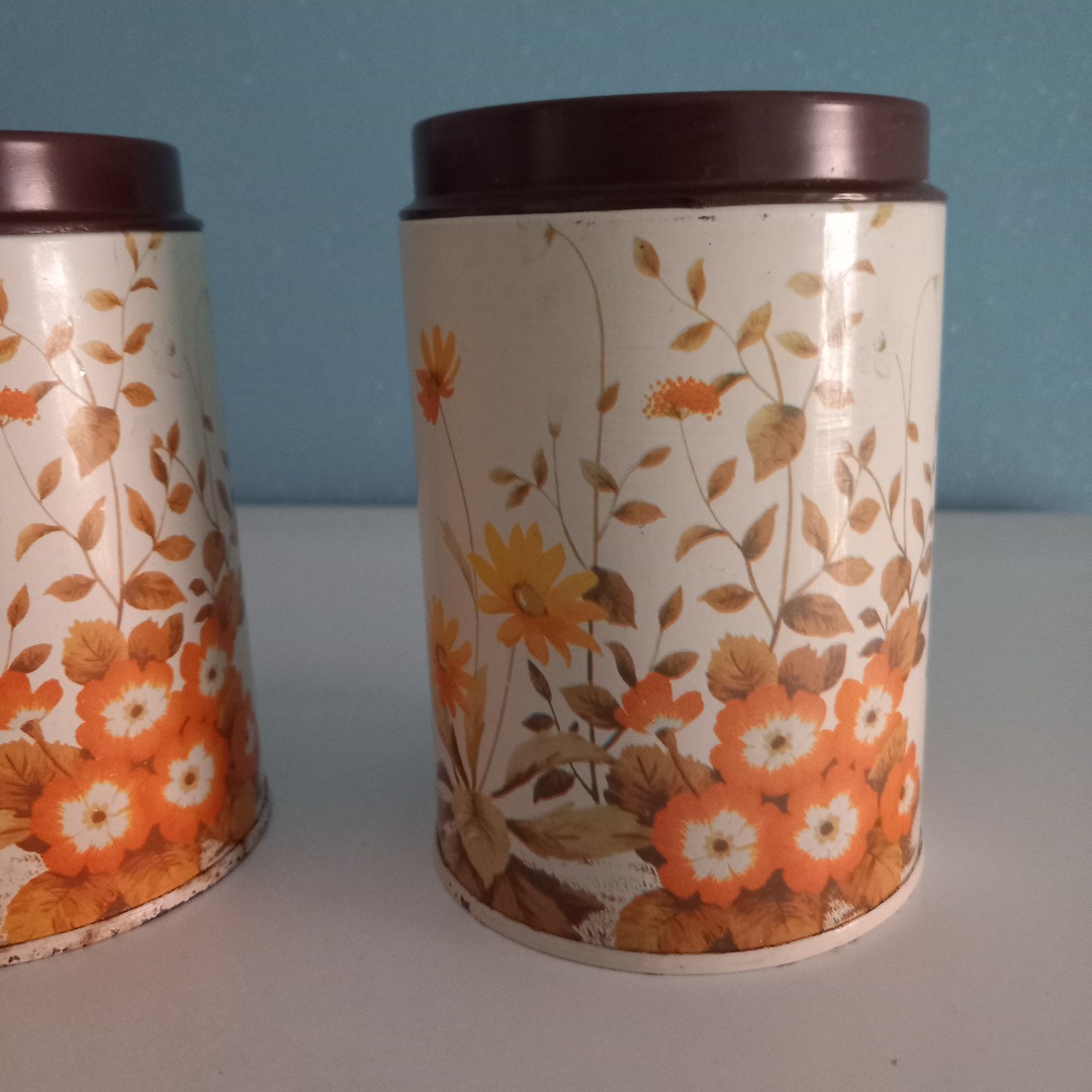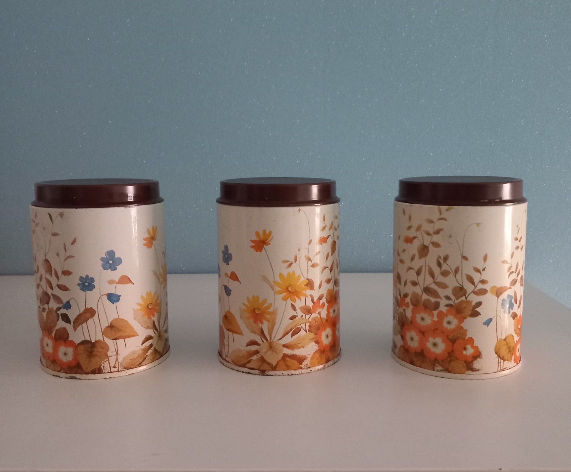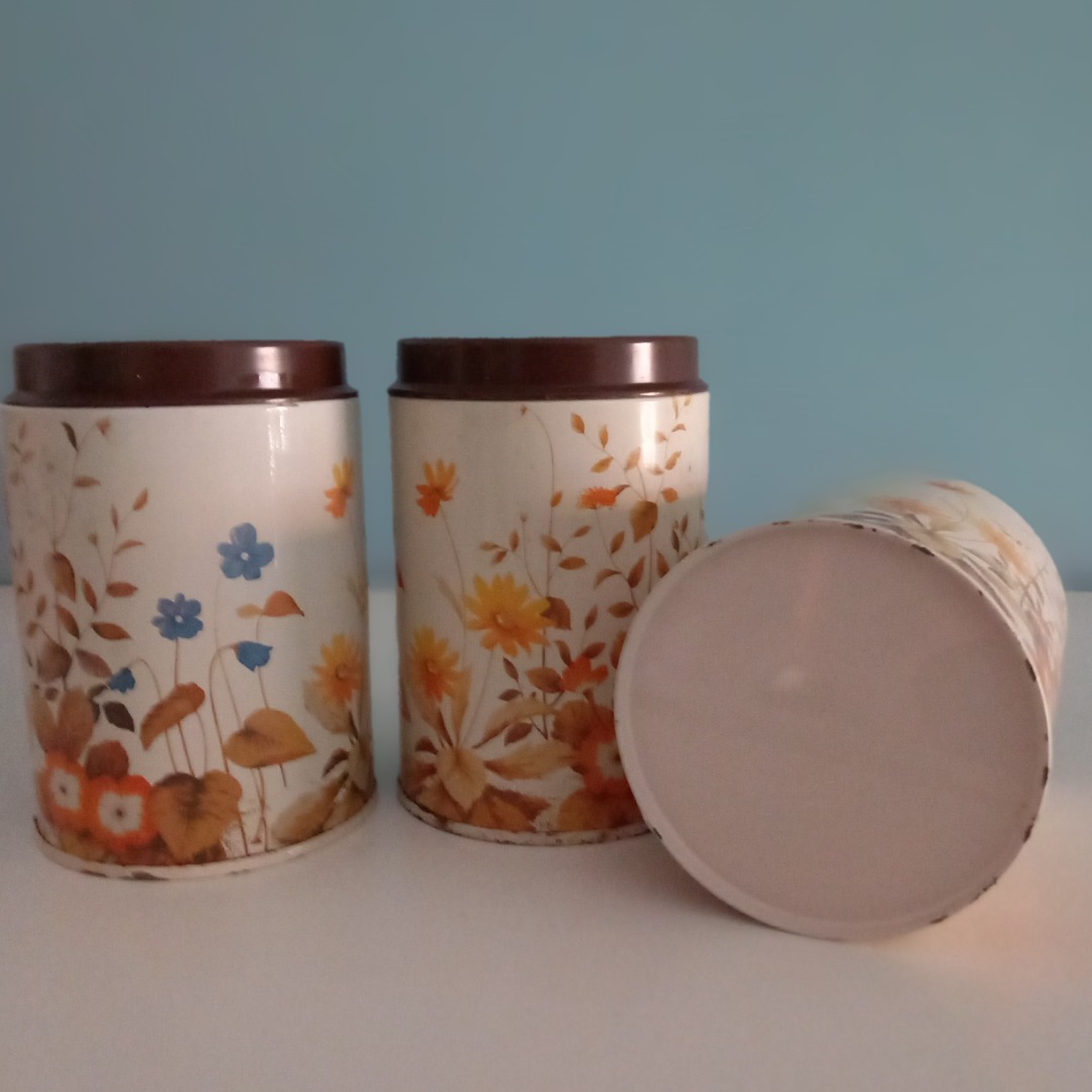 3 Blikjes met hetzelfde bloemendecor en bruine deksel. Ze zijn 11 cm hoog en de doorsnee is 7,5 cm.
