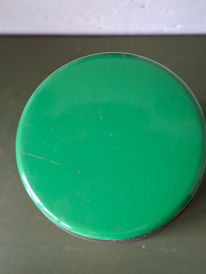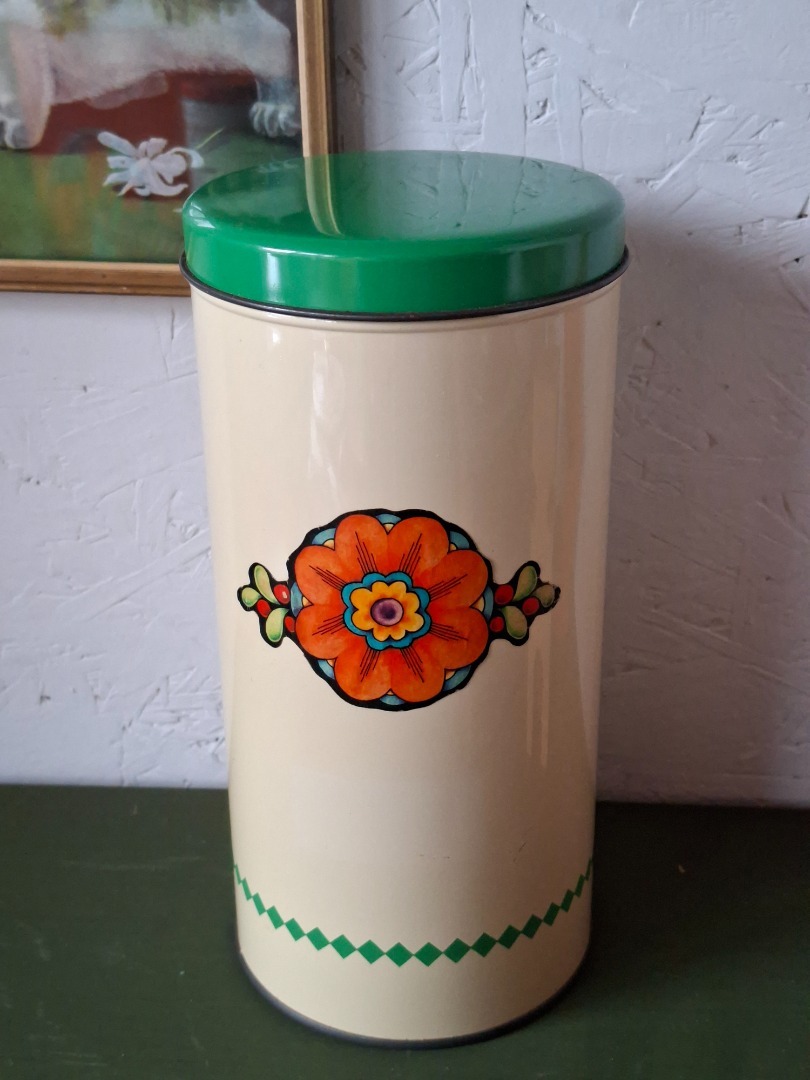 Beschuitbus in een crème kleur met groene deksel. Aan de voorkant zit een sticker.