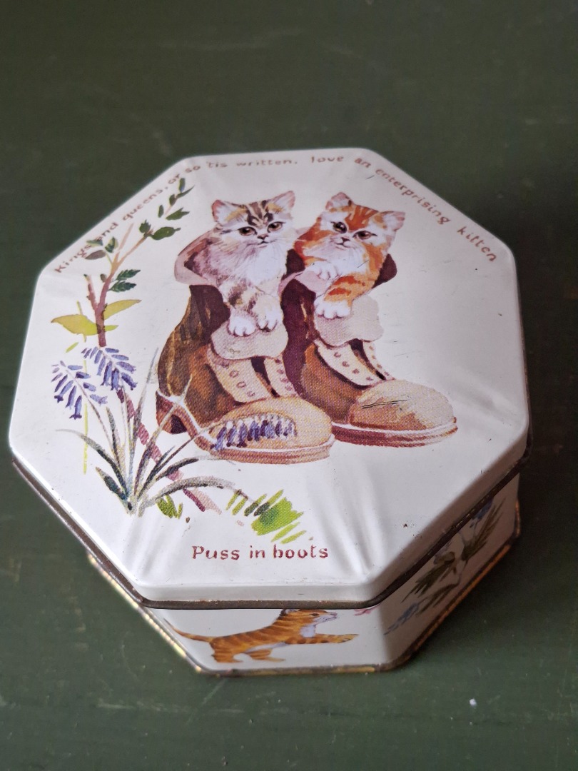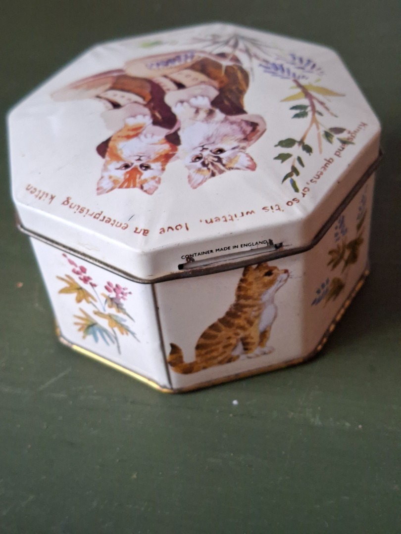 8 hoekig crèmekleurig blikje met afbeeldingen van poesjes en bloemen. De doorsnee is 10 cm en de hoogte is 5,5 cm.