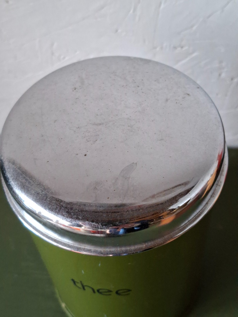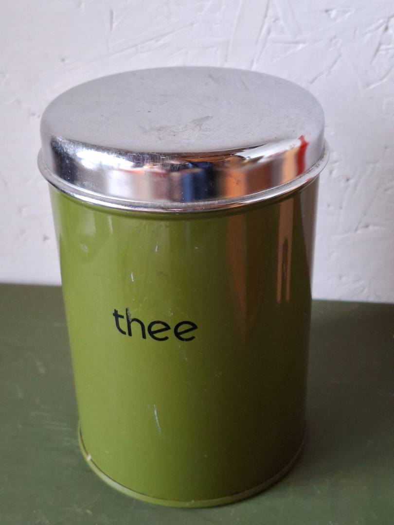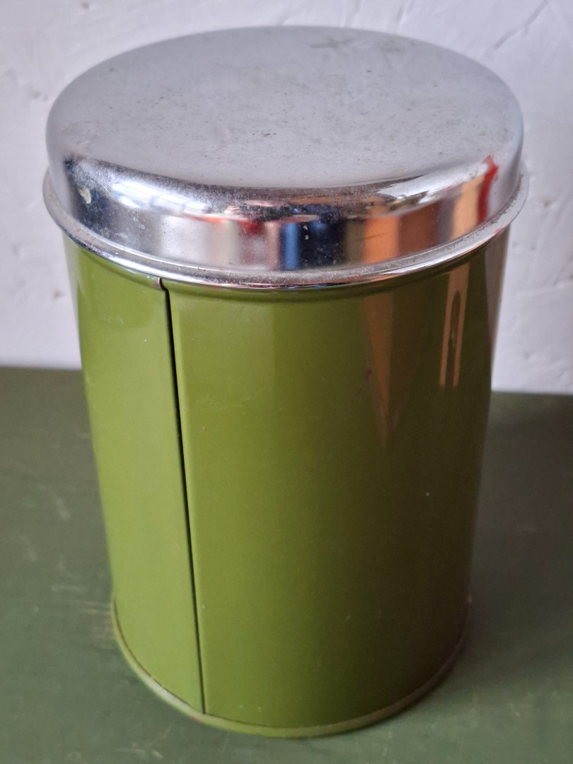 Donkergroen blik met zilverkleurige deksel voor thee. De hoogte is 16 cm.