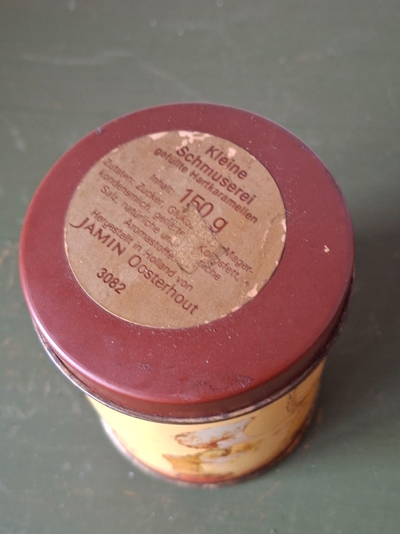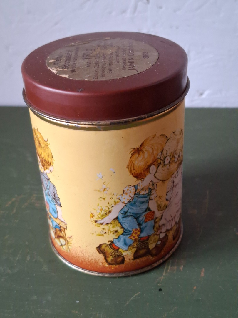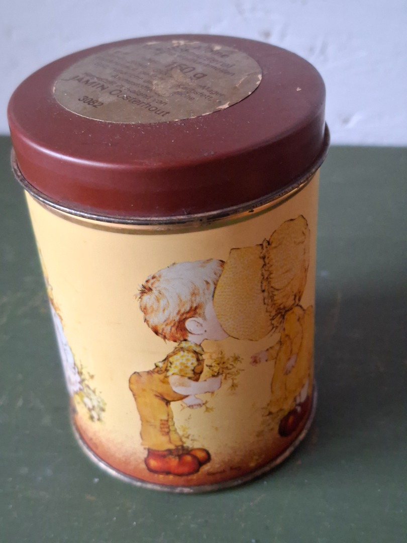 Blik van Jamin in bruintinten en met een soort Holly Hobbie afbeelding.  De hoogte is 10 cm.