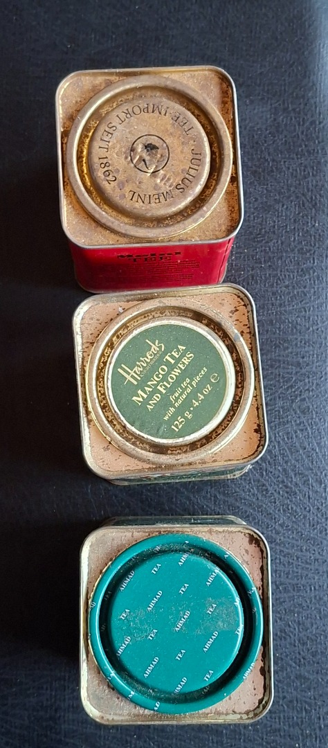 3 Theeblikken van Harrod's, Ahmad tea en Meinl Tee. De hoogte is 9 cm.