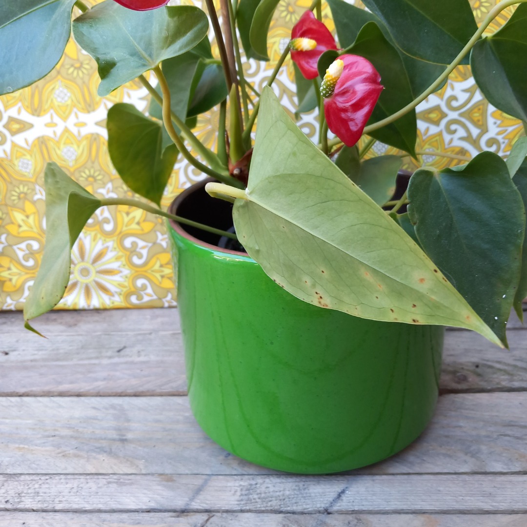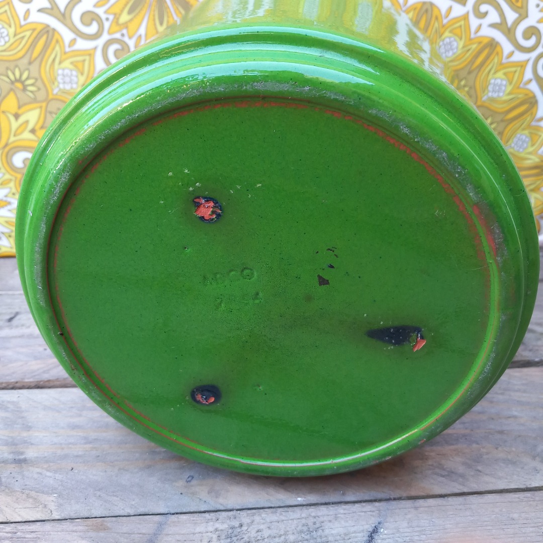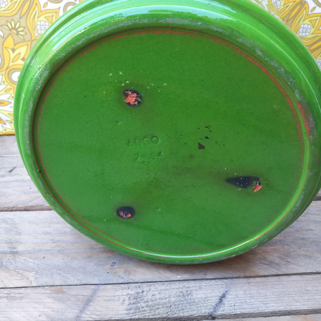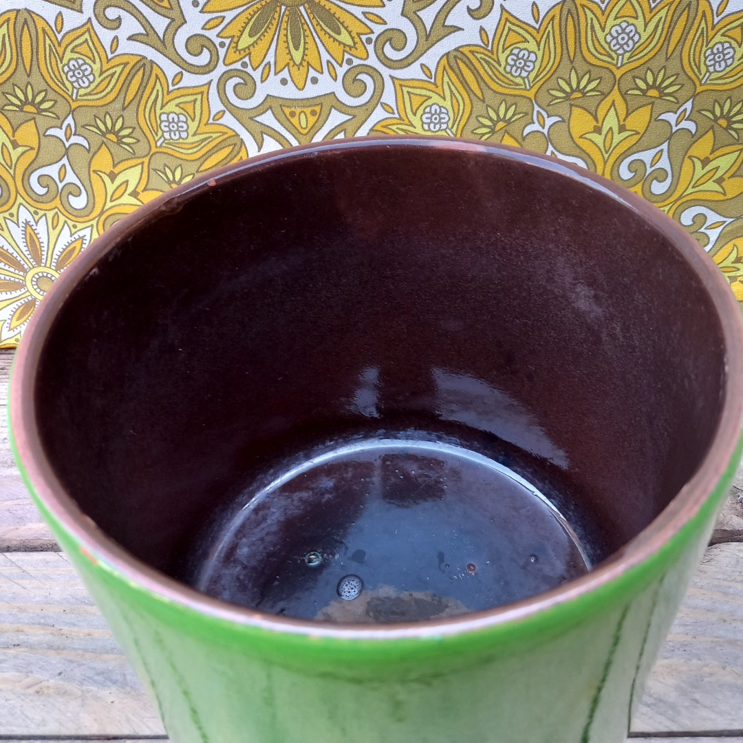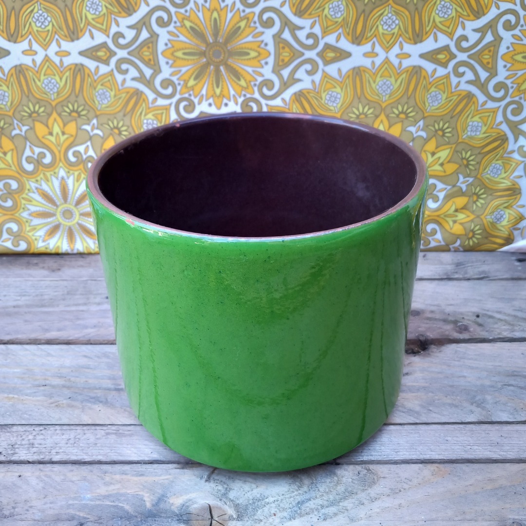Groene bloempot met een doorsnee van 16,5 cm en de hoogte is 14,5 cm. De bloempot heeft een bruine binnenkant. Aan de bovenkant zijn er een paar minichipjes af.