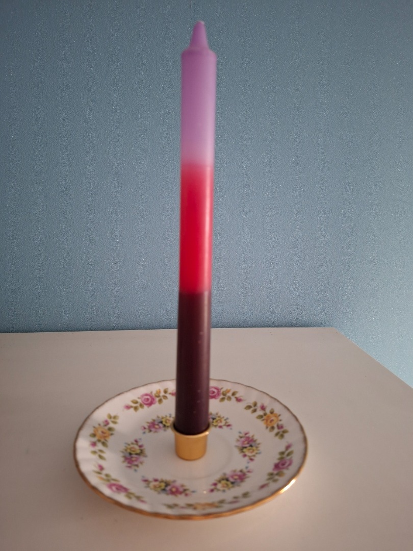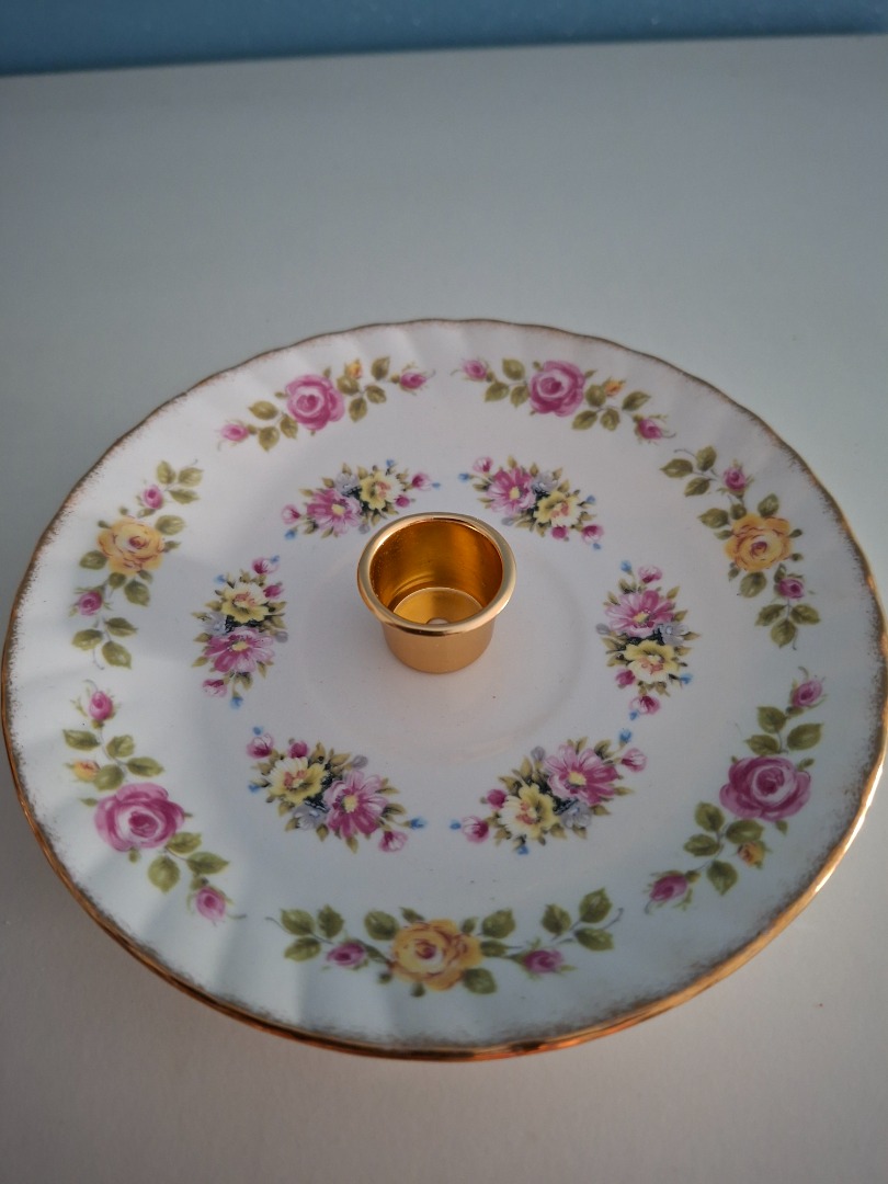 Schotel van Elizabethan uit Engeland met houder voor een kaars. De schotel heeft roze en gele bloemen en een gouden randje, de doorsnee is 15 cm. Zonder kaars.