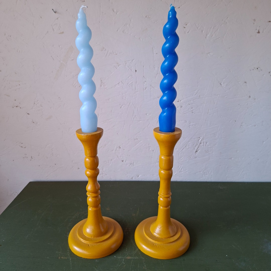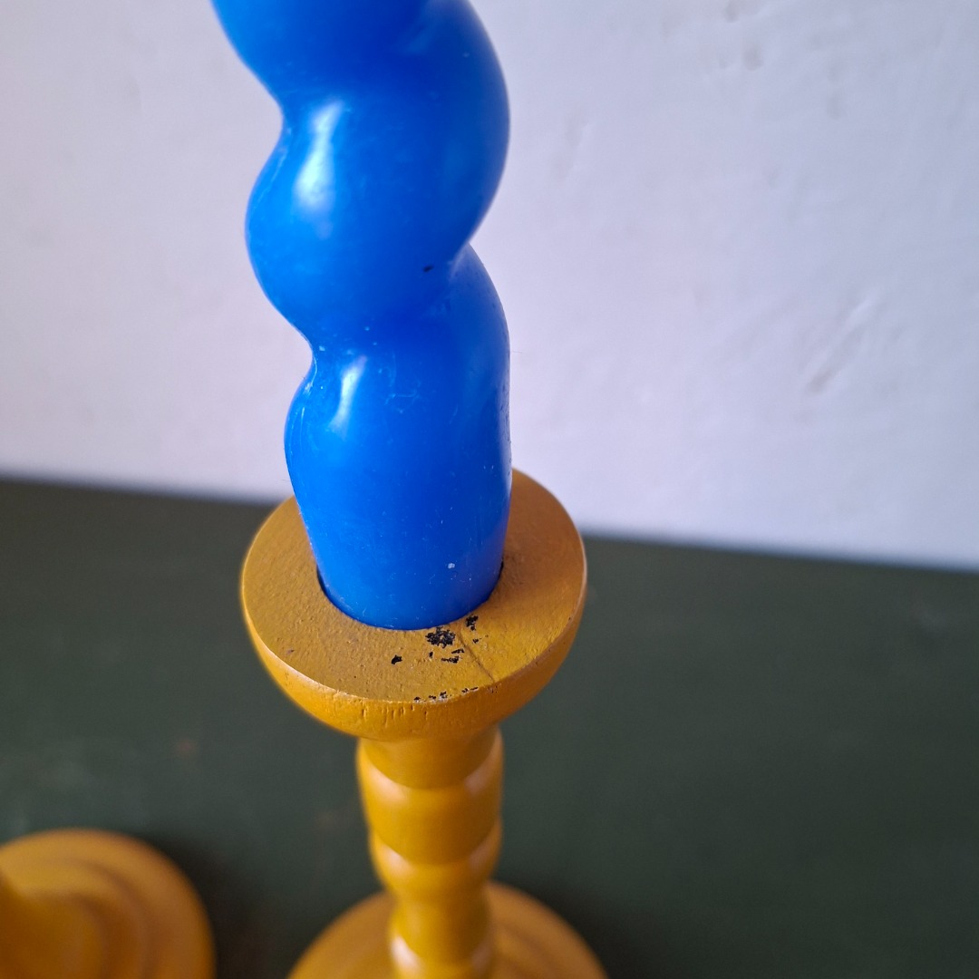 2 Houten kandelaars in een okerkleurige kleur. De hoogte is 20 cm. Bij 1 kandelaar is aan de bovenkant wat verf af.