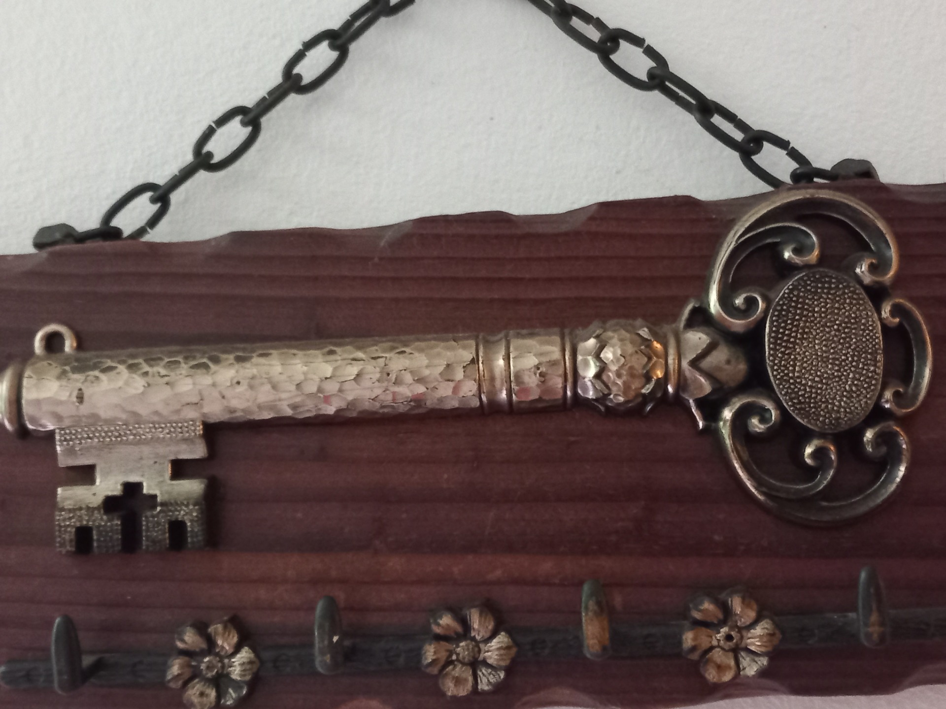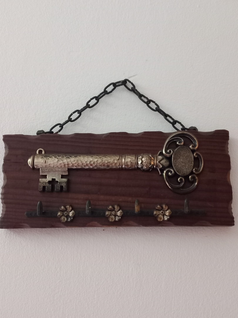 Deze vintage houten wandhanger kun je in de hal hangen voor al je sleutels. Met ijzeren ophang ketting. De sleutelhaakjes zijn van plastic. De breedte is 25 cm en de hoogte is 10 cm.