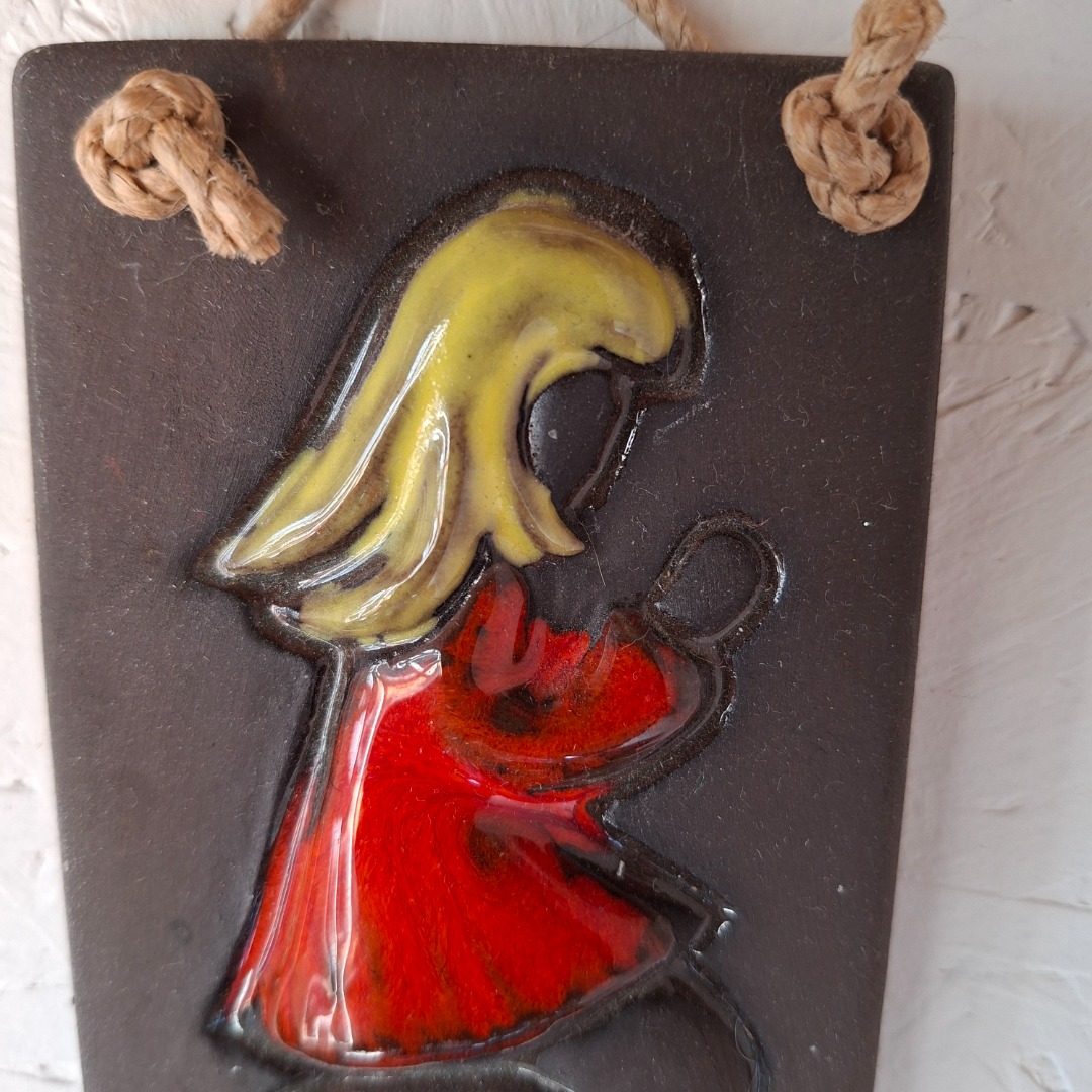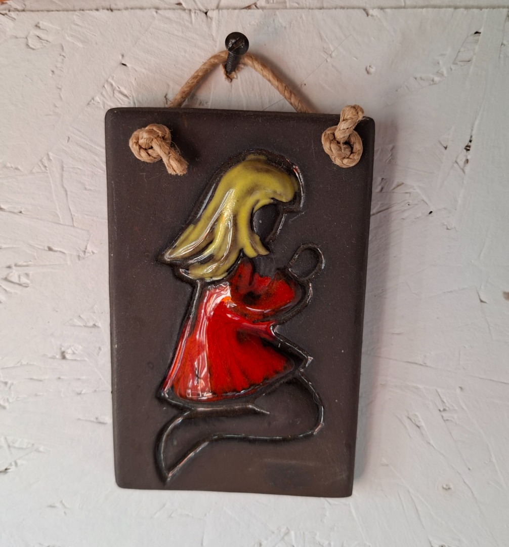 Wand hanger van keramiek van een blond meisje met een rood jurkje aan. Deze komt uit Zweden. De afmeting is 12 x 8 cm.