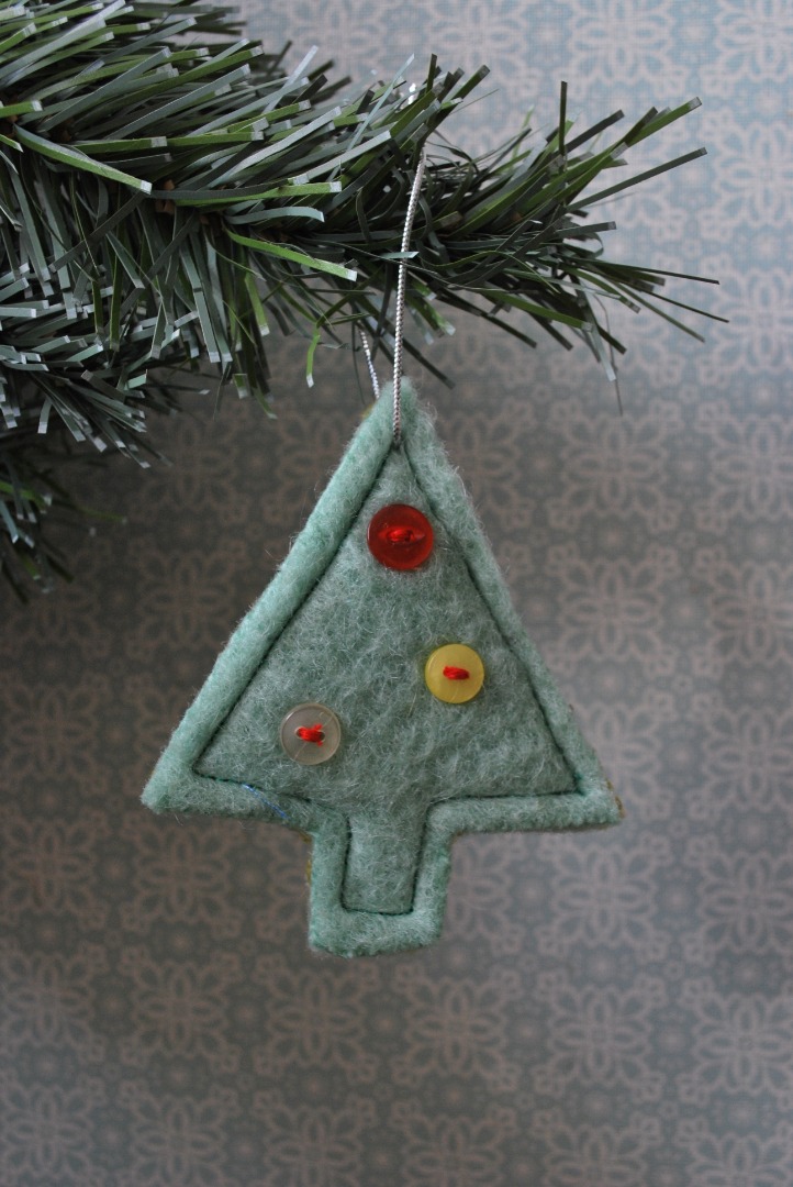 Kersthanger gemaakt van wol. Met knoopjes als kerstbal. De hanger is 10 cm hoog en 8 cm breed.