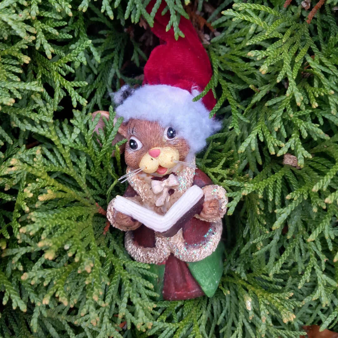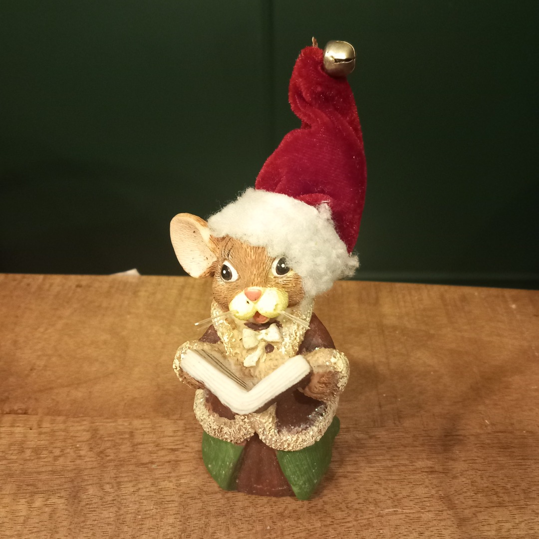 Kerstmuis met een boek in de hand en een stoffen muts. De hoogte is 14 cm.