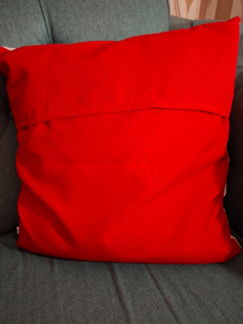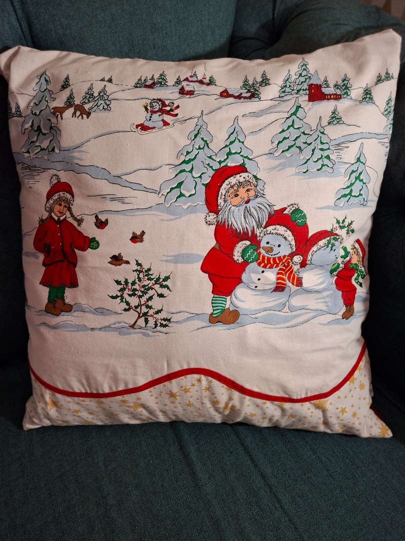Kerstkussenhoes met afbeelding van de kerstman en een sneeuwlandschap. Onderkant heeft stof met gouden sterren. Achterkant is niet zo rood als op de foto. De maat is 50 x 50 cm.