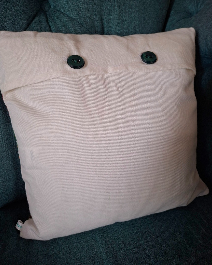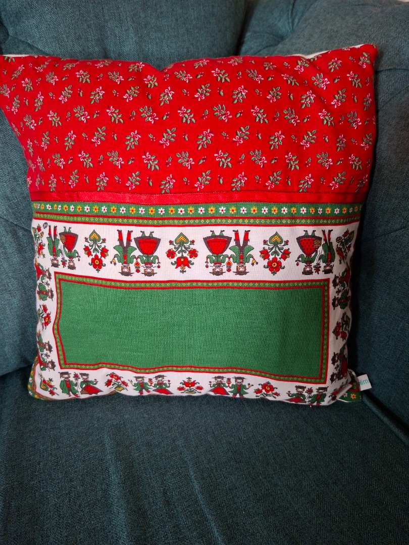 Kerst kussenhoes in groen en rood met poppetjes in folklorekleding. De achterkant heeft een witte katoenen stof met 2 groene knopen. De maat is 40 x 40 cm.
