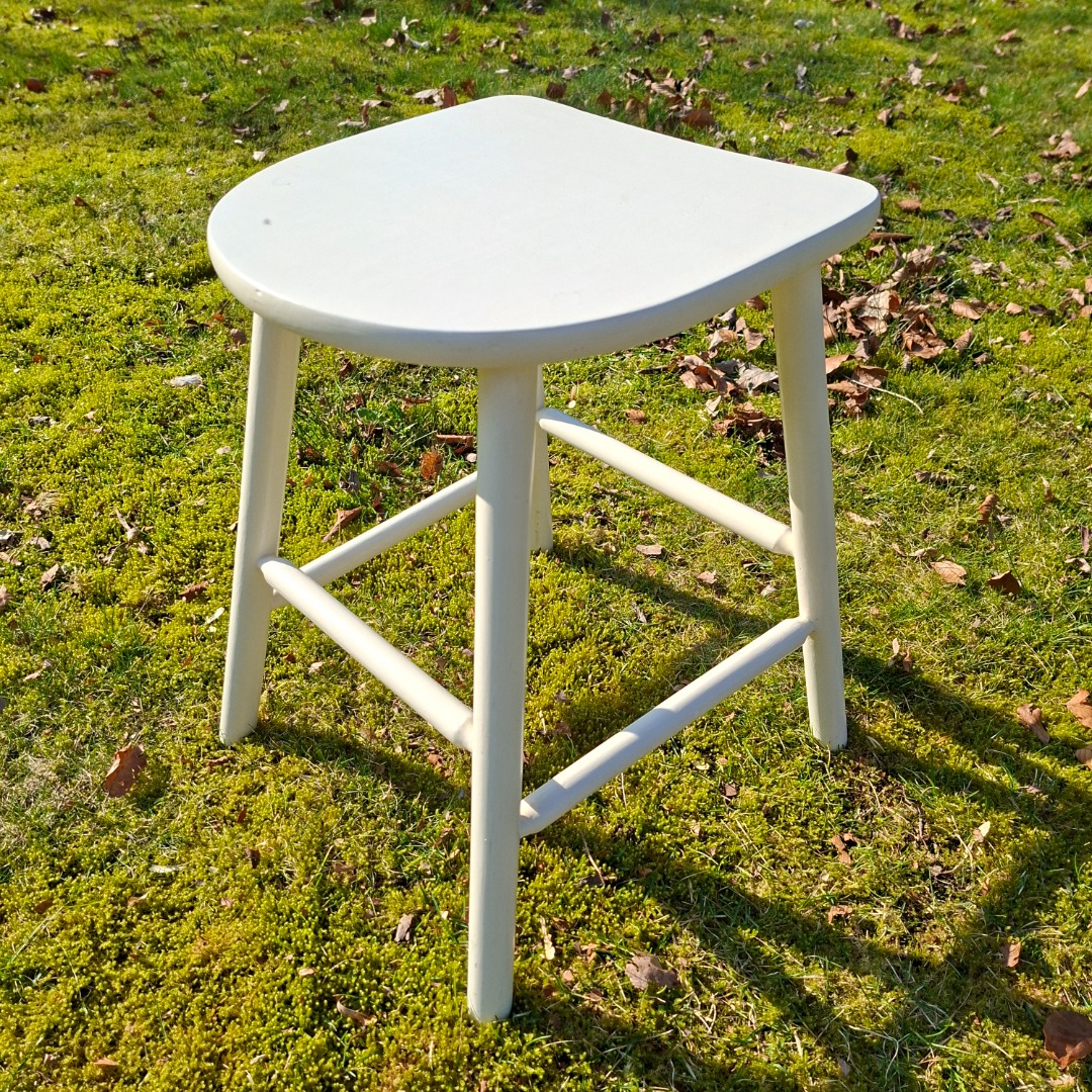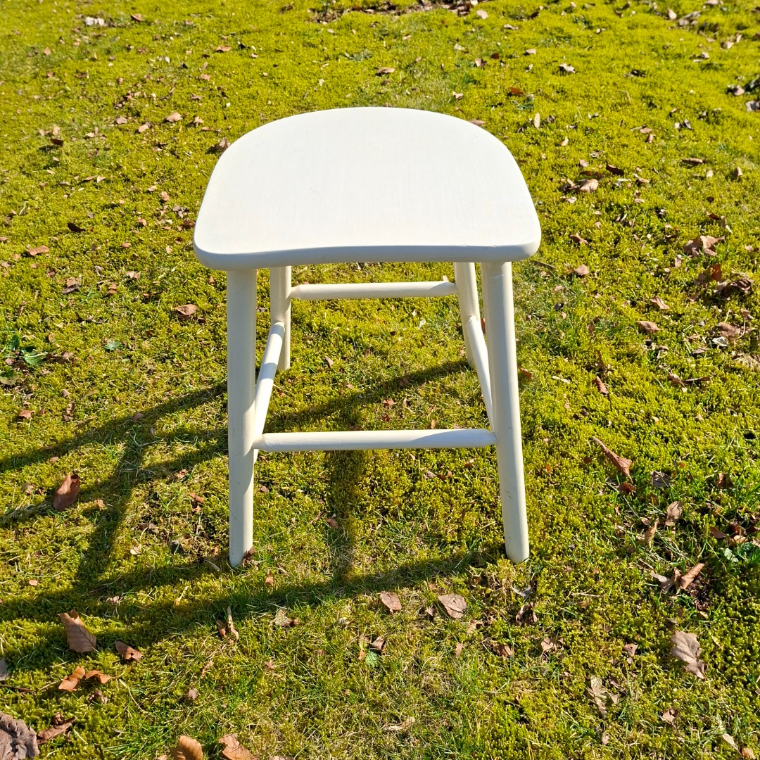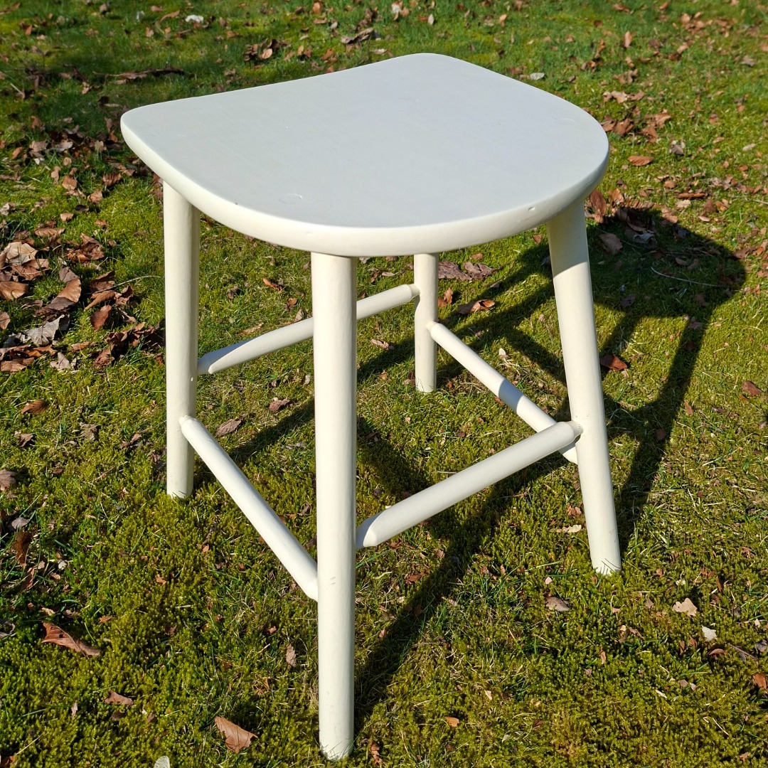 Wit houten krukje wat vroeger waarschijnlijk een stoeltje is geweest. Op het zitgedeelte zie je nog 3 rondjes waar de spijlen in zaten, maar dat is netjes dichtgemaakt. De hoogte is 47 cm, het zitvlak is 32 breed en 30,5 cm diep. De breedte aan de onderkant is 28 cm.