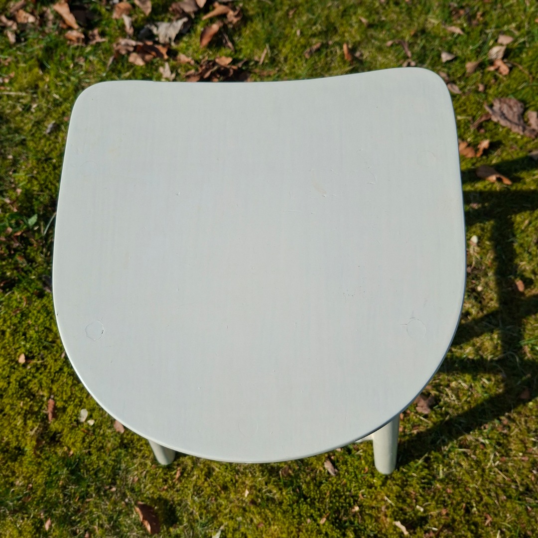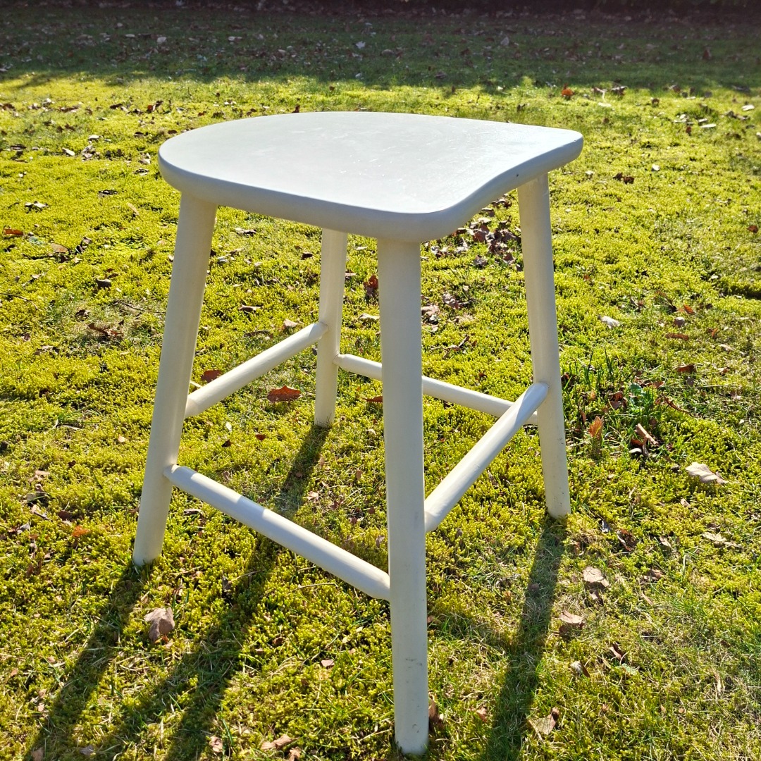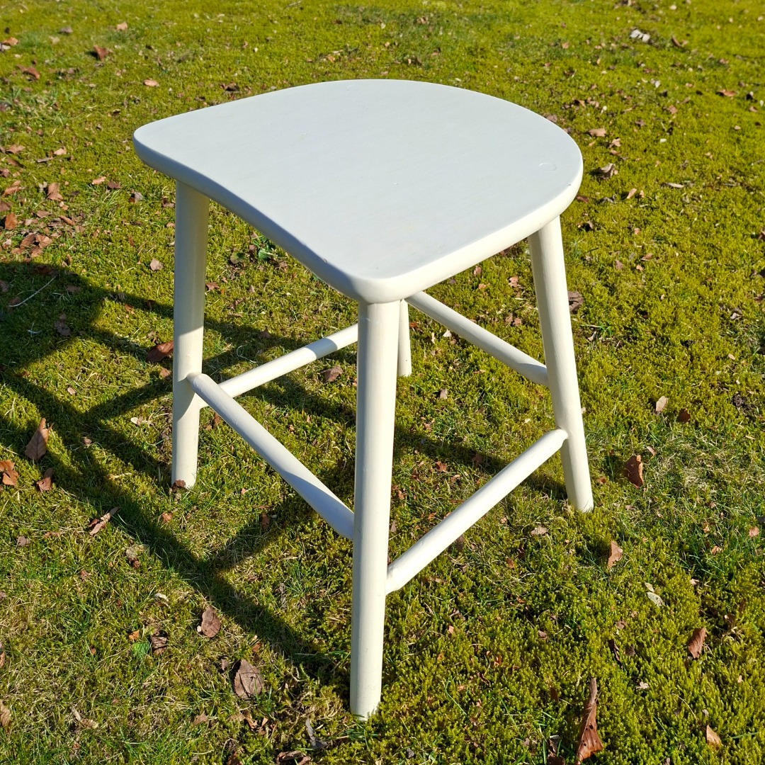 Wit houten krukje wat vroeger waarschijnlijk een stoeltje is geweest. Op het zitgedeelte zie je nog 3 rondjes waar de spijlen in zaten, maar dat is netjes dichtgemaakt. De hoogte is 47 cm, het zitvlak is 32 breed en 30,5 cm diep. De breedte aan de onderkant is 28 cm.