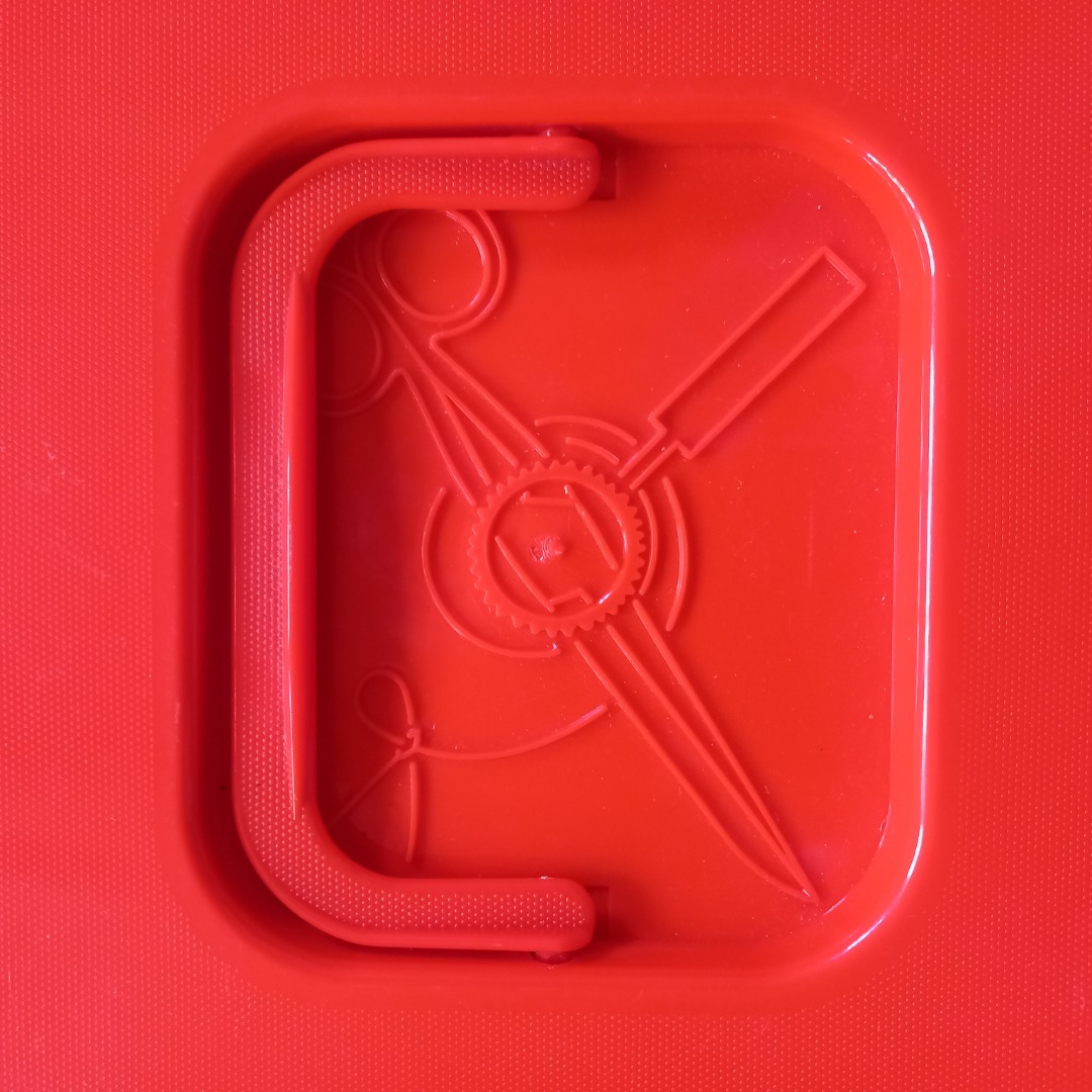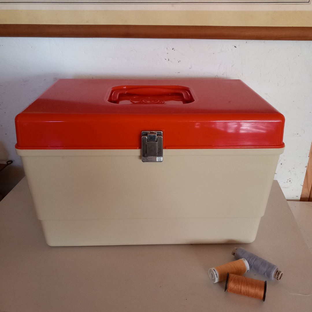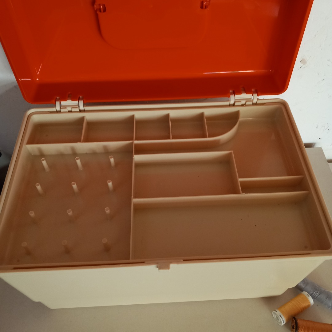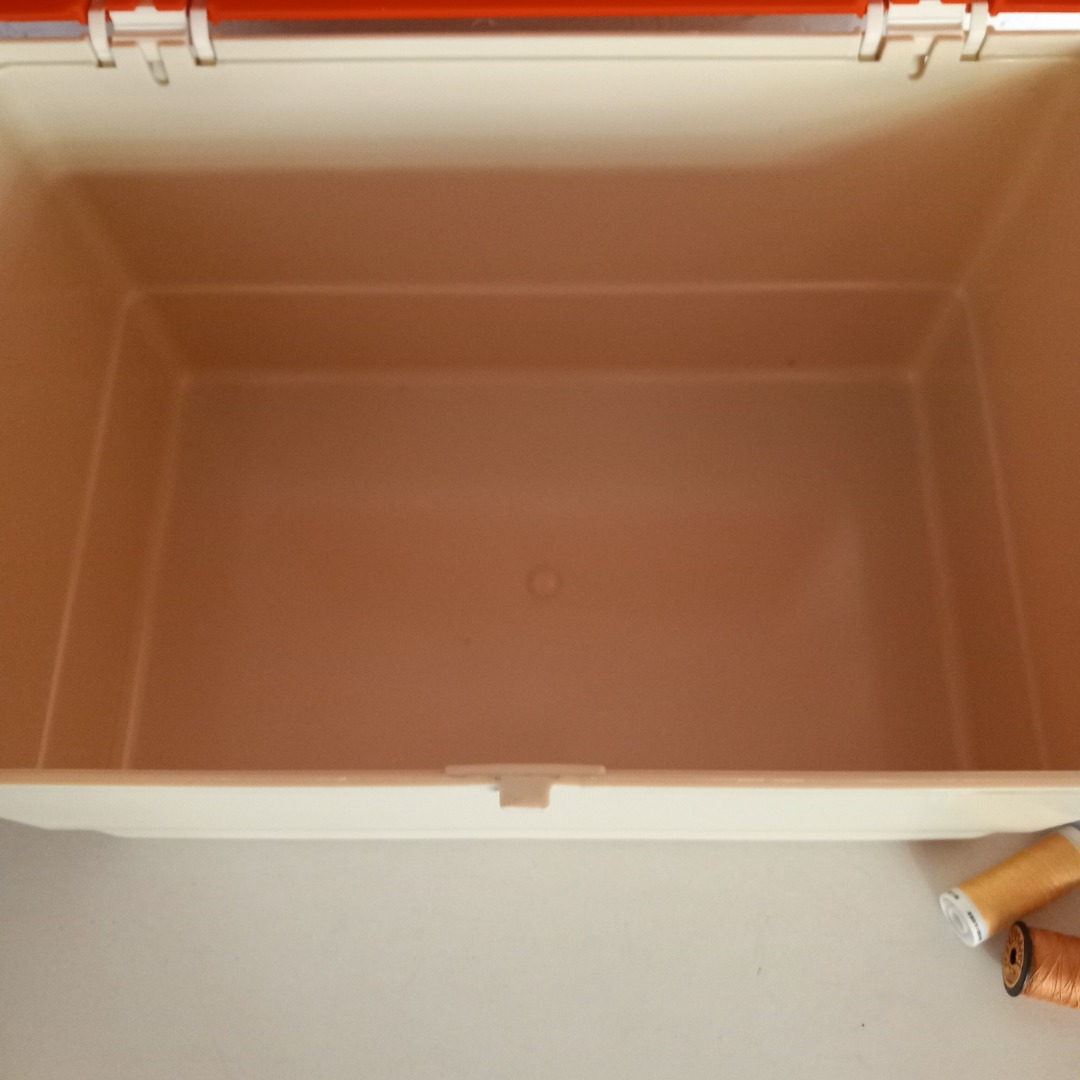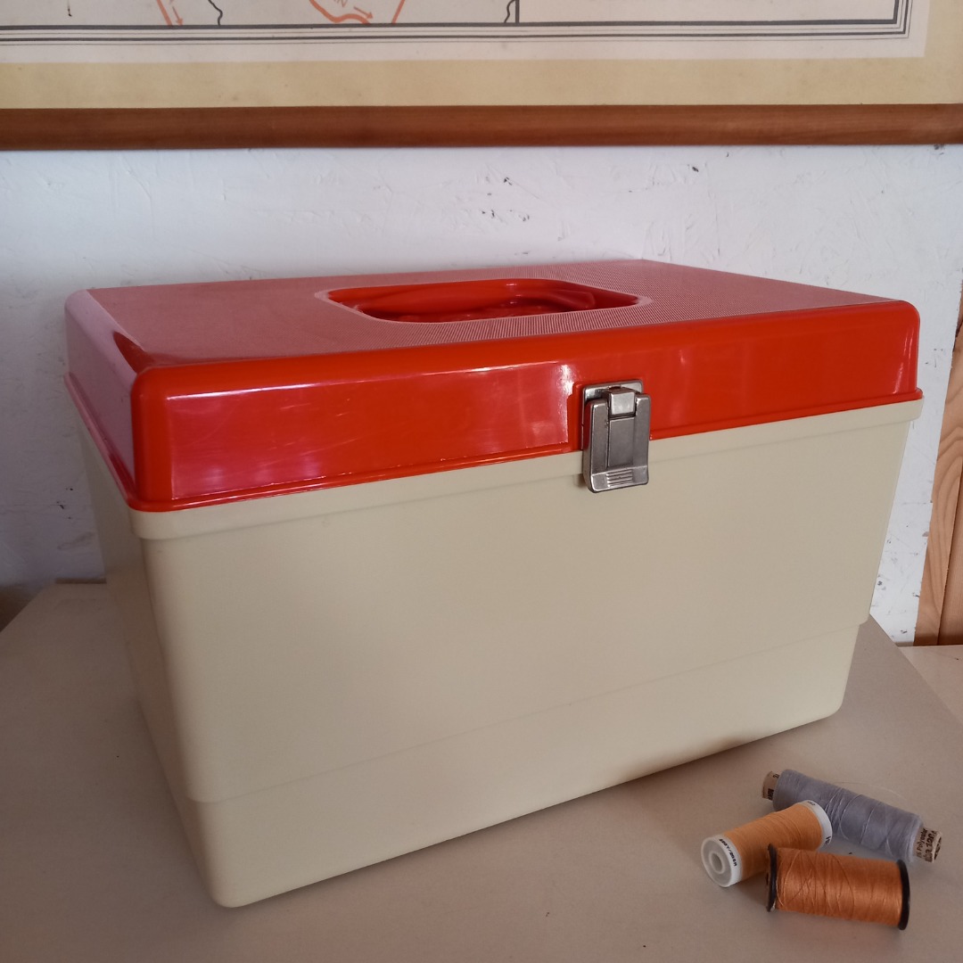 Oude plastic naaidoos in een oranje en creme kleur uit de jaren 70. In goede staat. De afmeting is 36 cm breed, 22,5 cm hoog en 23,5 cm diep.