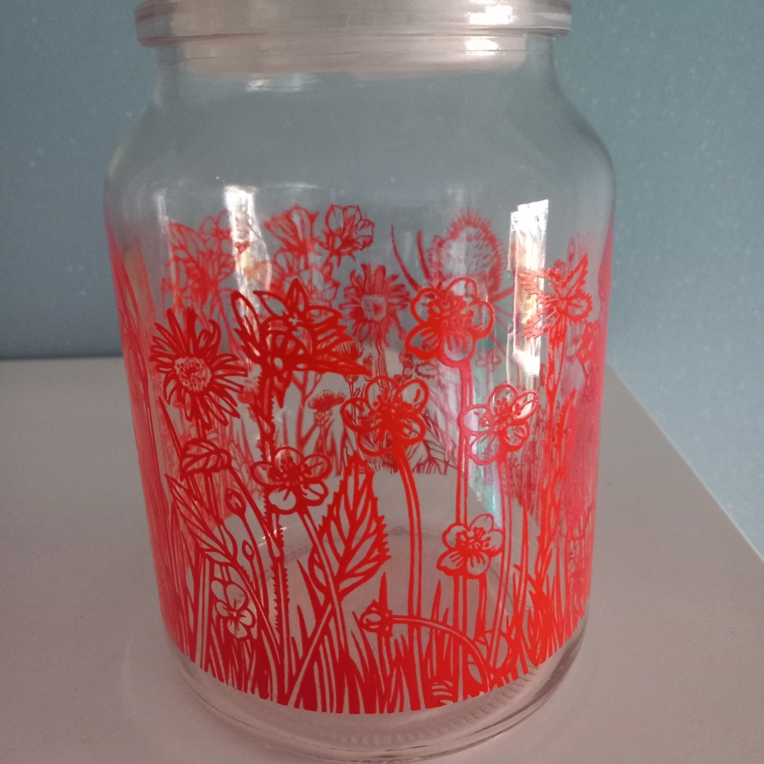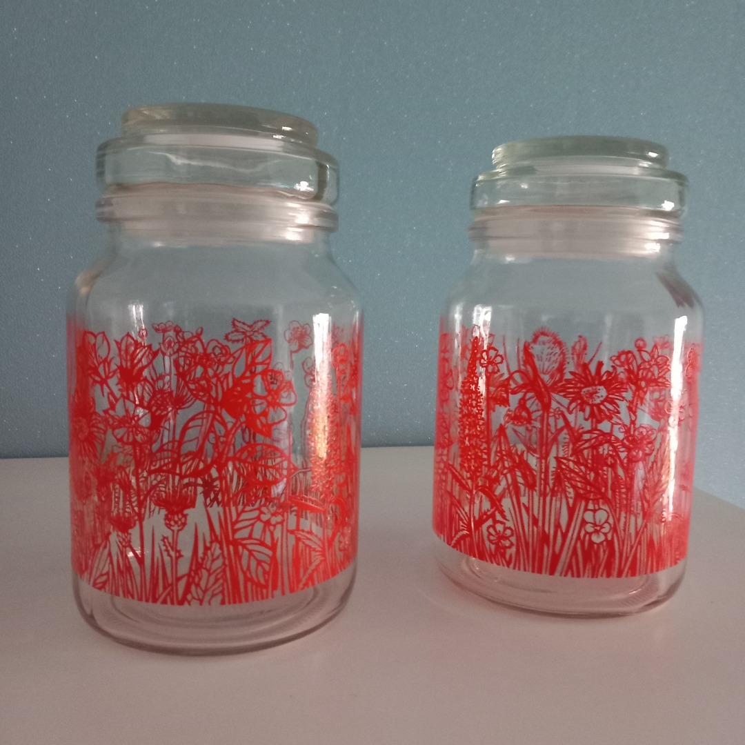 2 Glazen potten met deksel van Douwe Egberts. Het heeft een oranje bloemenafbeelding. De hoogte is17,5 cm.