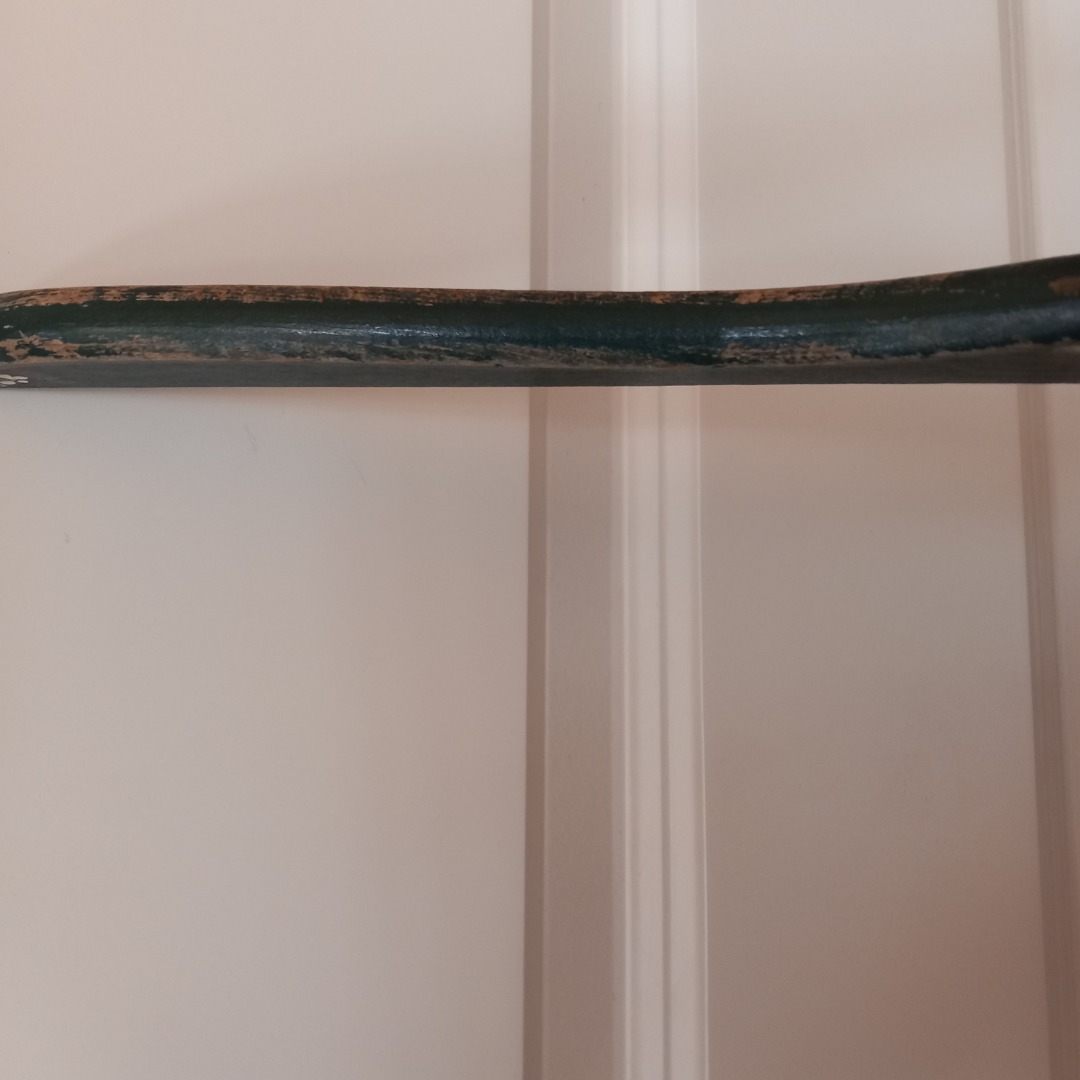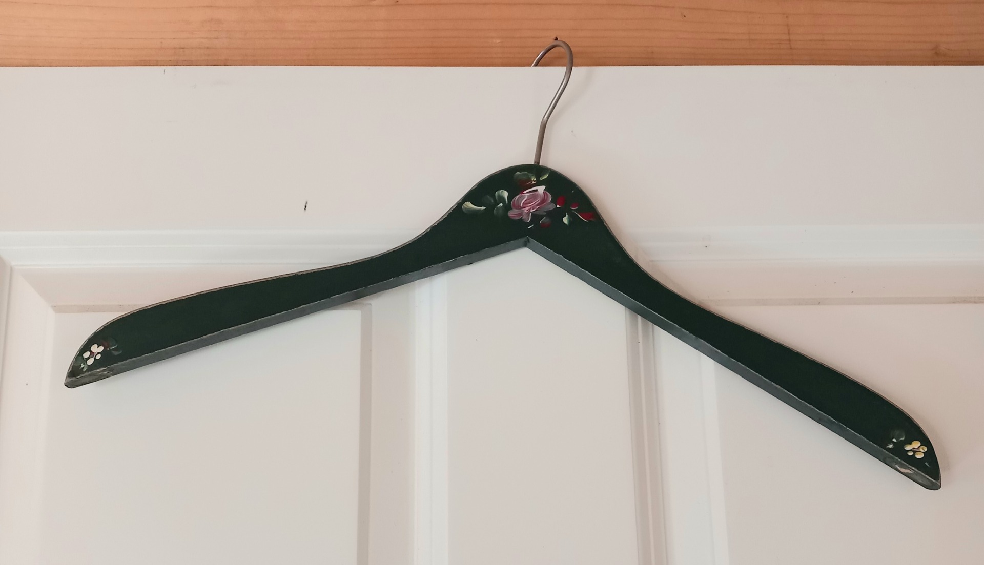Houten groen geverfde kledinghanger met bloemen. Rondom wat slijtage van het verf.