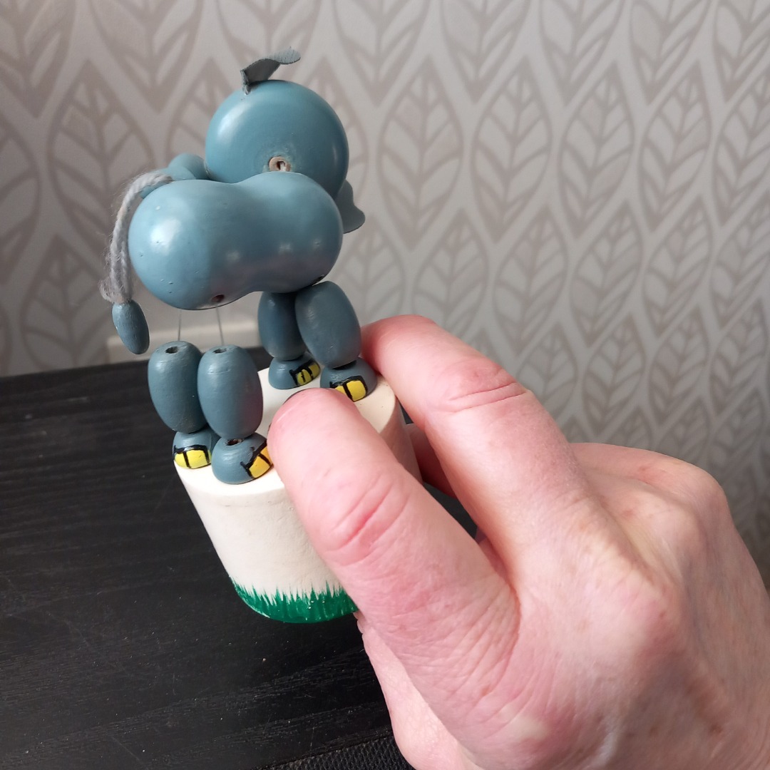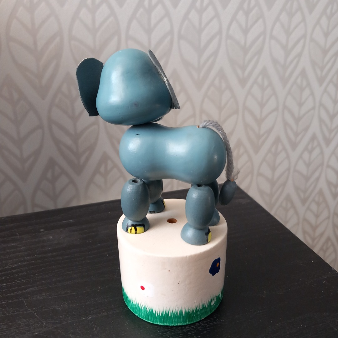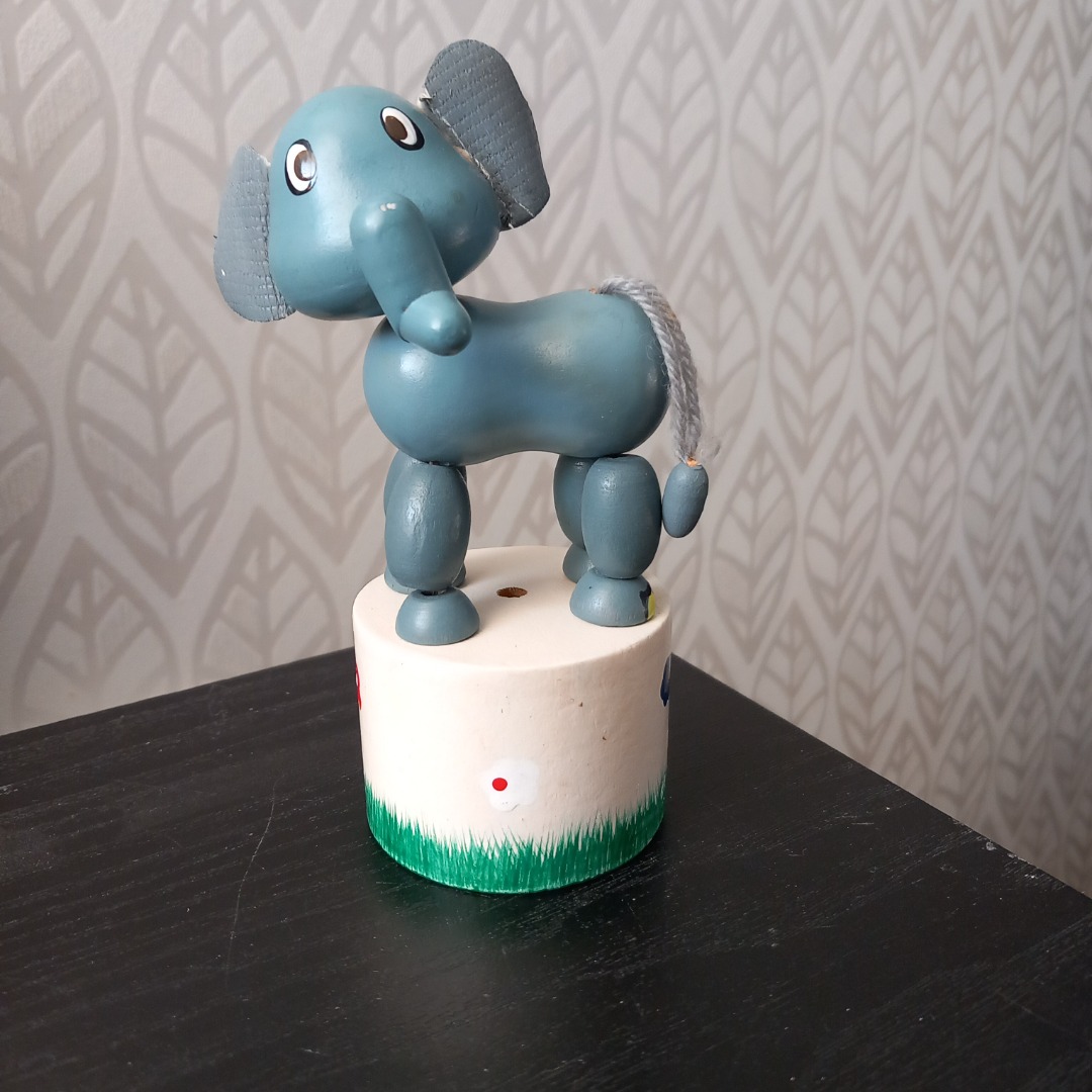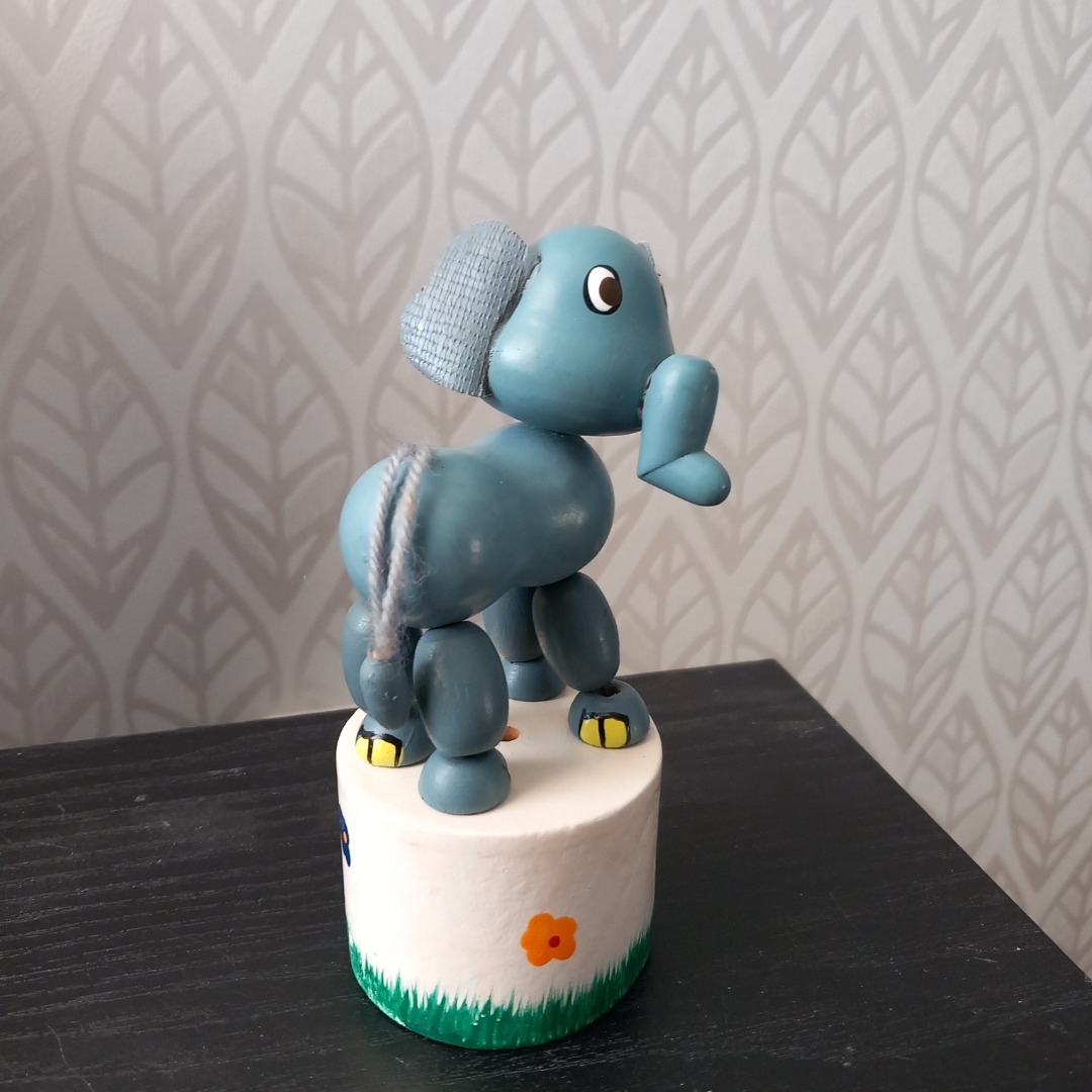 Leuk houten drukfiguurtje van een olifant. In goede staat en klaar voor veel speelplezier. Ideaal voor kinderen om hun motoriek te ontwikkelen. Deze olifant komt uit de jaren 90. De hoogte is 12 cm.