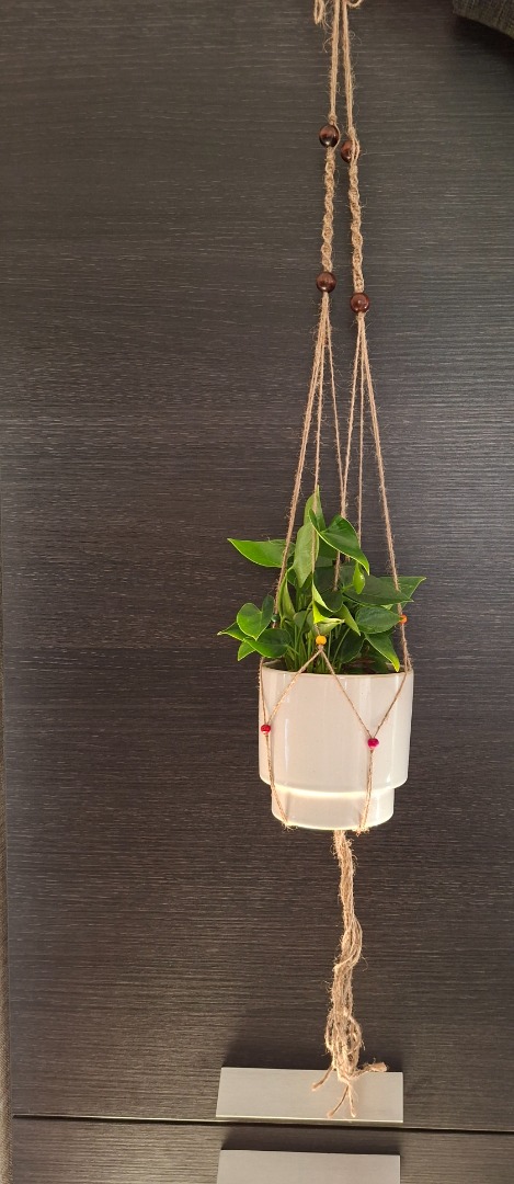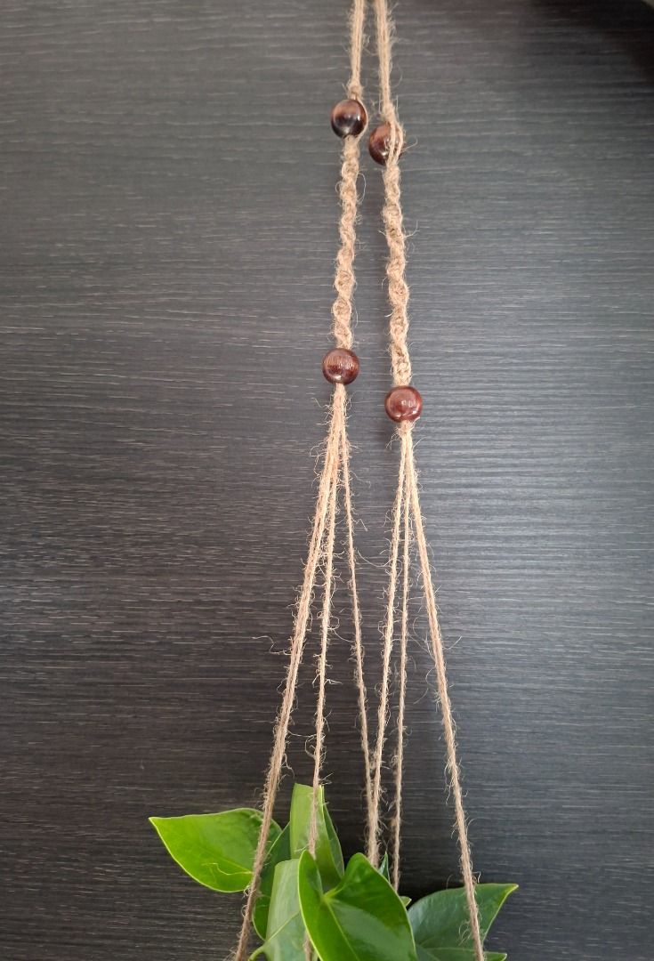 Nieuwe macrame plantenhanger van een dunne bruine touw en afgewerkt met houten gekleurde kralen. De lengte is totaal 1,26 meter.