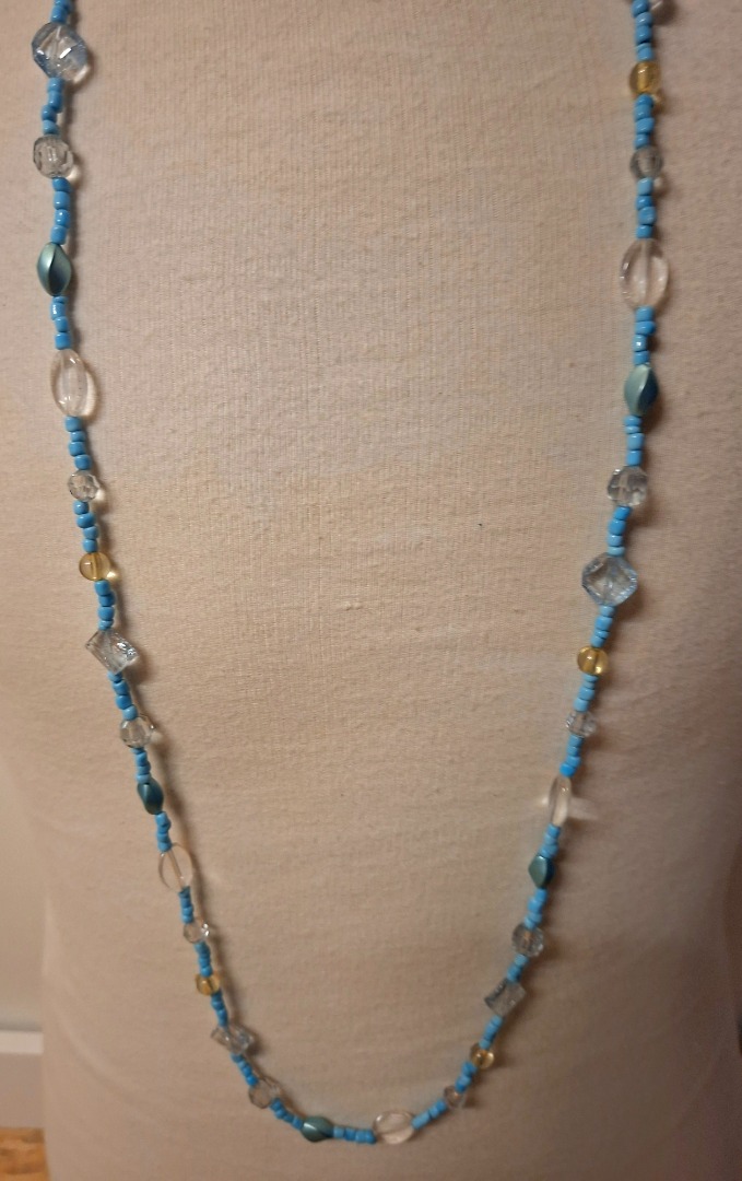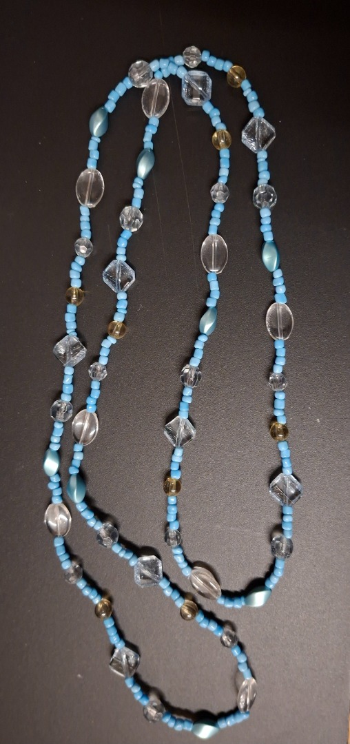 Ketting van doorzichtige en blauwe kraaltjes. De totale lengte is 1,14 meter.
