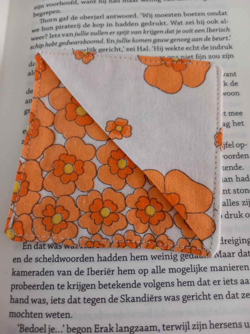 Bladwijzer voor al je boeken in paars en oranje/witte kleur. Deze is gemaakt van vintage stoffen. De afmeting is 9 x 9 cm.