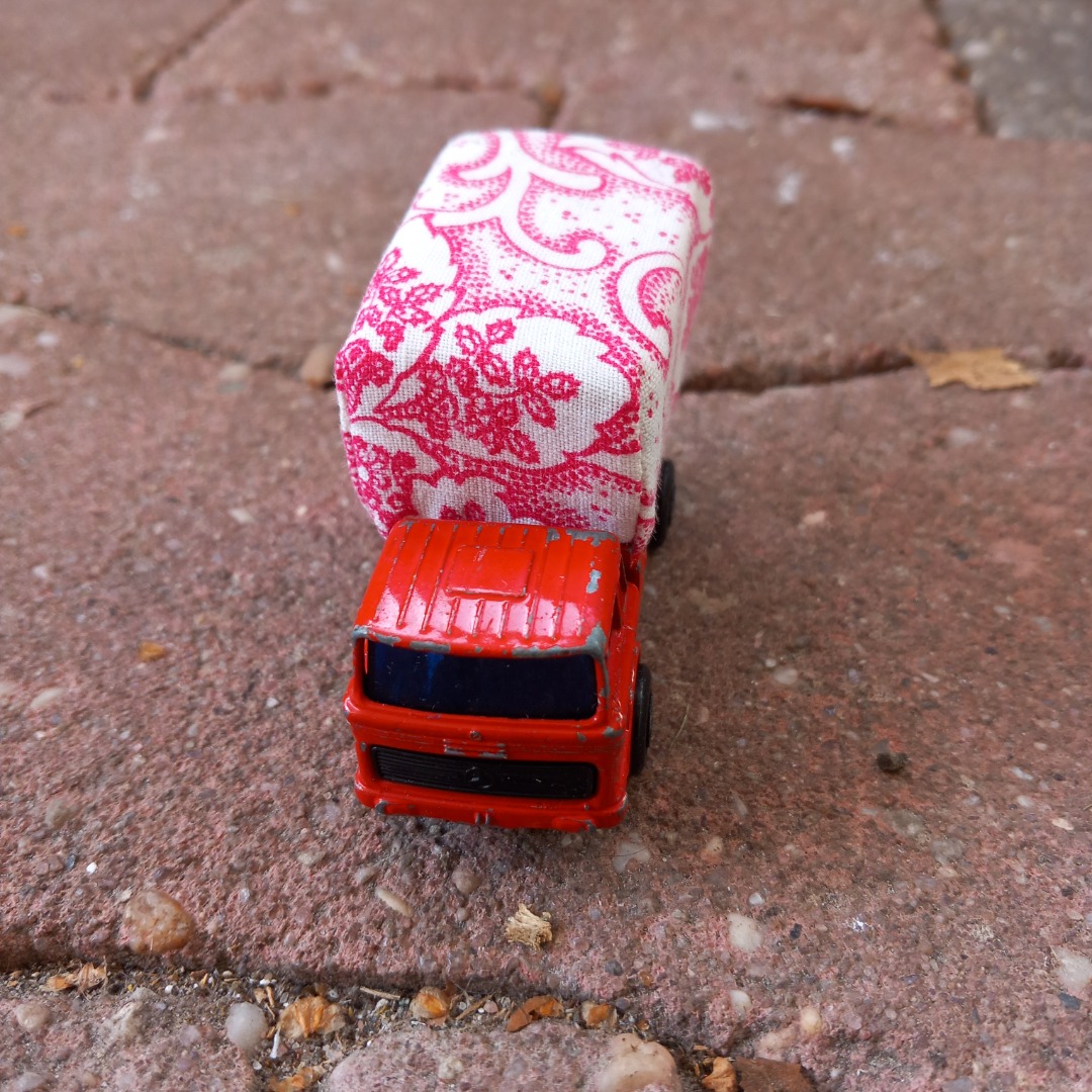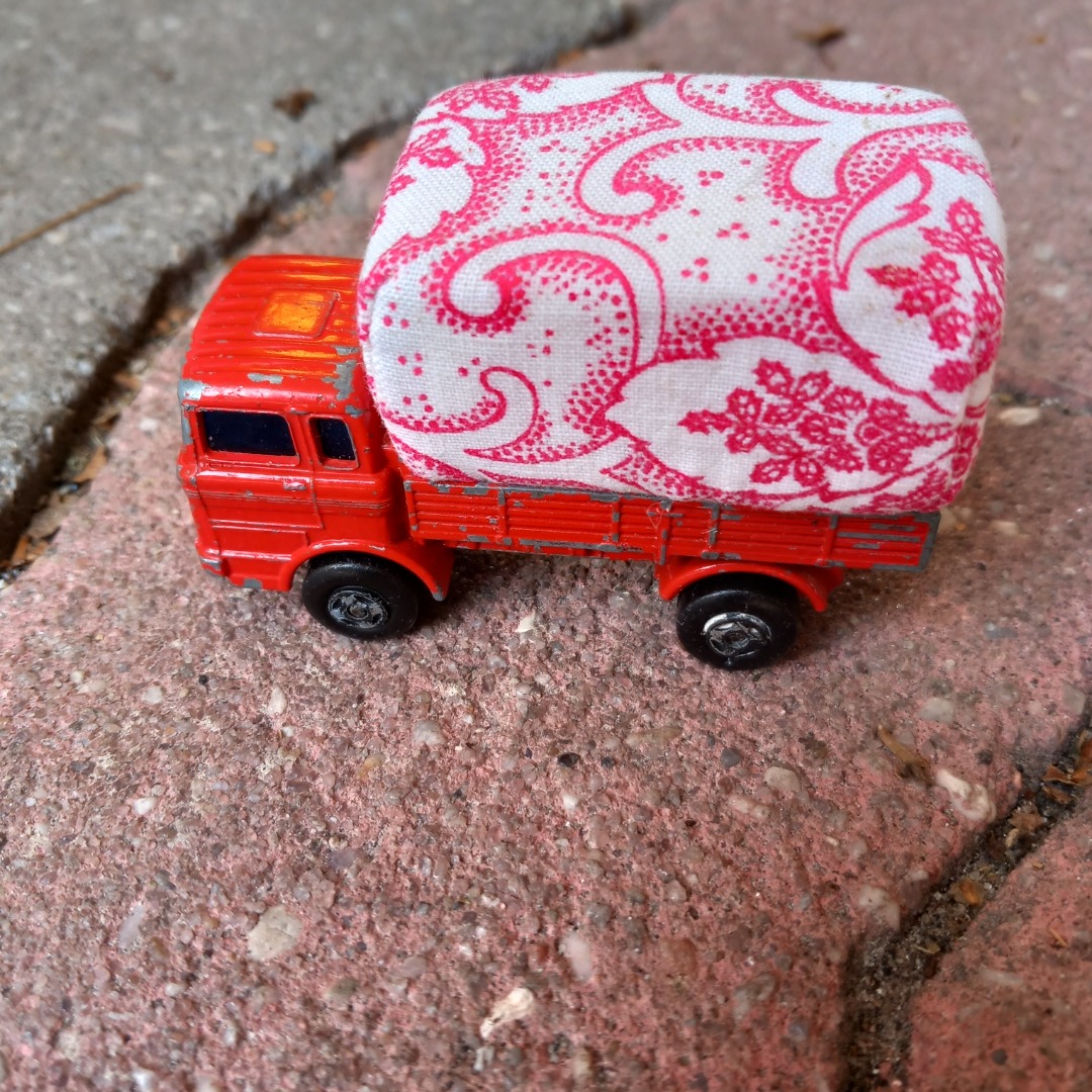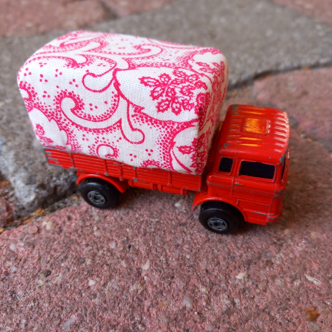 Leuk om zo op je werktafel neer te zetten, deze speldenkussen gemaakt met een oude rode speelgoedvrachtwagen. De lengte is totaal 8 cm.