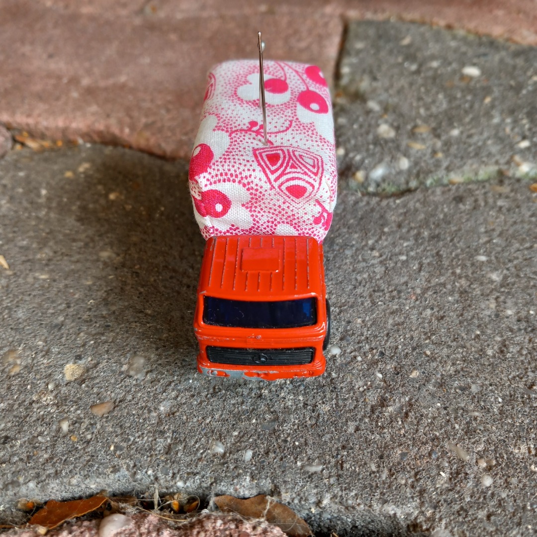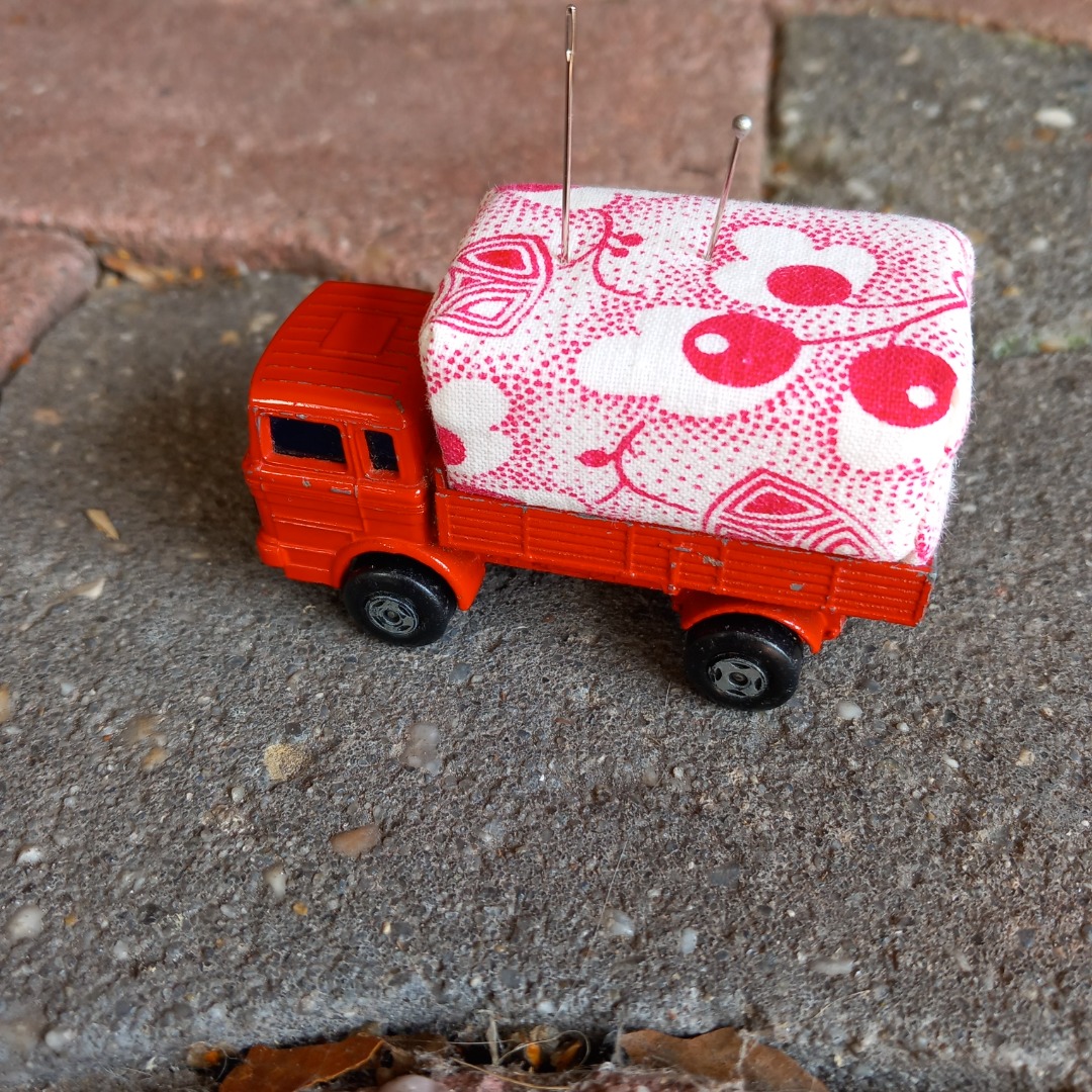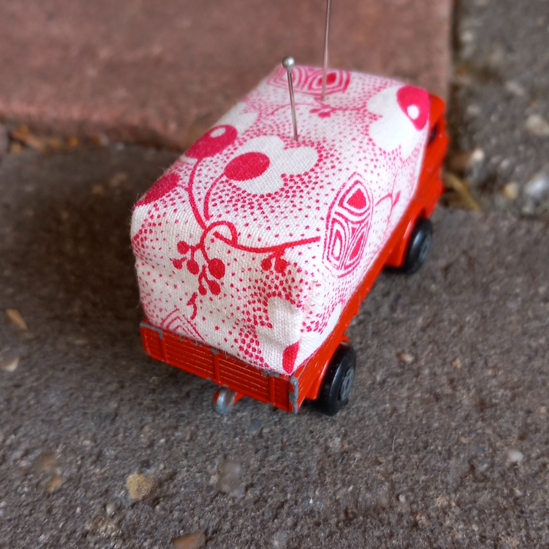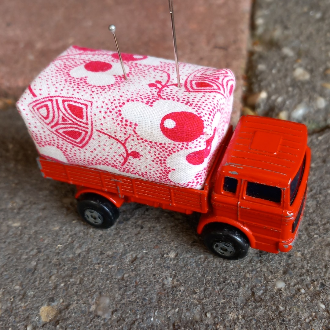 Hoe leuk staat dit op je werktafel. Deze vintage vrachtwagen is 8 cm lang en gevuld met schuimrubber en een vintage stofje.