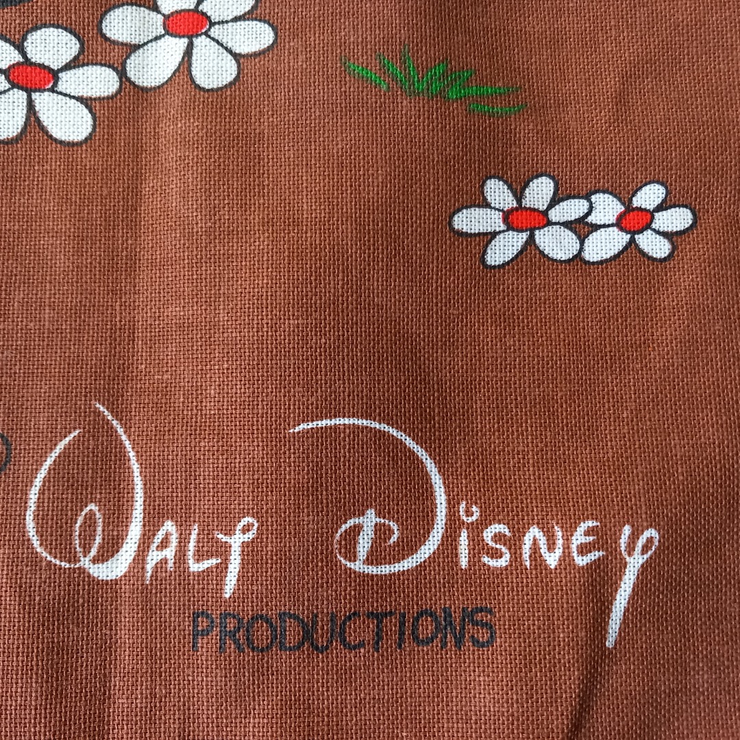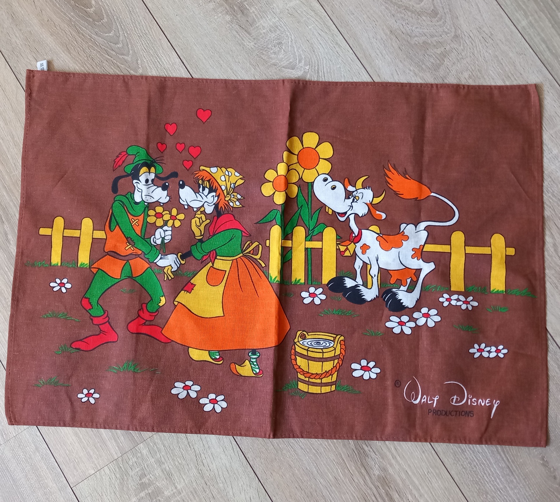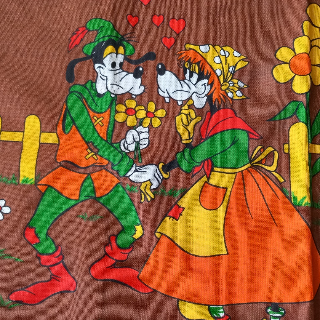 Stoffen afbeelding van Goofy en Clara in een landelijke setting van Walt Disney. Deze is nog nieuw. Je kunt het bijvoorbeeld aan de wand hangen, als theedoek of als tafelkleedje. De afmeting is 66 x 44 cm.
