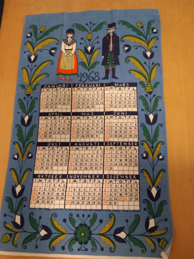 Stoffen kalender van 1968 met de afbeelding van mensen in Zweedse klederdracht. In goede staat. De afmeting is 73 x 45 cm.