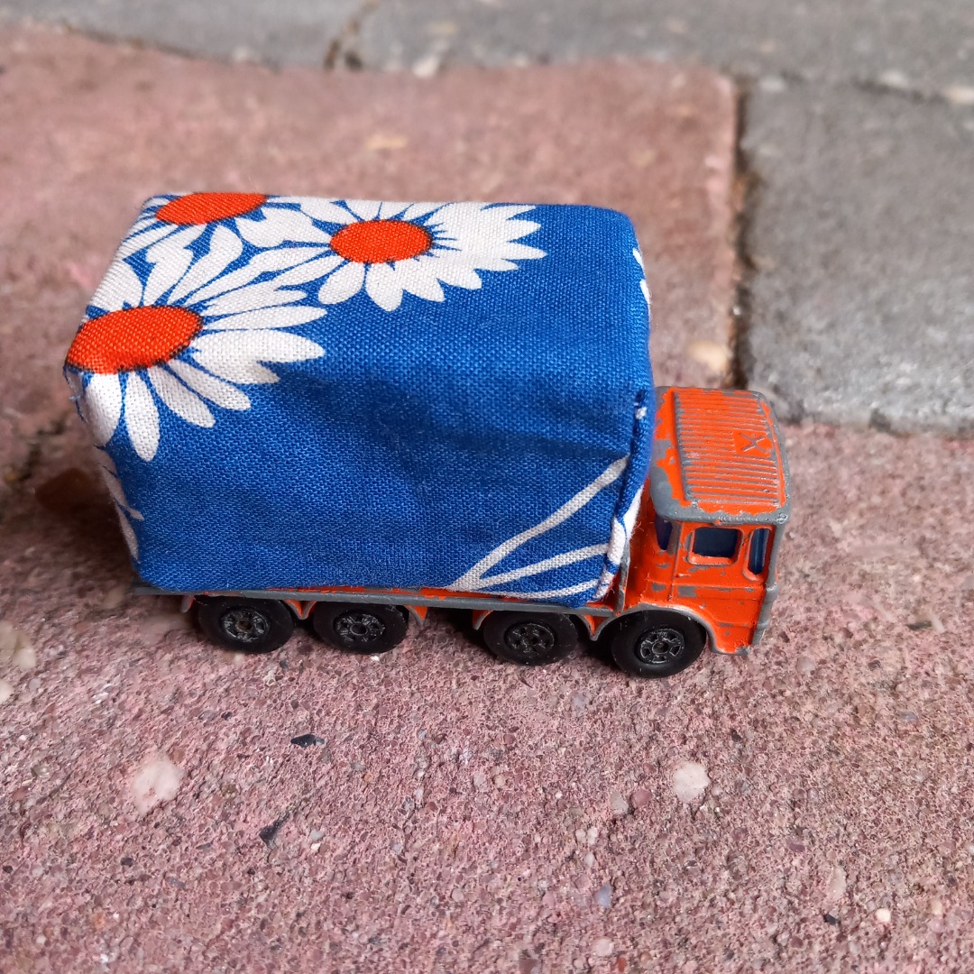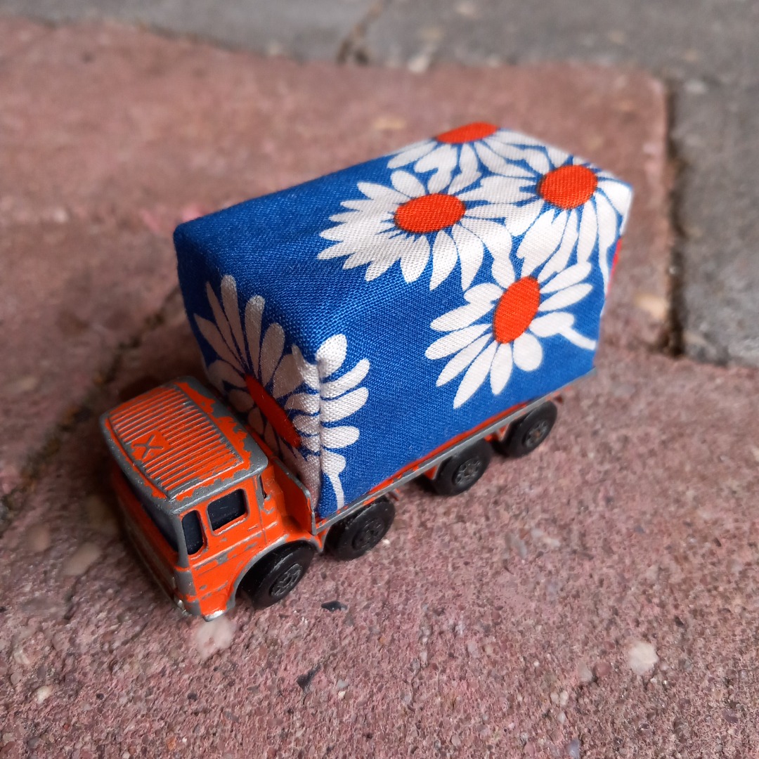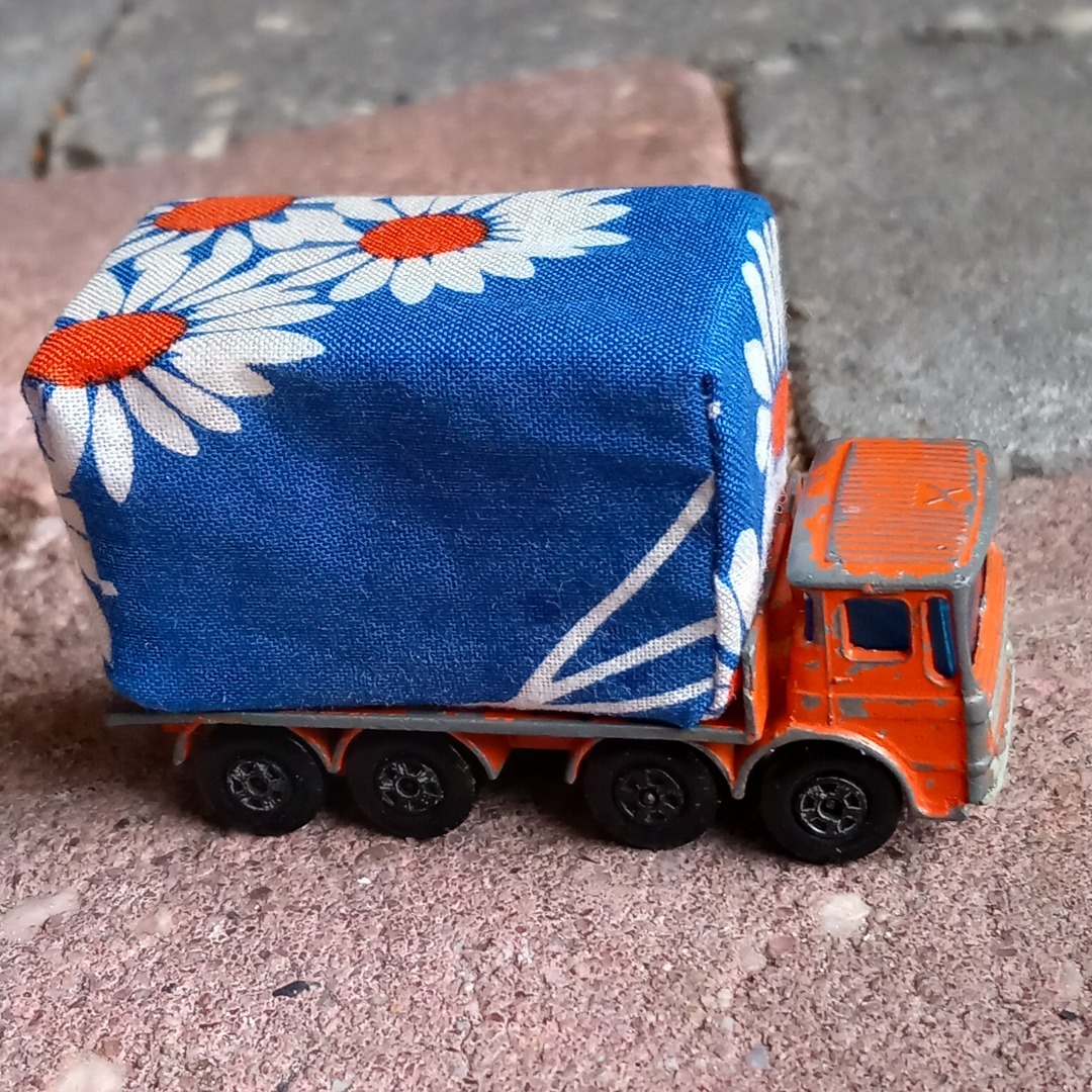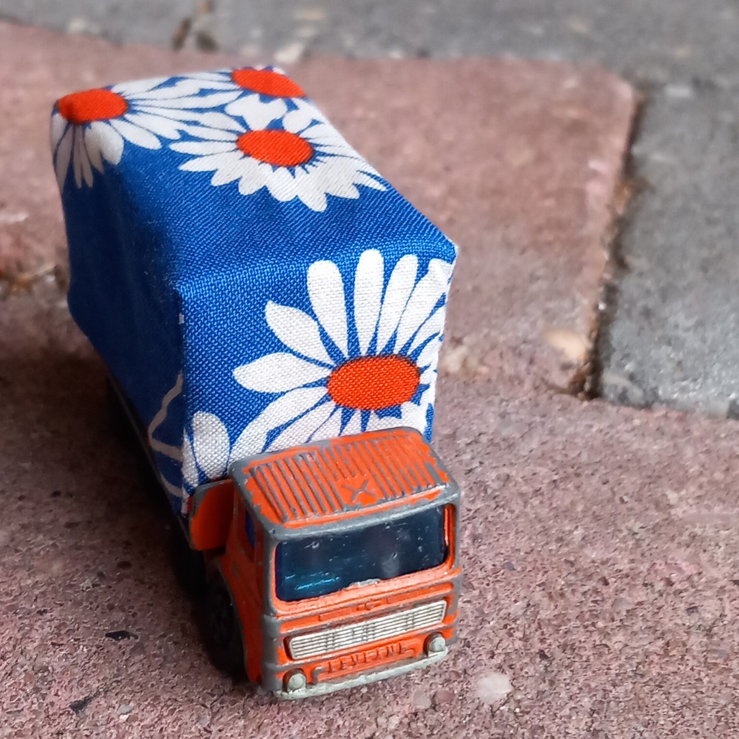 Speldenkussen op een oranje vrachtauto,  hoe leuk is dat! De afmeting  van de vrachtauto is 7,5 cm.
