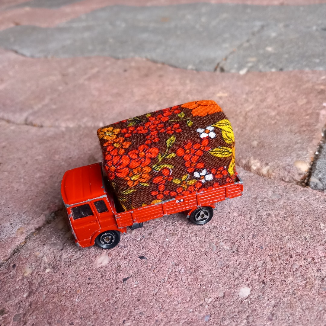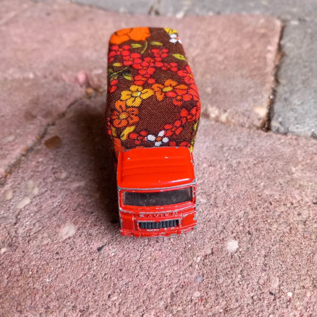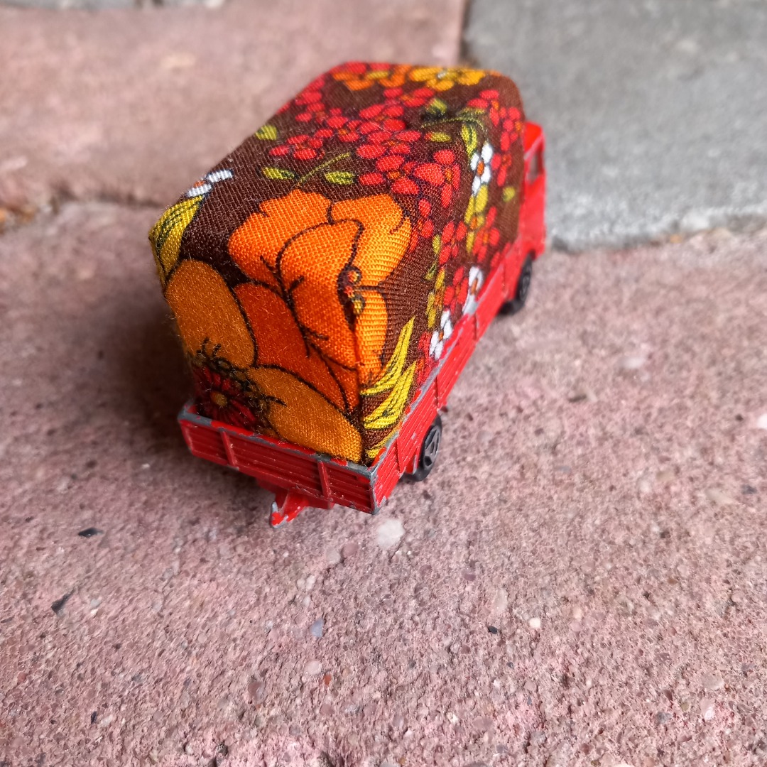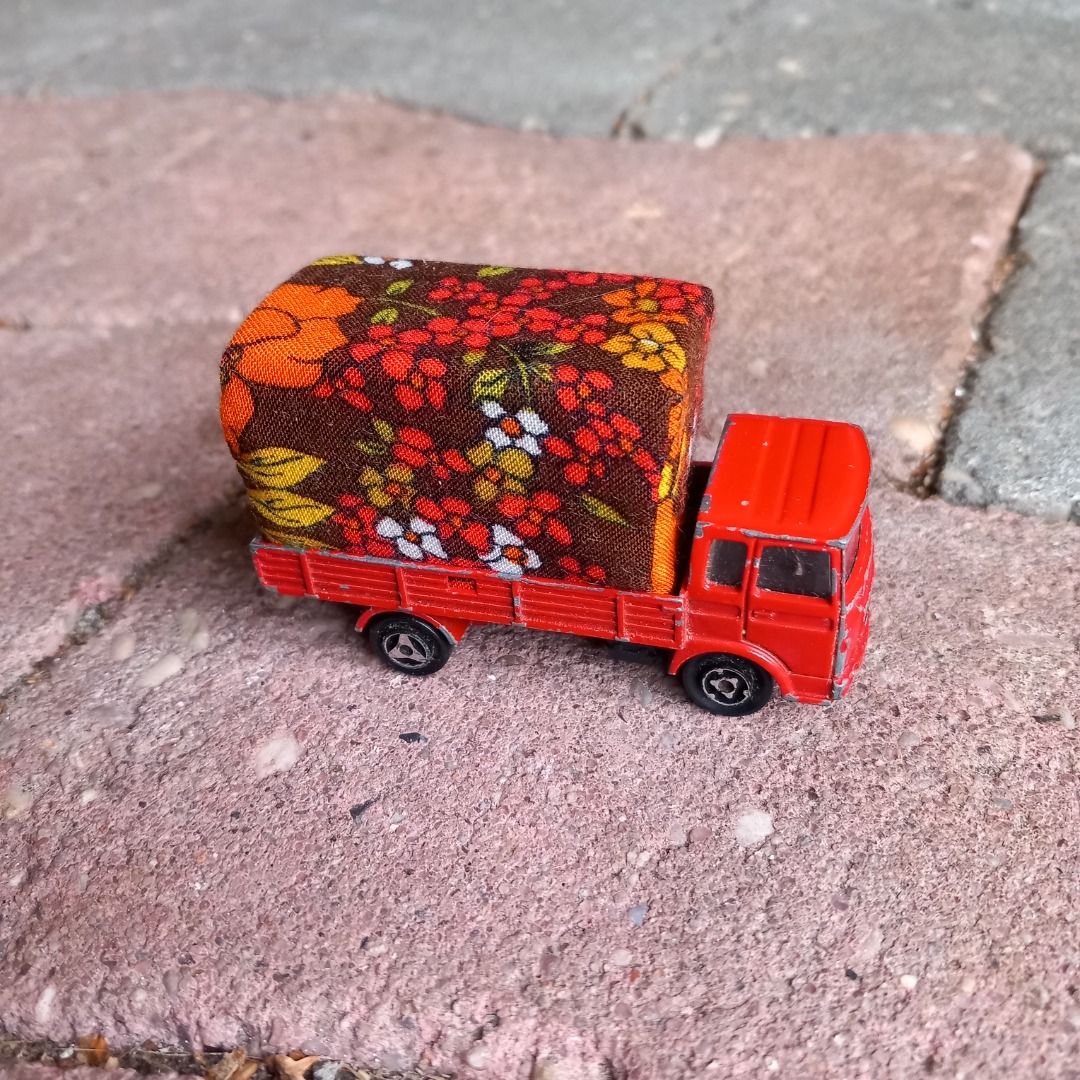 Deze rode vrachtauto met speldenkussen is 7,5 cm lang. De speldenkussen is gemaakt van schuimrubber en vintage stof.