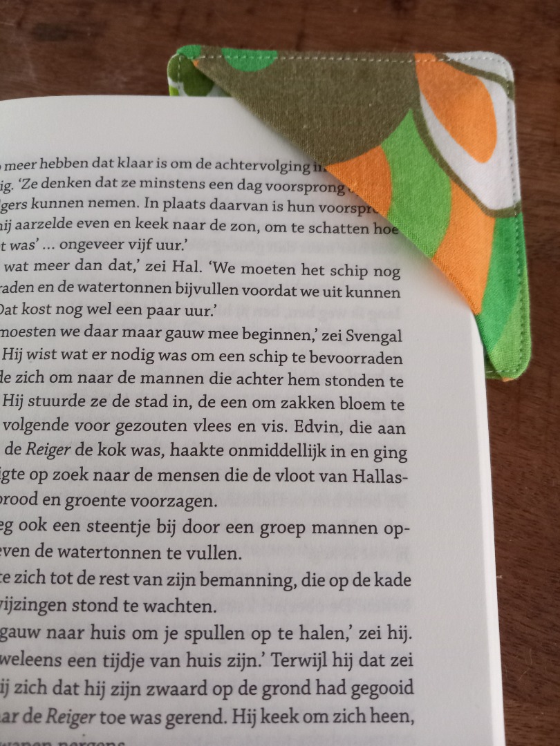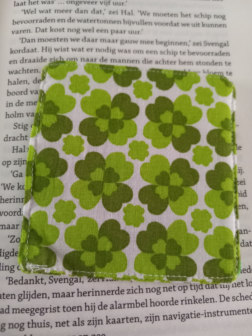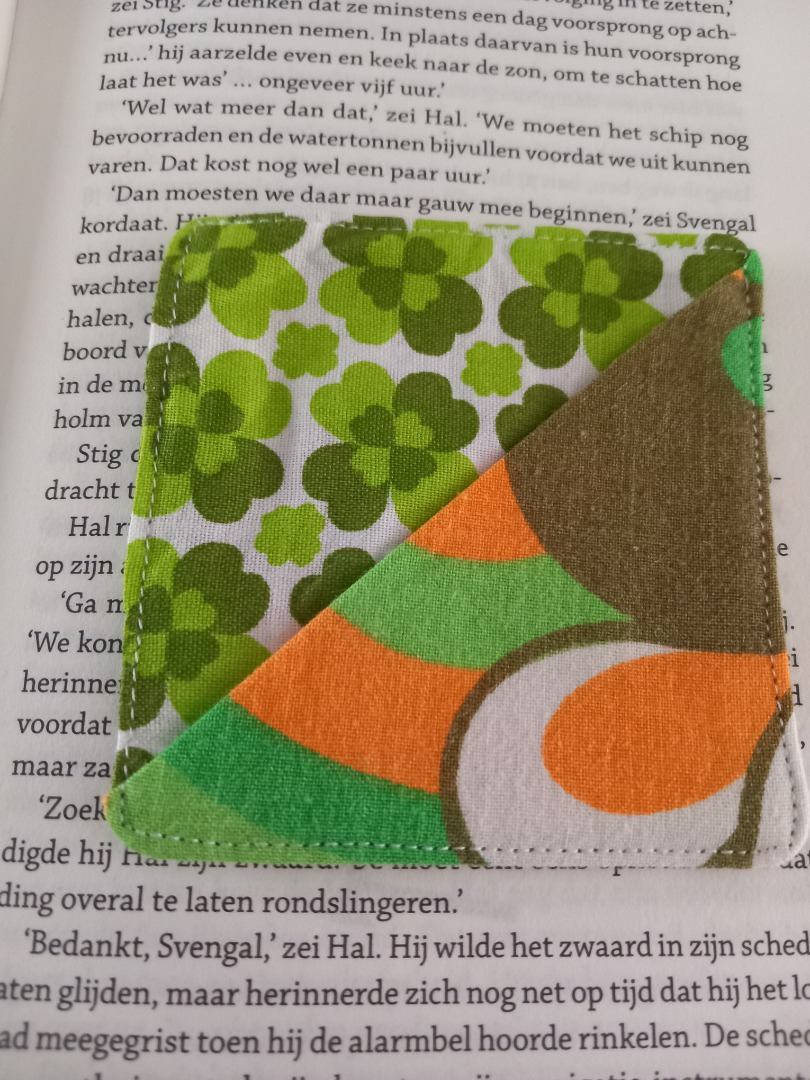 Bladwijzer gemaakt van 2 soorten groene vintage stof. De maat is 9 x 9 cm.
