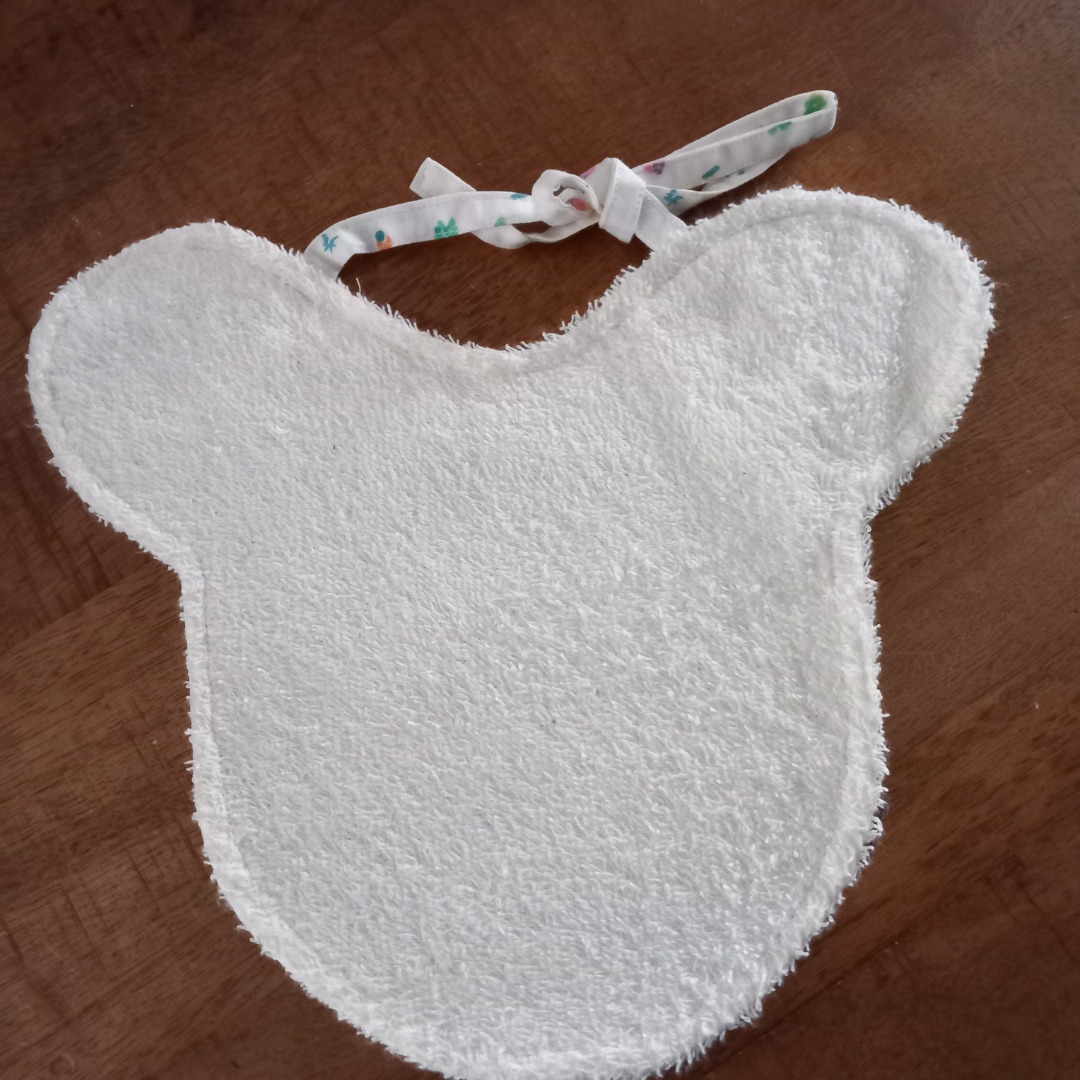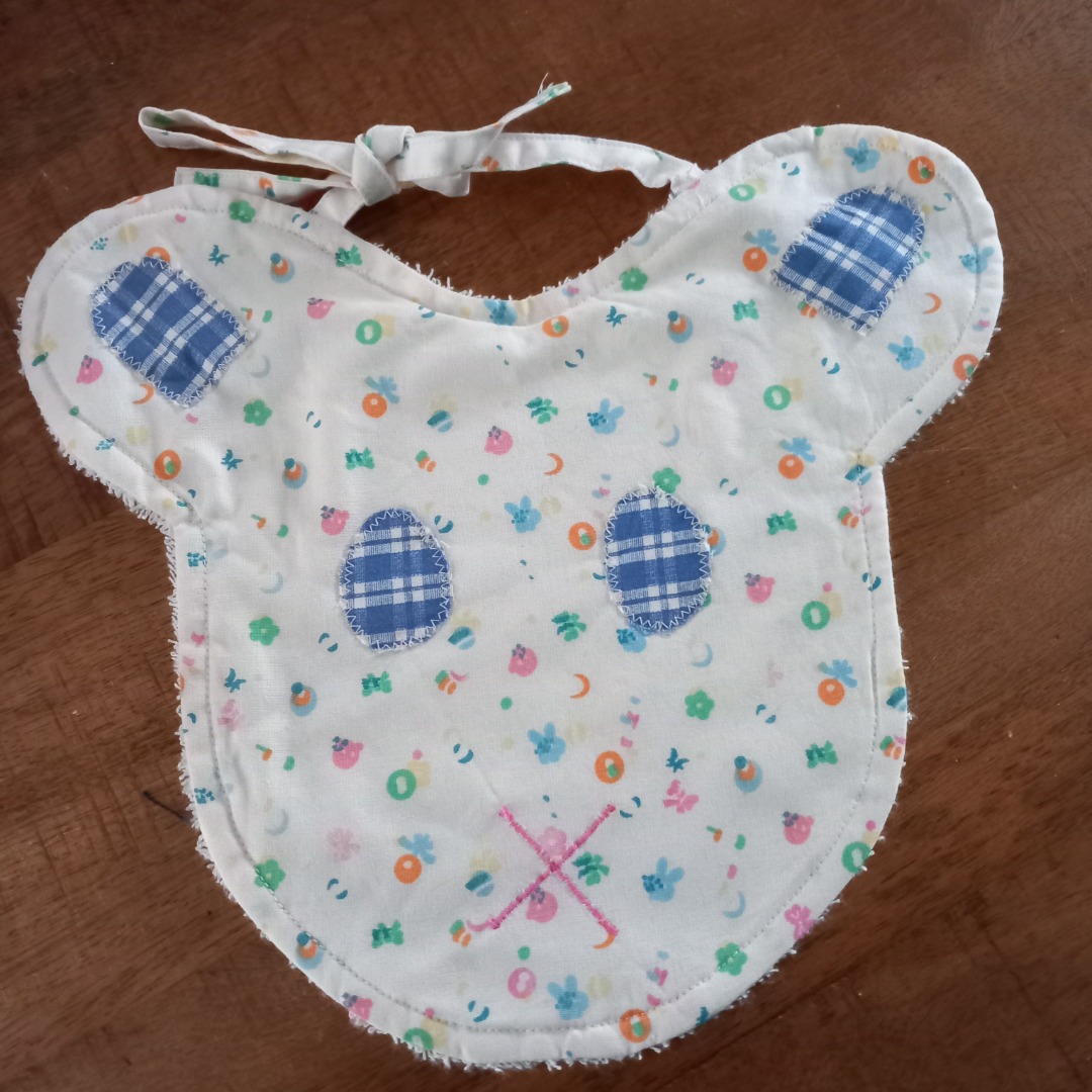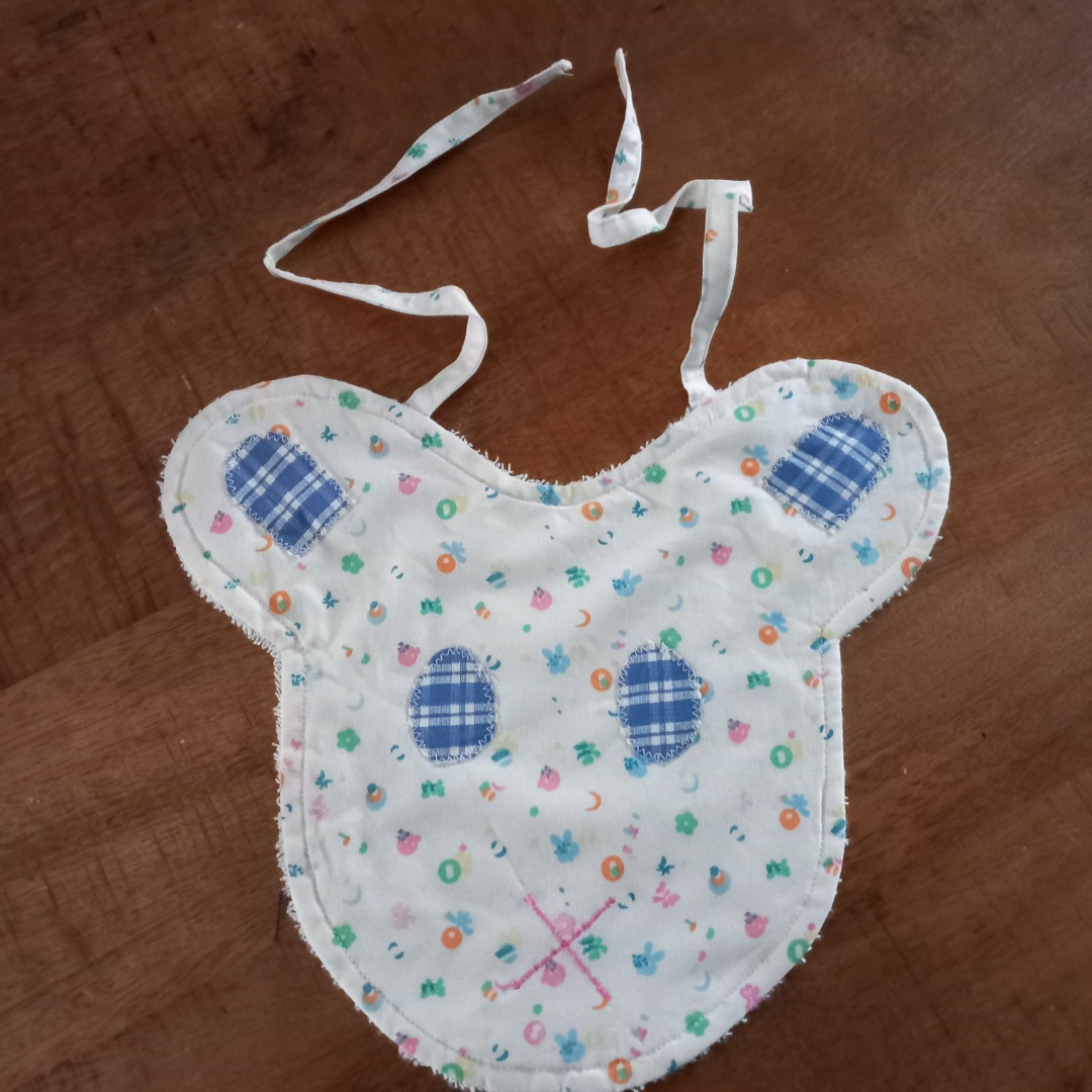 Slabbetje met aan de voorkant katoenen stof en aan de achterkant witte badstof. Het slabbetje heeft de vorm van een berehoofd. De hoogte is 20 cm gemeten vanuit het midden.