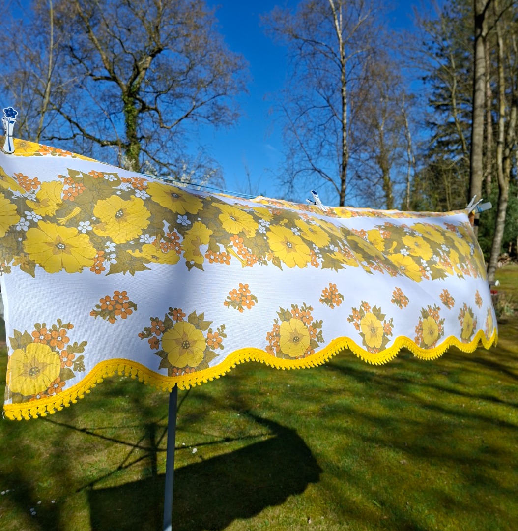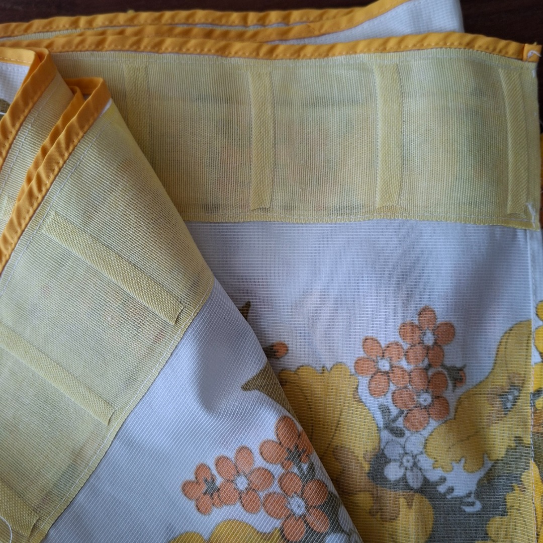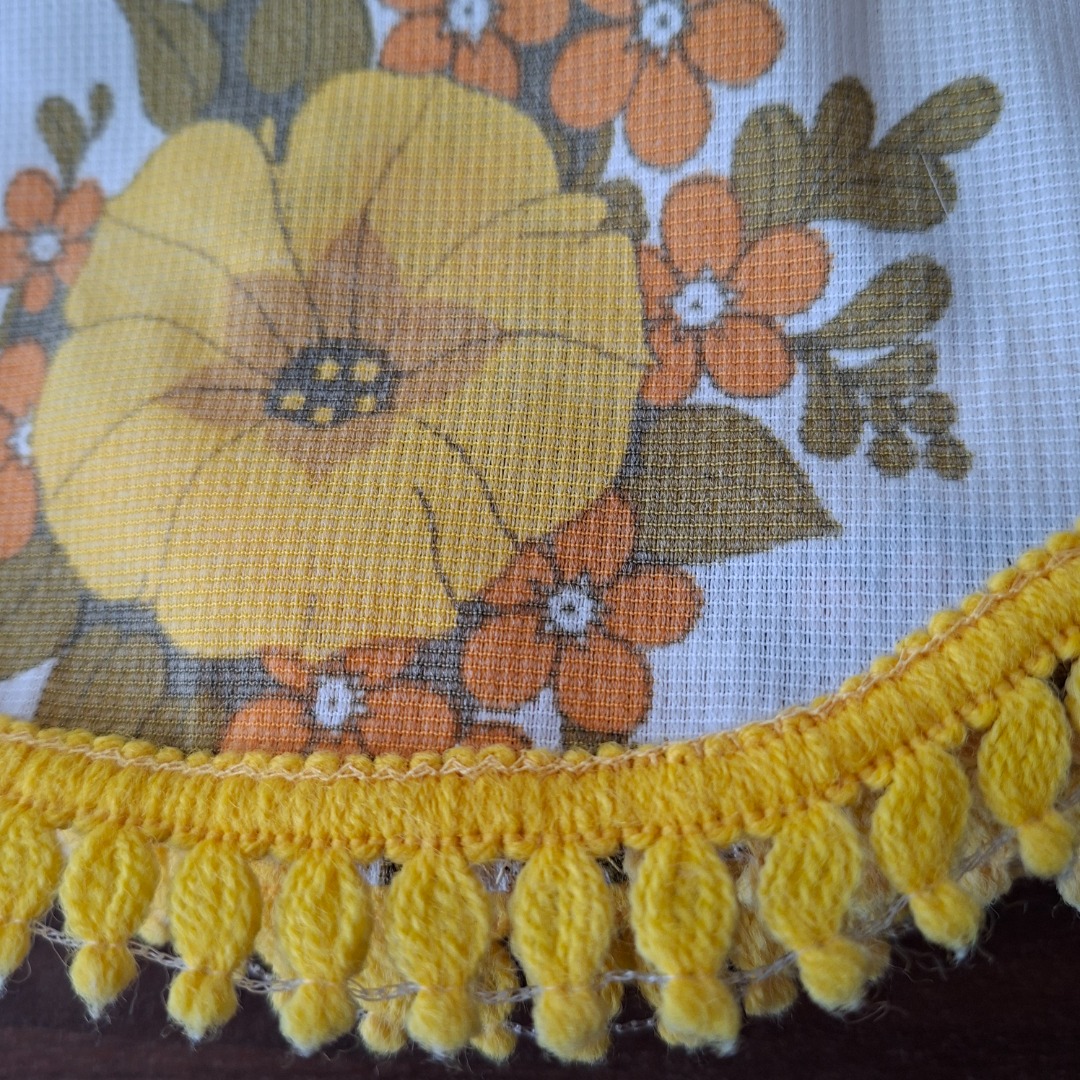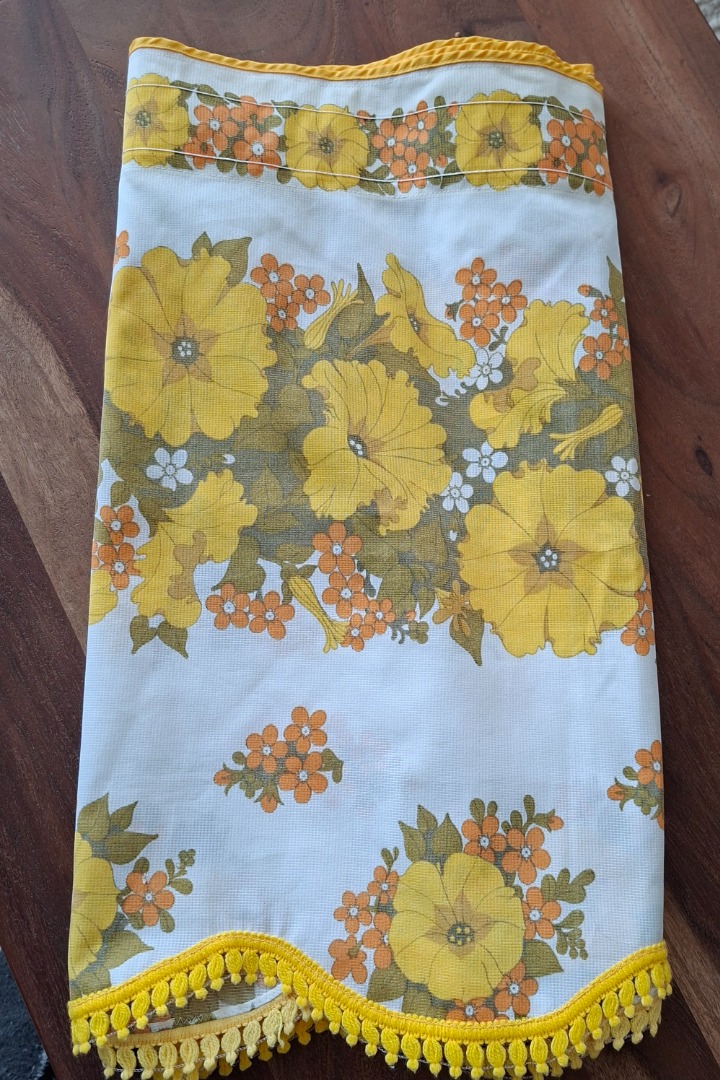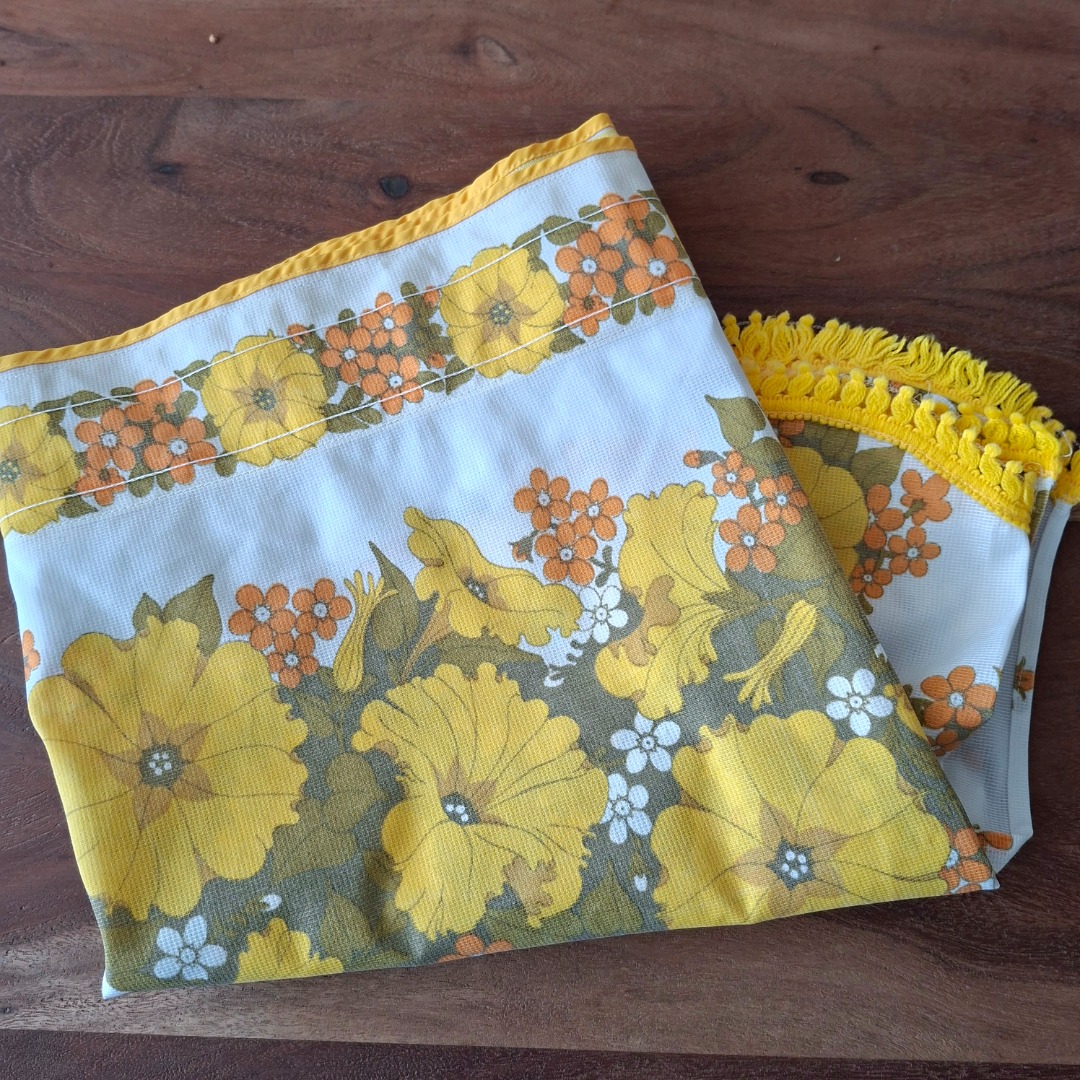 Jaren 70 gordijn in een gele en oranje kleur met bloemen en een gele franje onderaan. Het kan met een gordijnstang of met gordijnhaken opgehangen worden. De maat is 55 cm hoog en de breedte is 2,38