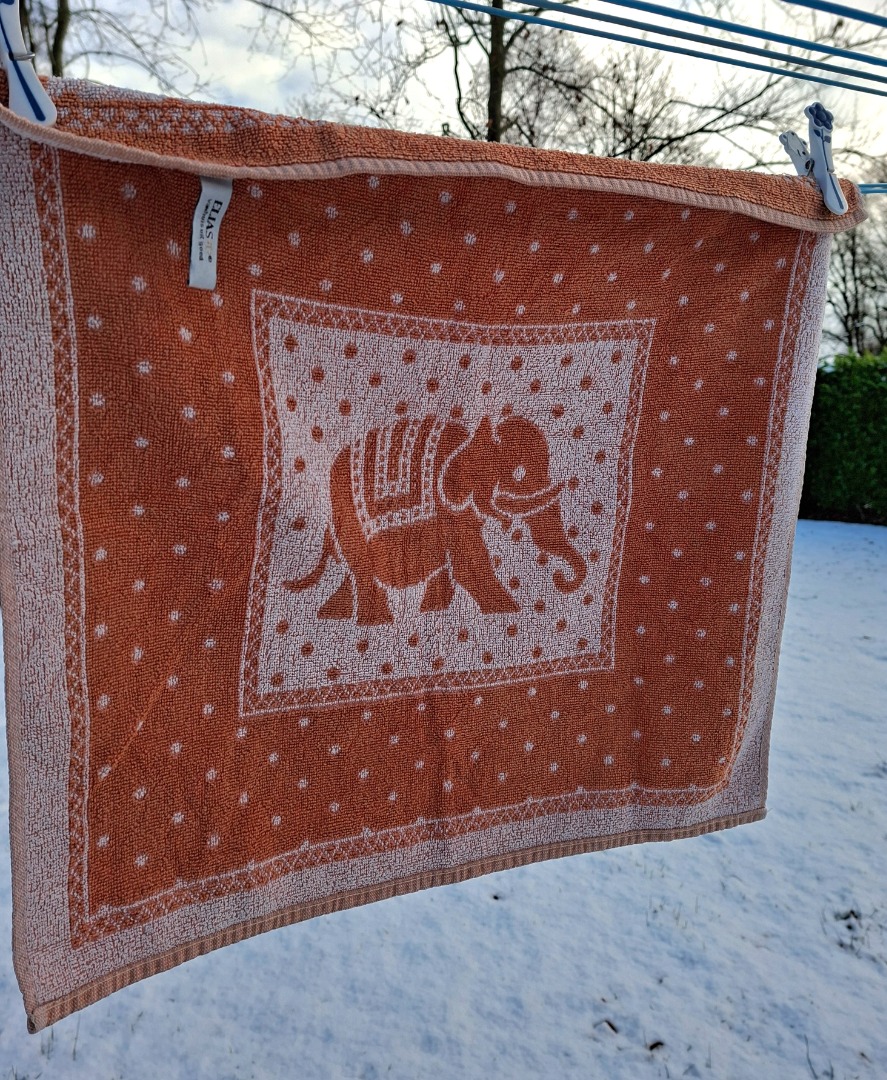 Keukenhanddoek die gebruikt is in een lichtbruine kleur met de afbeelding van een olifant. De breedte is 56 cm en de hoogte is 52 cm. Het is van het merk Elias.