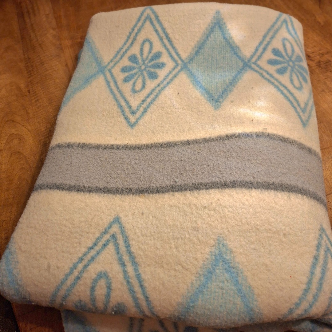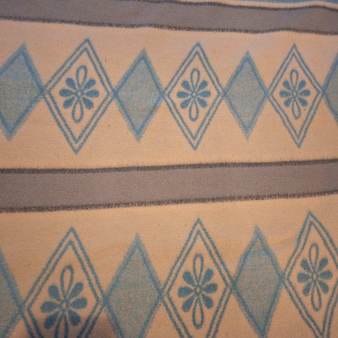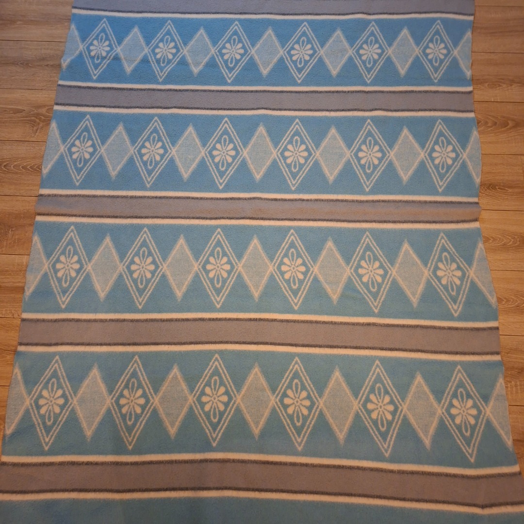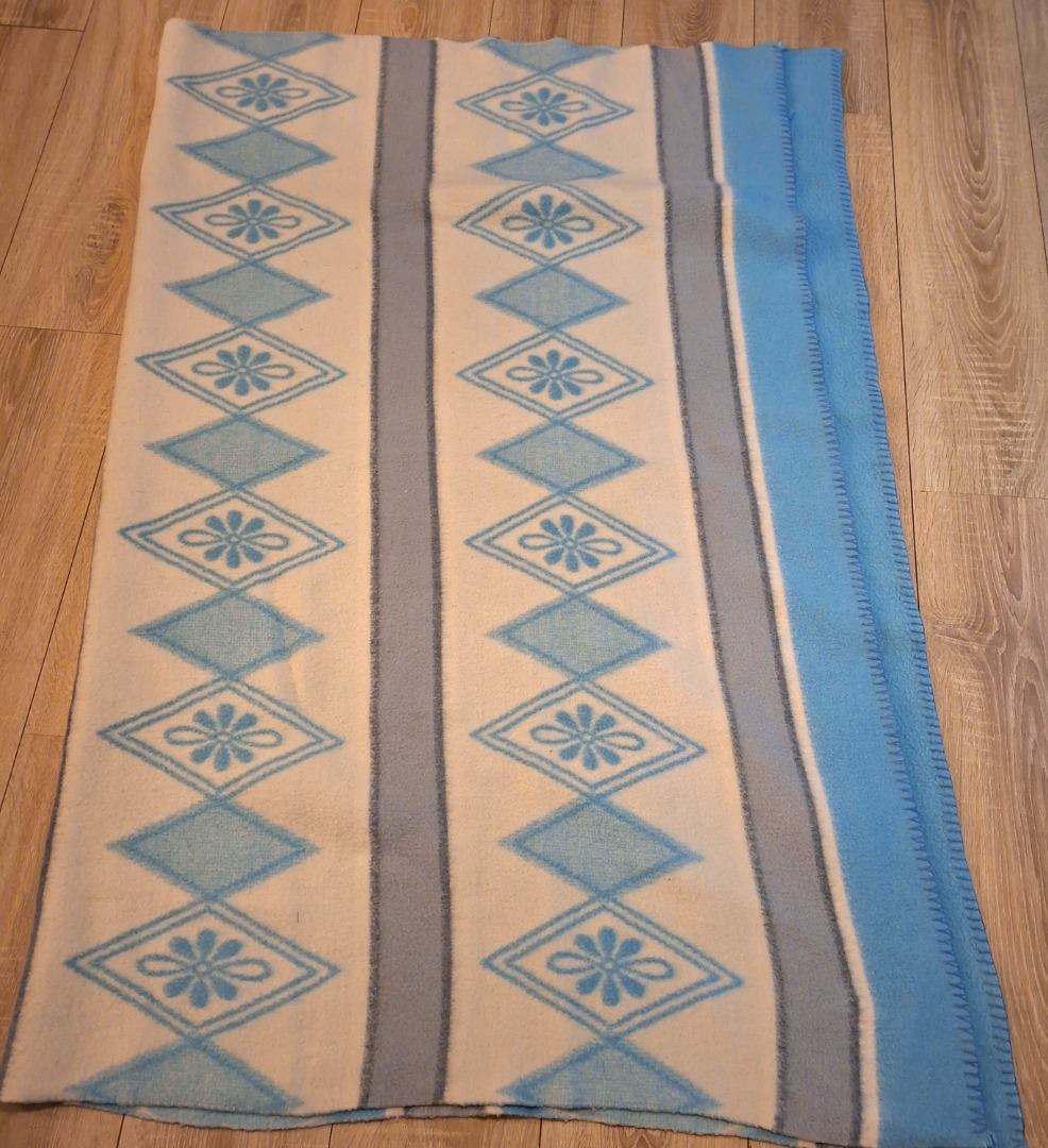Deze deze deken heeft een mooi patroon in een kleurstelling die je niet vaak ziet bij dekens, lichtblauw, wit en grijs. De afmeting is 1,40 x 1,87 meter.