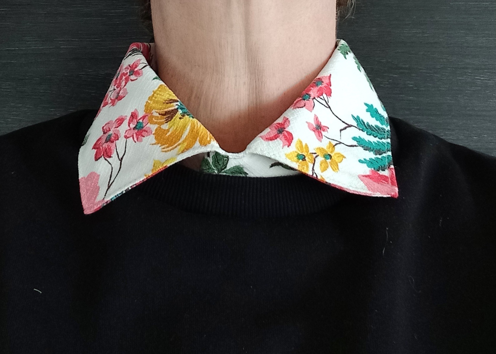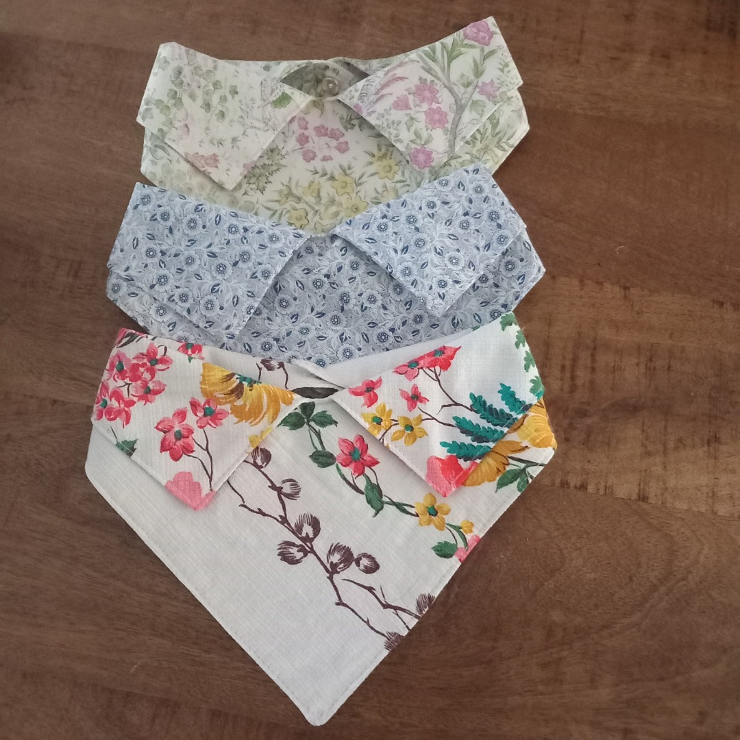Los kraagje voor onder een trui in een witte kleur met mooie felle bloemen. Het zit iets hoger dan een gewone kraag van een blouse. Afgewerkt met een knoopje achter. De kraag is 44 cm.