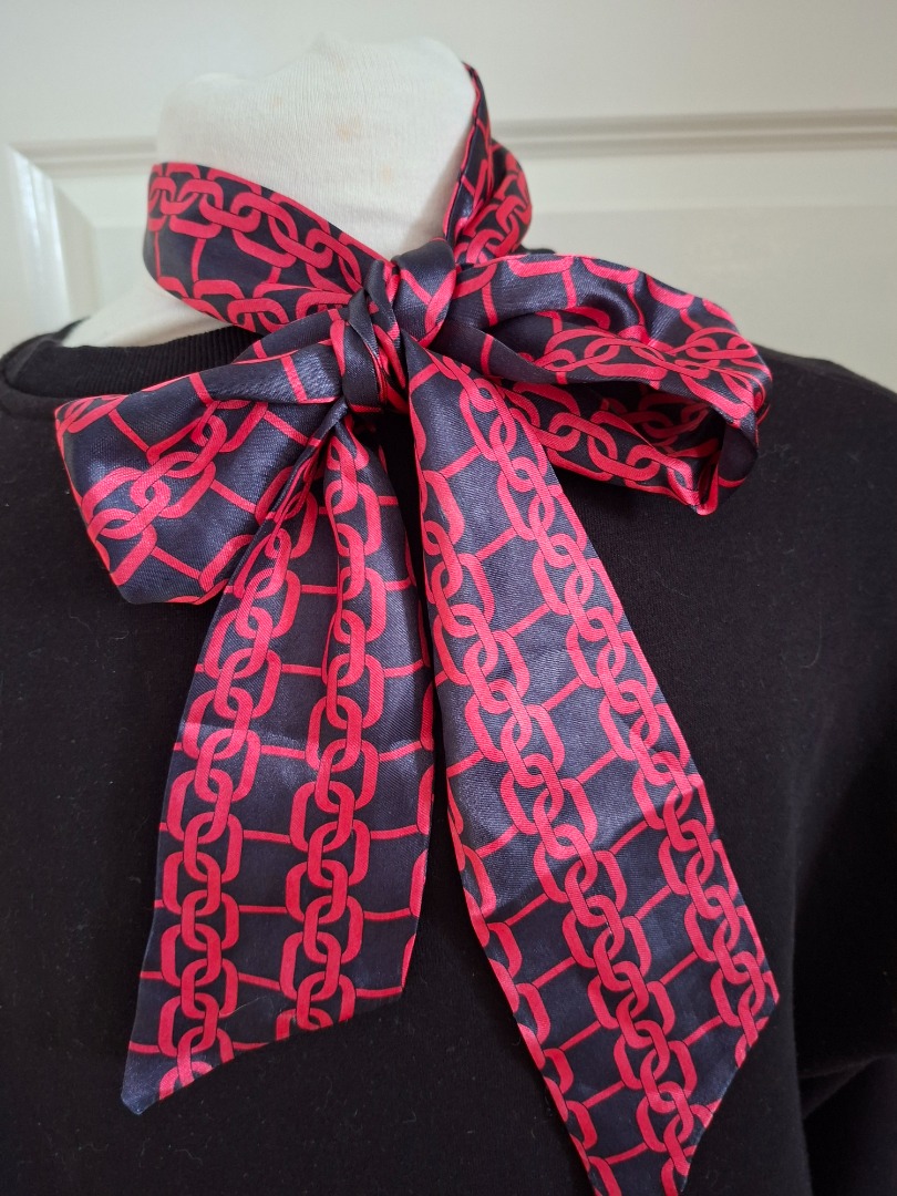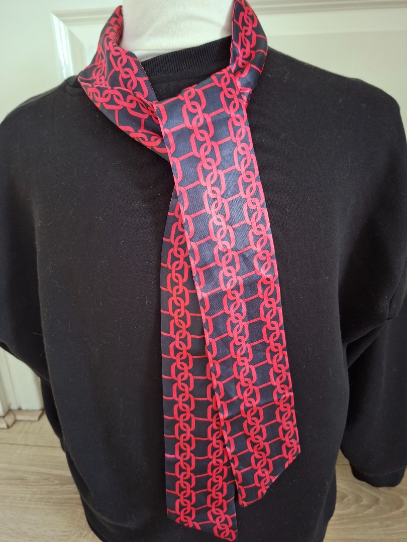 Smal dun sjaaltje van 8 cm. Het is zwart met rode afbeelding van schakels en het is 1,50 meter lang. Vroeger kreeg je deze bij het tijdschrift Viva. Nog nooit gebruikt.