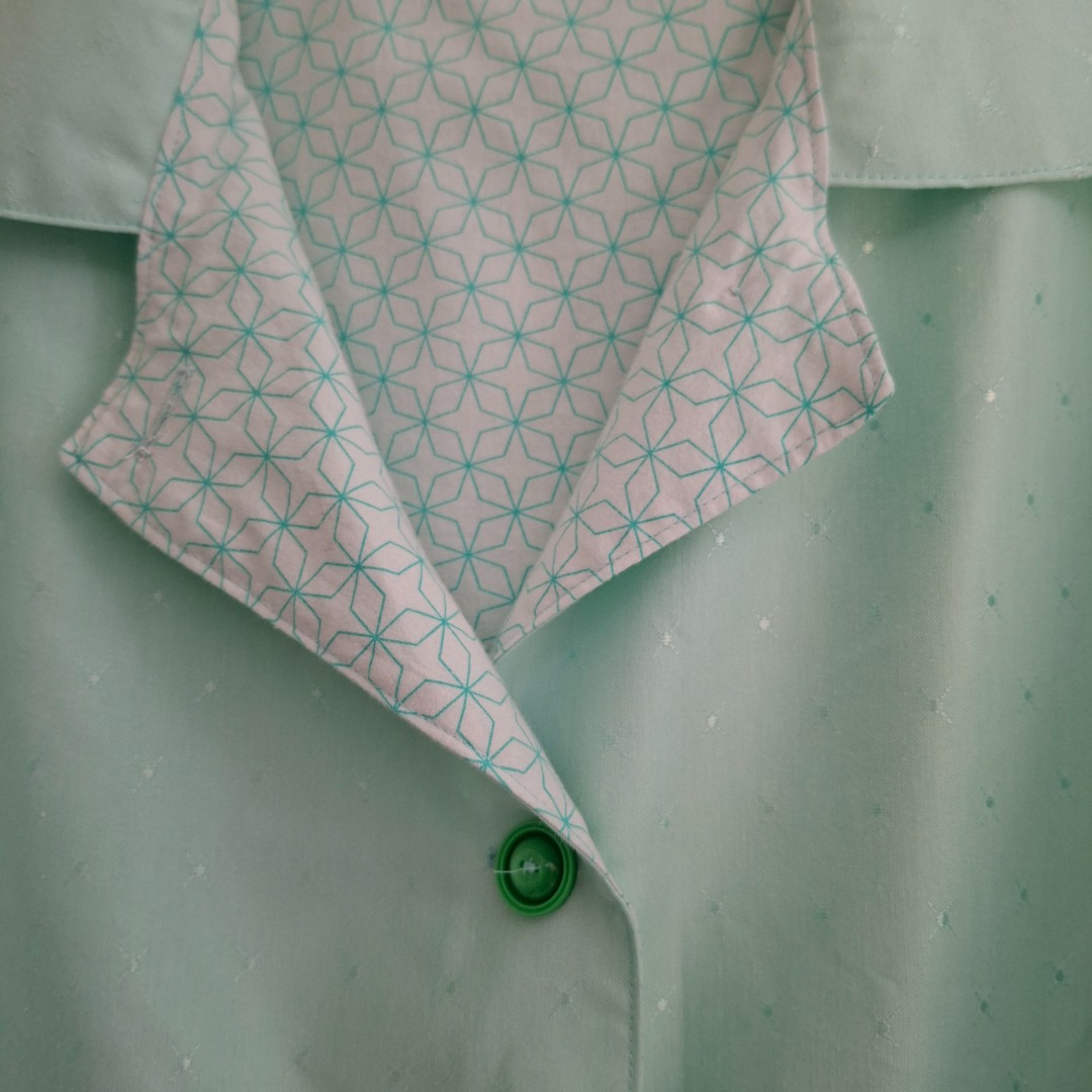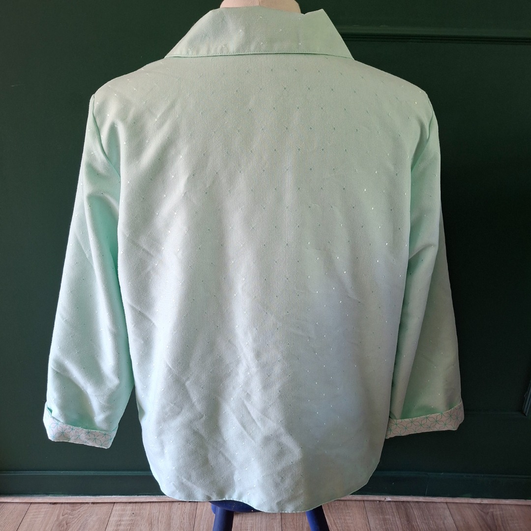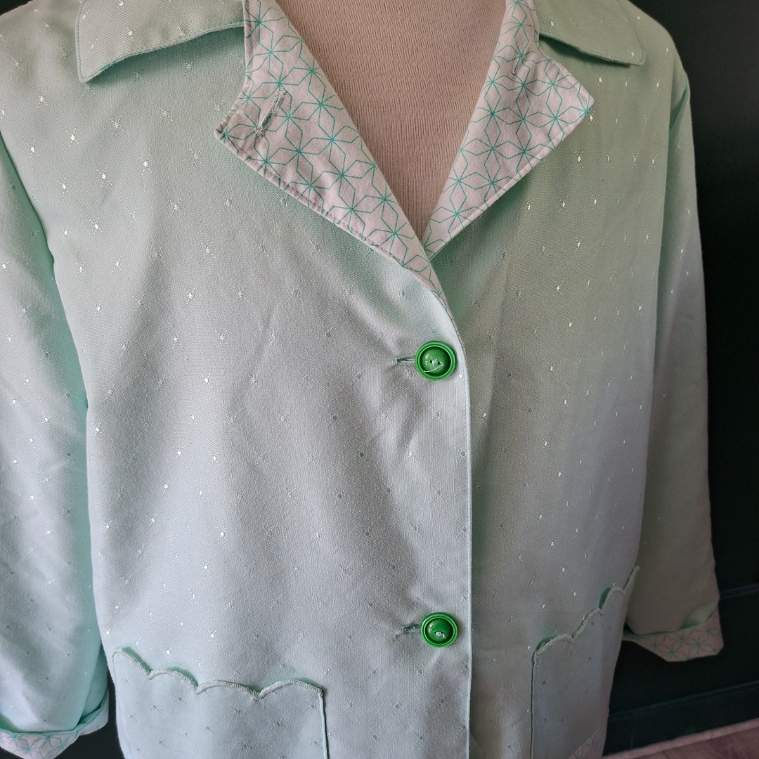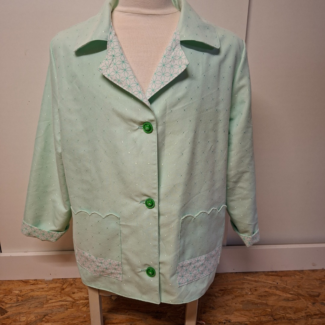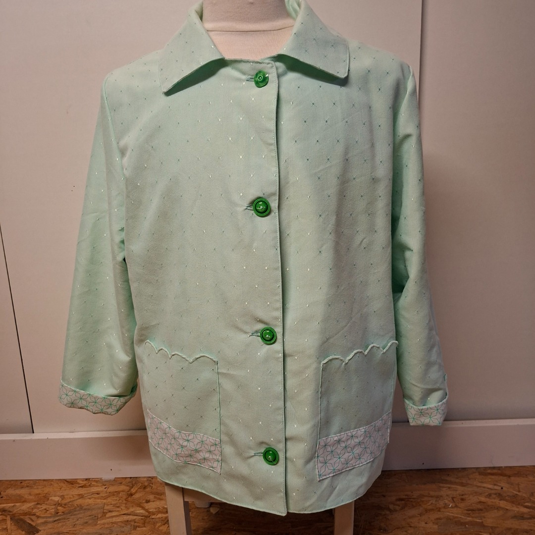 Zomerjas gemaakt van mintgroene stof en de binnenkant is wit met mintgroene patroon. Aan de voorkant zitten 2 zakken en 4 donkergroene knopen. Het is een recht model maat 42. De hoogte vanaf de schouders is 69 cm en de achterkant breedte is 61 cm.