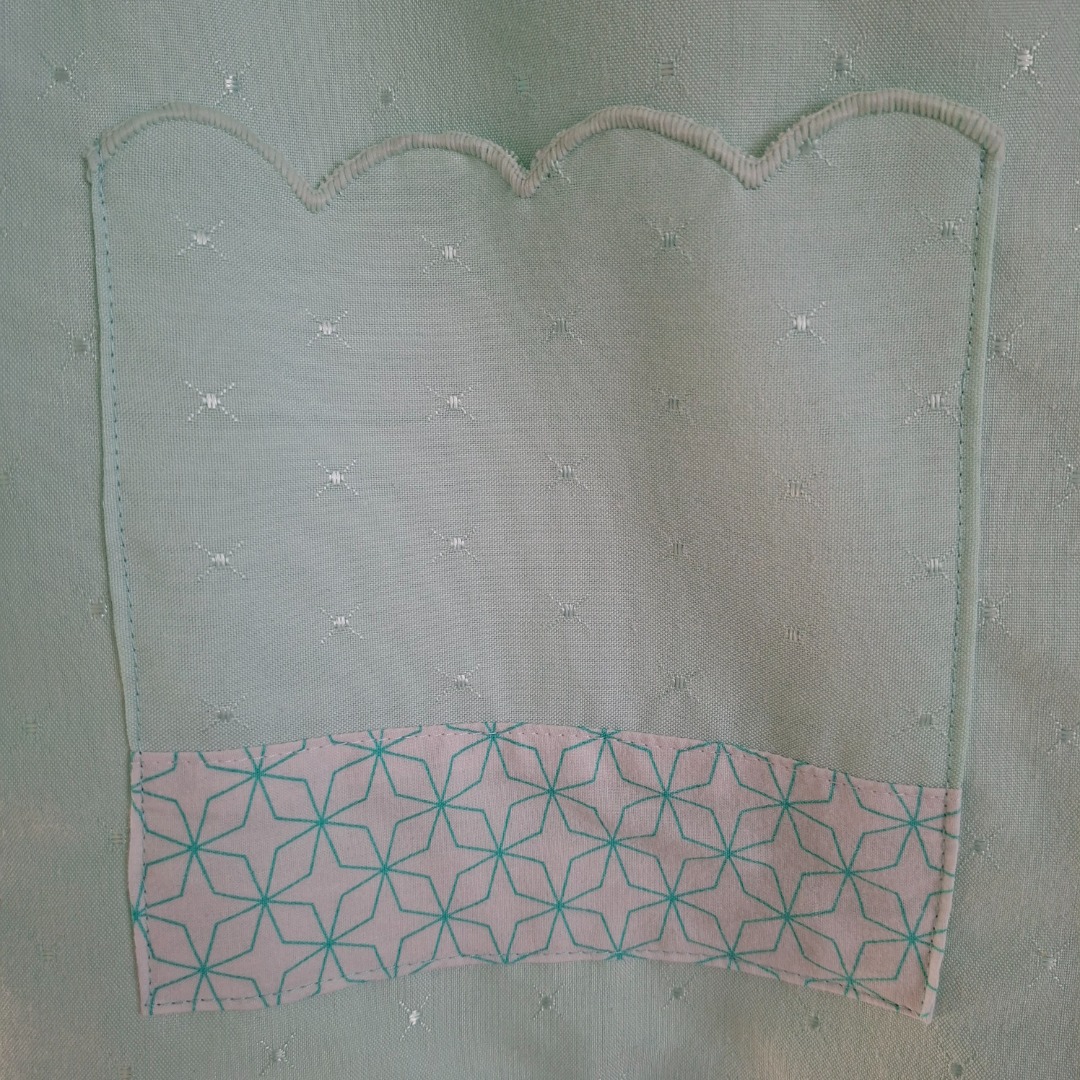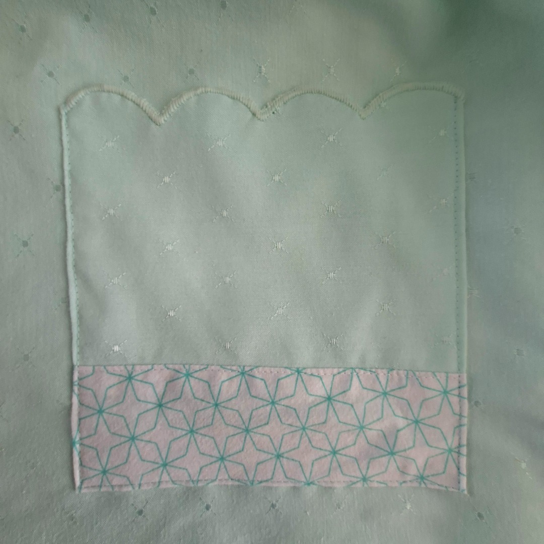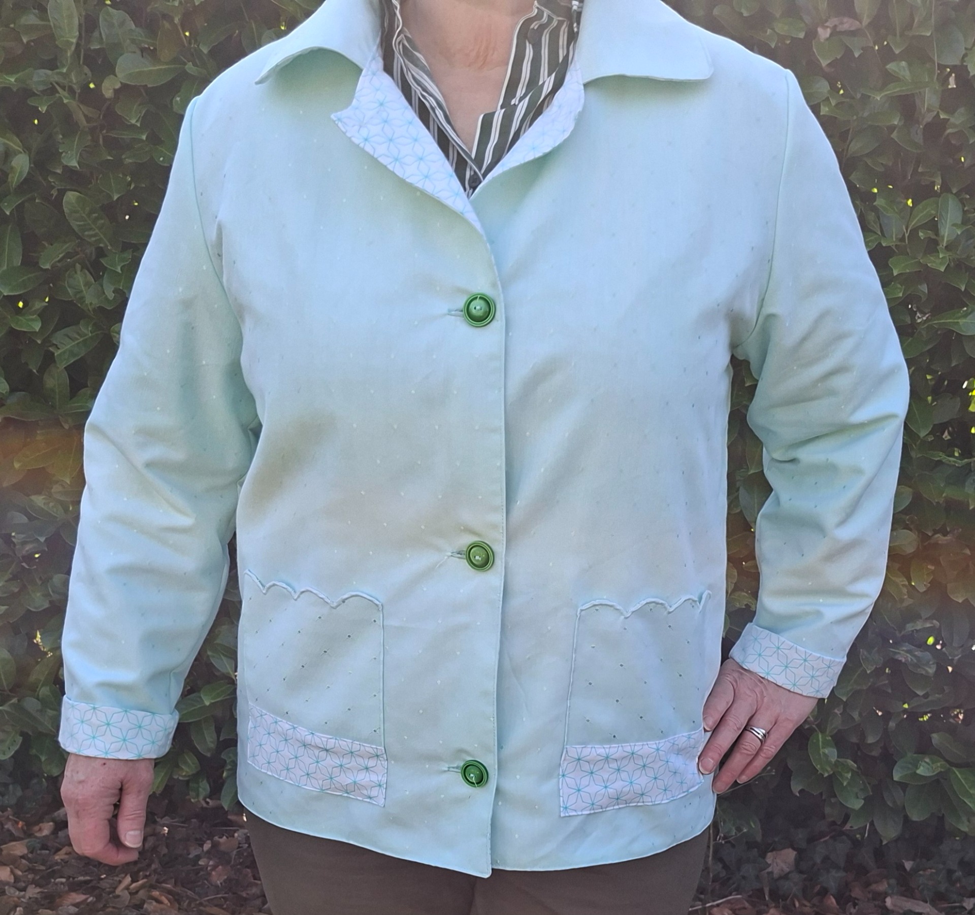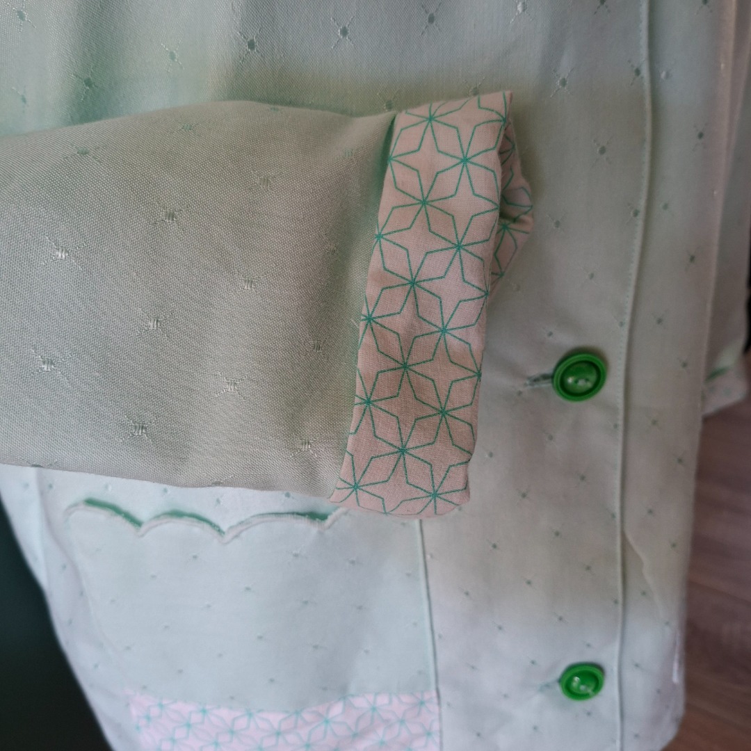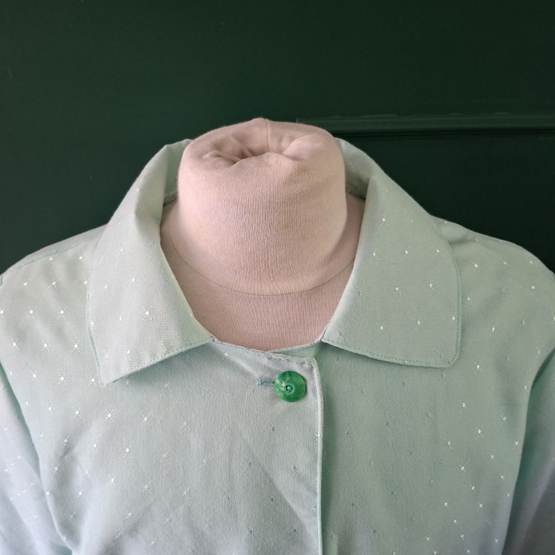 Zomerjas gemaakt van mintgroene stof en de binnenkant is wit met mintgroene patroon. Aan de voorkant zitten 2 zakken en 4 donkergroene knopen. Het is een recht model maat 42. De hoogte vanaf de schouders is 69 cm en de achterkant breedte is 61 cm.