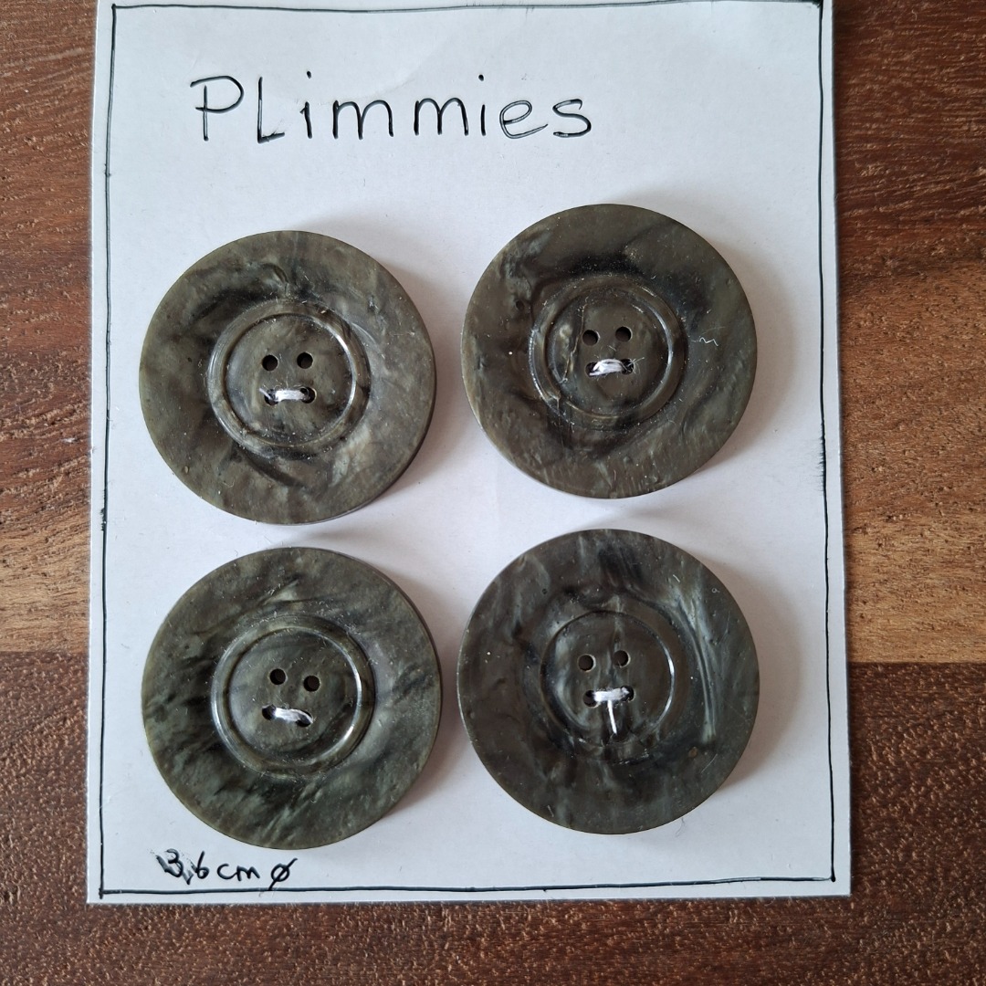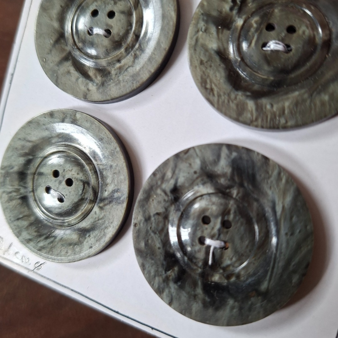 4 Grote knopen van 3,6 cm doorsnee.  Ze zijn donkergrijs met een marmer effect.