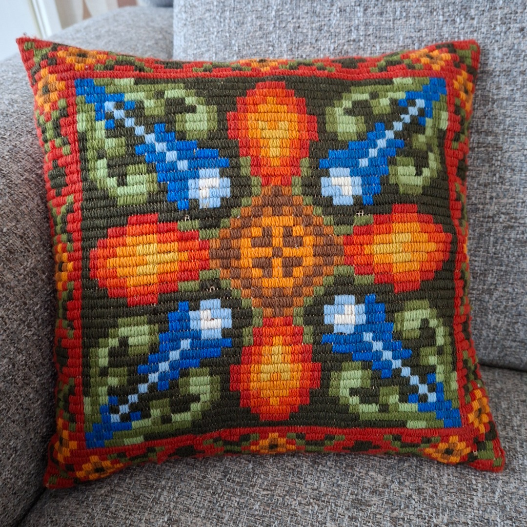 Geborduurde kussen in verschillende kleuren wat mooi bij elkaar staat. De afmeting is 37 x 35 cm.