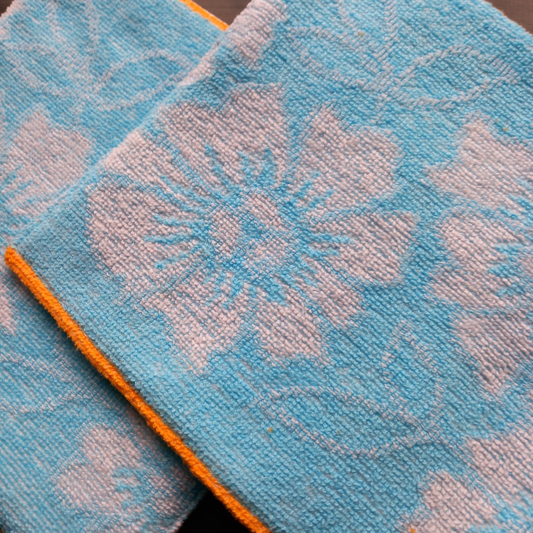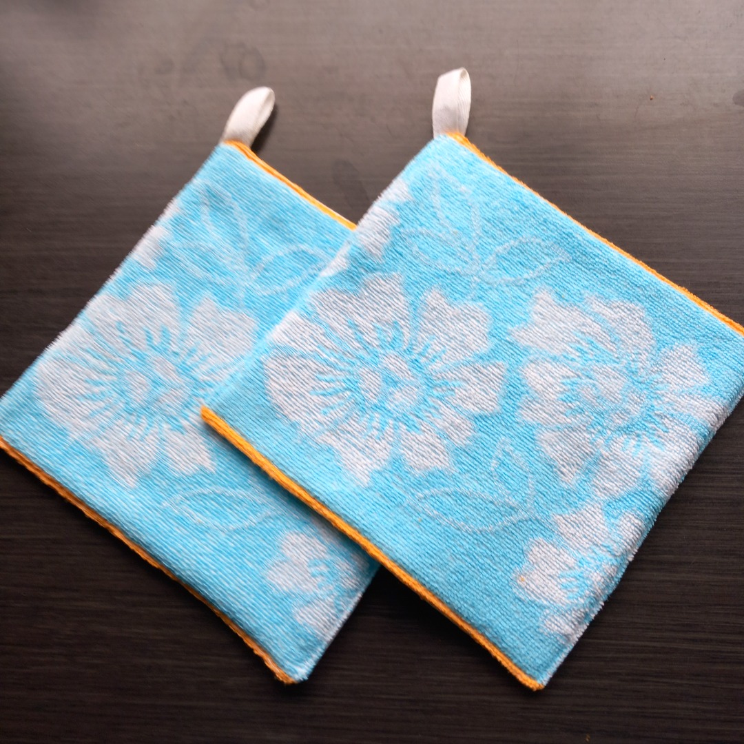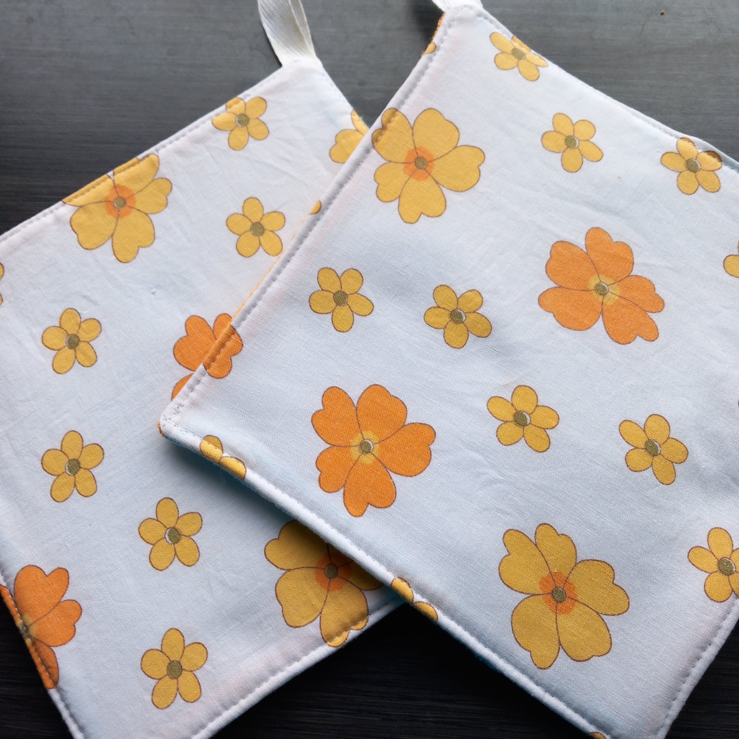Set van 2 pannenlappen gemaakt van een vintage handdoek met een oranje streep aan de zijkant en de achterkant van katoenen vintage stof. De afmeting is ongeveer 20 x 20 cm.