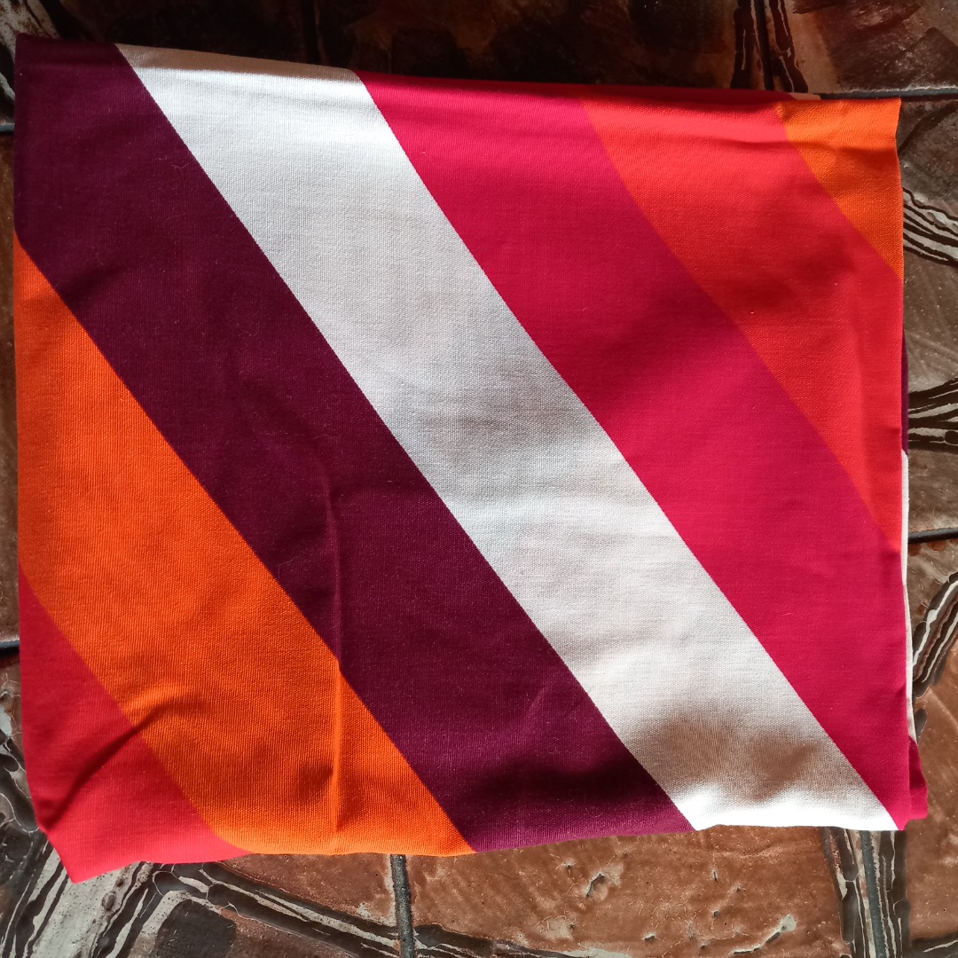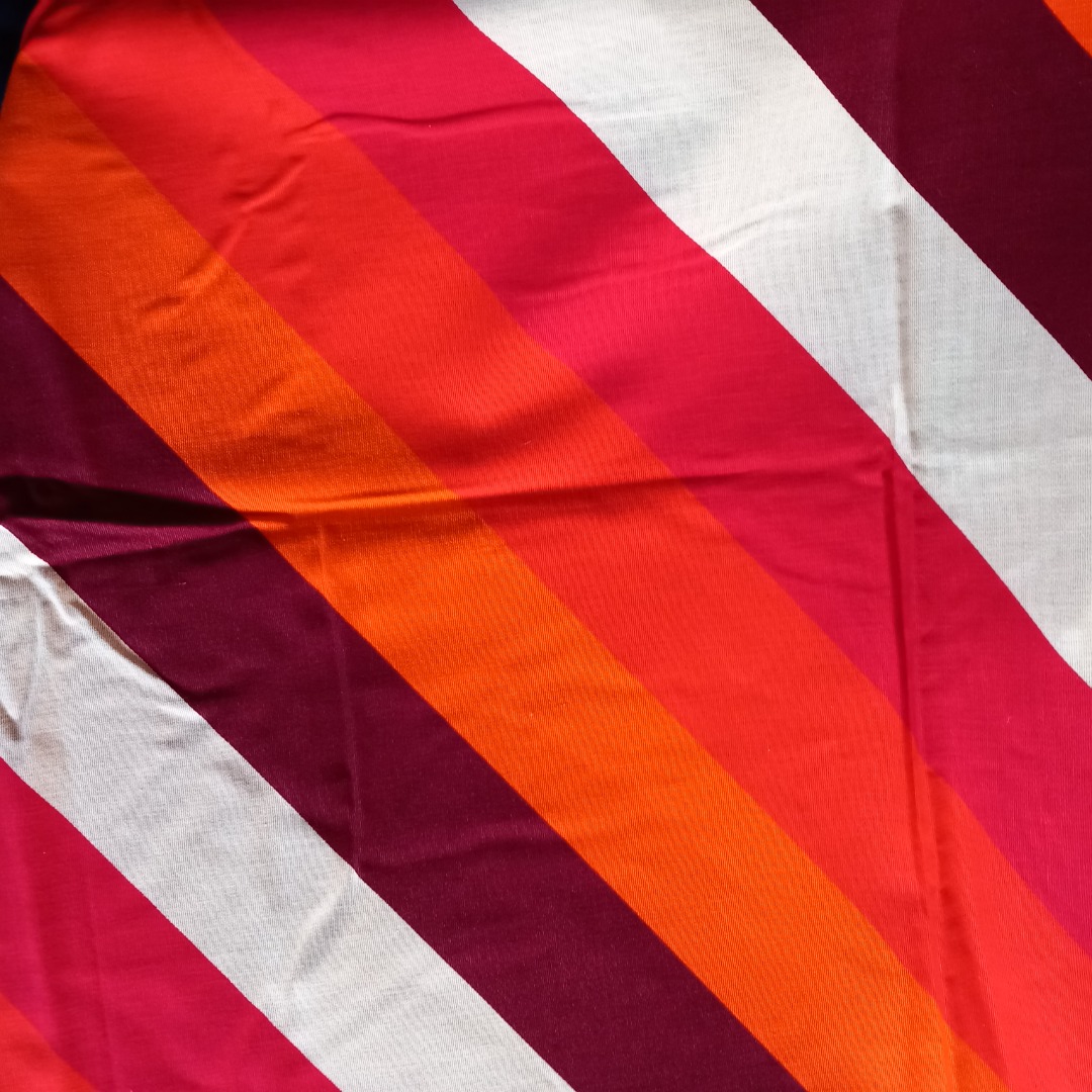 Katoenen tafelkleed in de kleuren oranje, rood, donkerrood en off White. De breedte is 1,20 meter en de lengte is 1,43 meter.