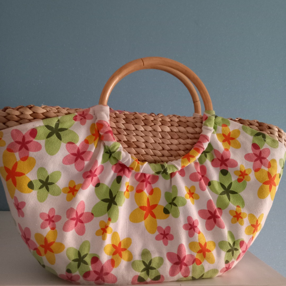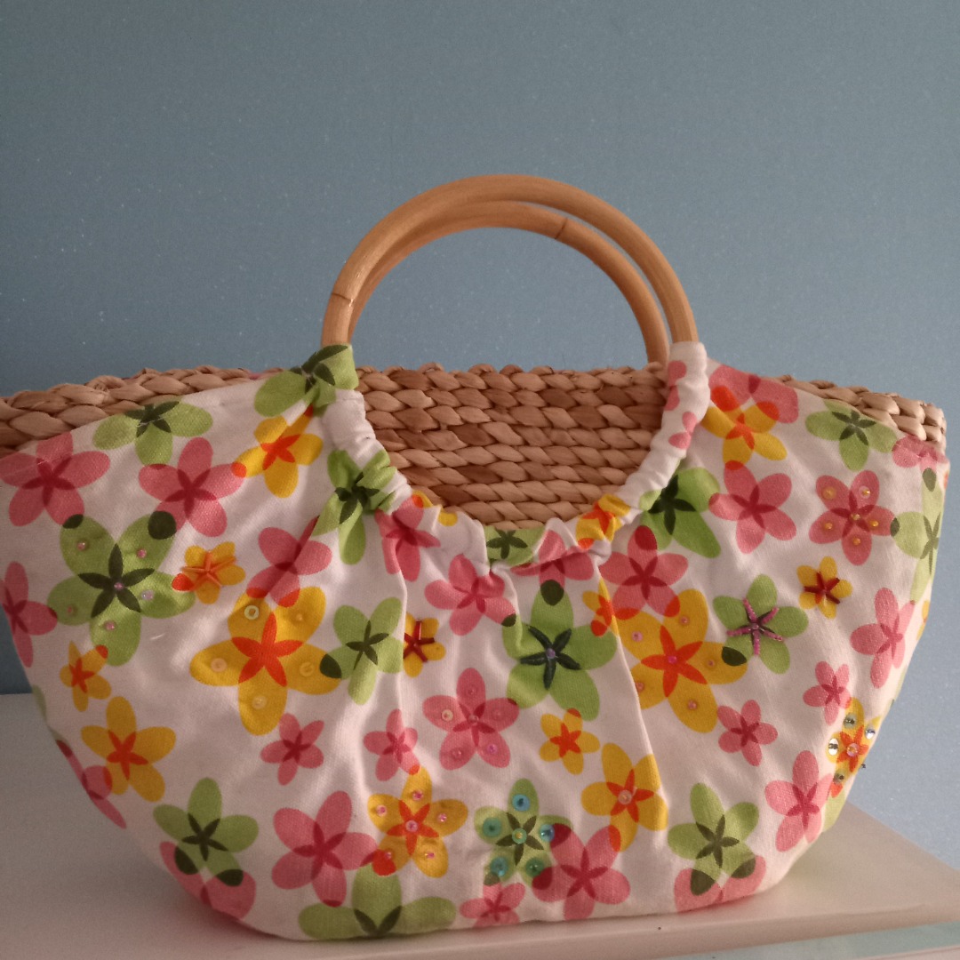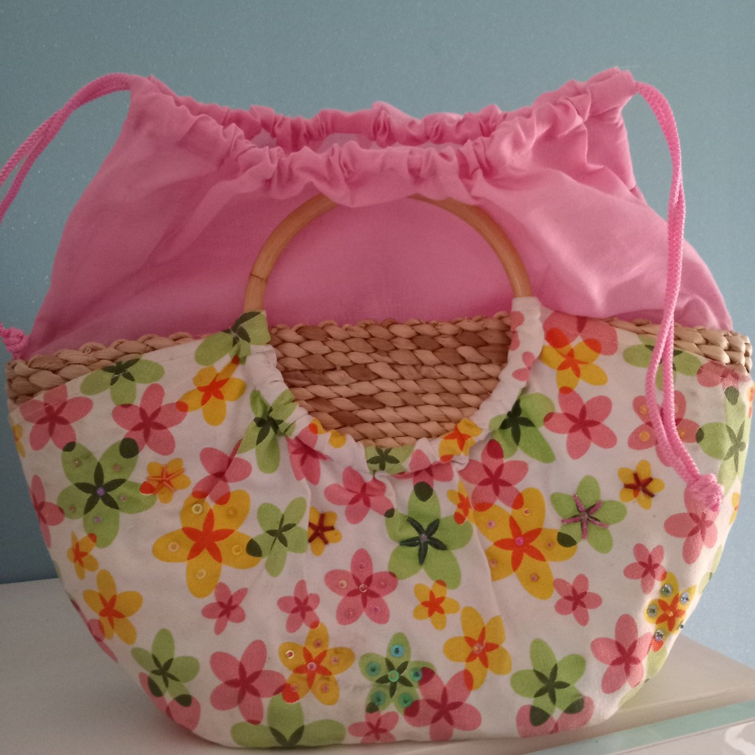 Klein rieten tas met witte stof en gekleurde bloemen en aan de voorkant wat kraaltjes. De binnenkant heeft een roze stof en met koord zodat je deze dicht kan doen. Er zitten een paar lichte vlekjes op het stof maar is niet storend. De breedte is 40 cm aan de bovenkant en onderkant is 25 cm. De hoogte is 22 cm zonder handvat.